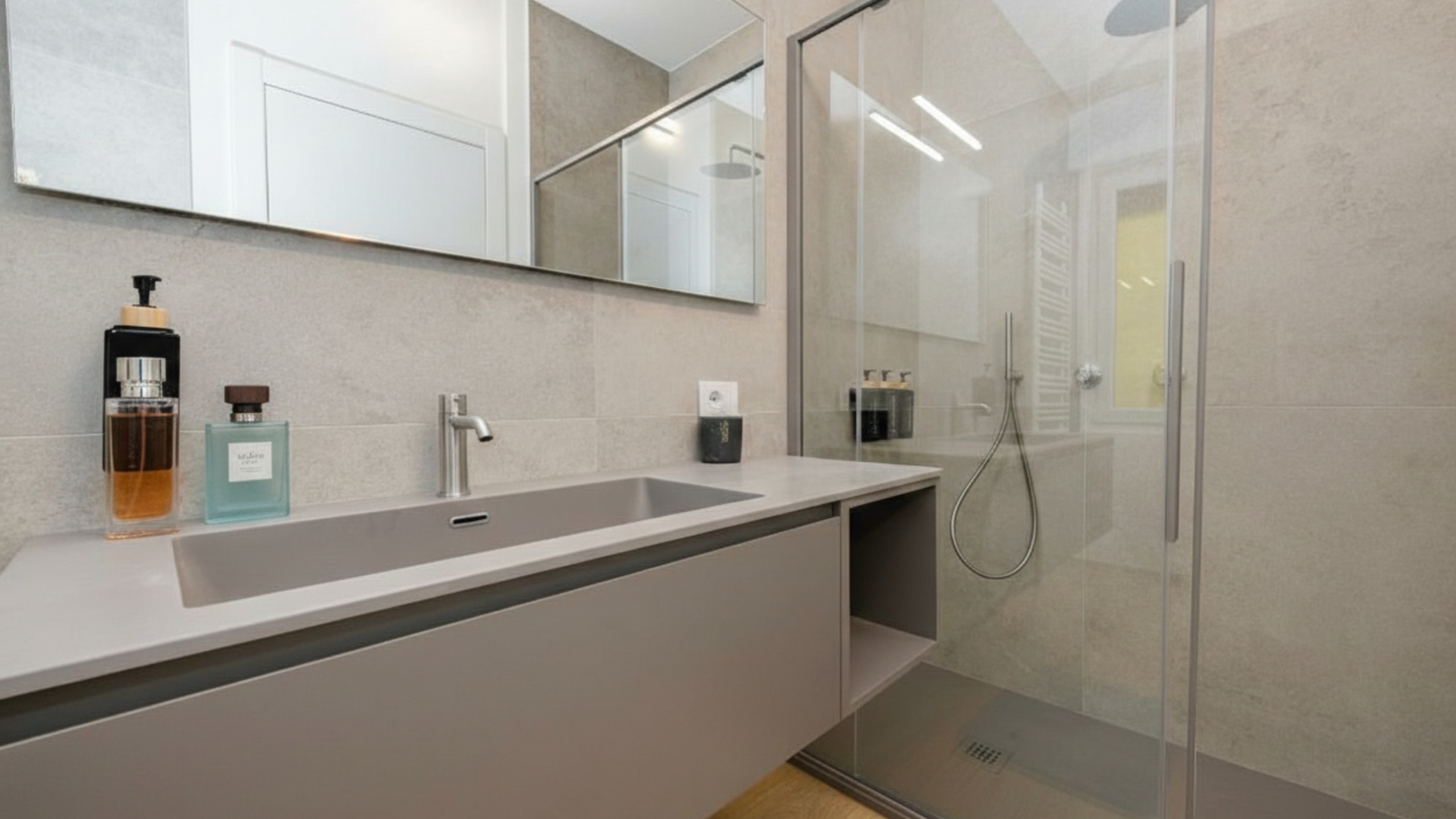 I tre bagni completi, moderni e funzionali, sono arredati con gusto essenziale e dotati di comode docce walk-in. Lavatrice e asciugatrice sono a disposizione per rendere ogni soggiorno ancora più pratico, soprattutto per soggiorni prolungati, famiglie numerose o gruppi di amici. La cucina a induzione, moderna e completamente accessoriata, offre tutto il necessario per sentirsi davvero a casa e vivere ogni pasto come un momento di condivisione.