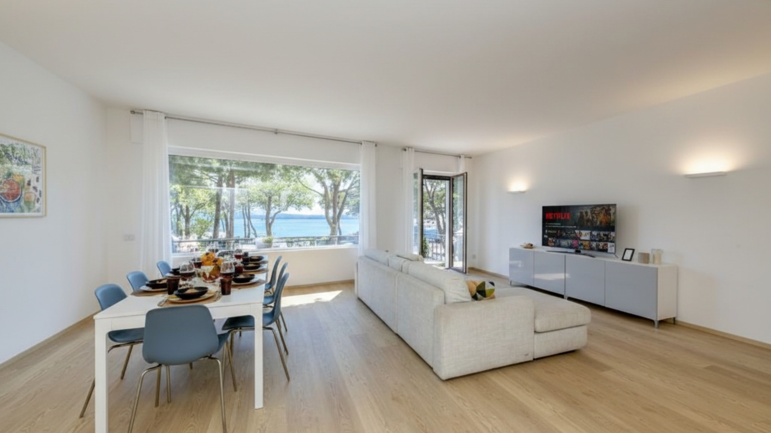 Appena varcata la soglia, si è accolti da un’atmosfera luminosa e rilassante: l’ampio open space unisce con armonia la cucina americana, la zona pranzo e il soggiorno, arricchito da un grande divano angolare che si trasforma all’occorrenza in un comodo letto matrimoniale. Una vetrata scenografica incornicia la vista sul lago e lascia entrare la luce del mattino, mentre il balcone fronte lago permette di immergersi nella vitalità del centro e godersi la vita che scorre.