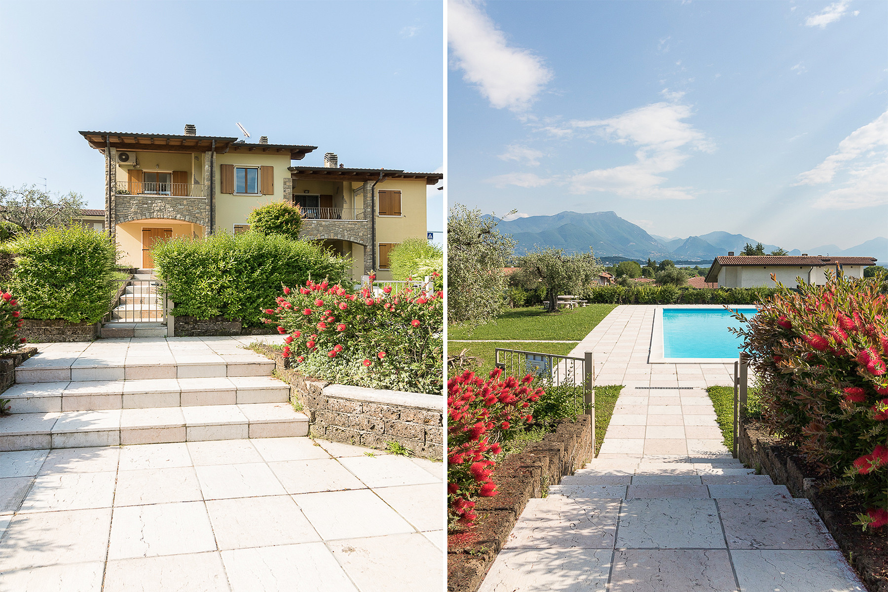 L’appartamento comprende una camera matrimoniale, una camera con due letti singoli, un bagno con vasca e doccia incorporata, un ampio soggiorno con tavolo da pranzo e cucina a vista e un ampio balcone coperto con una vista spettacolare sul lago di Garda.