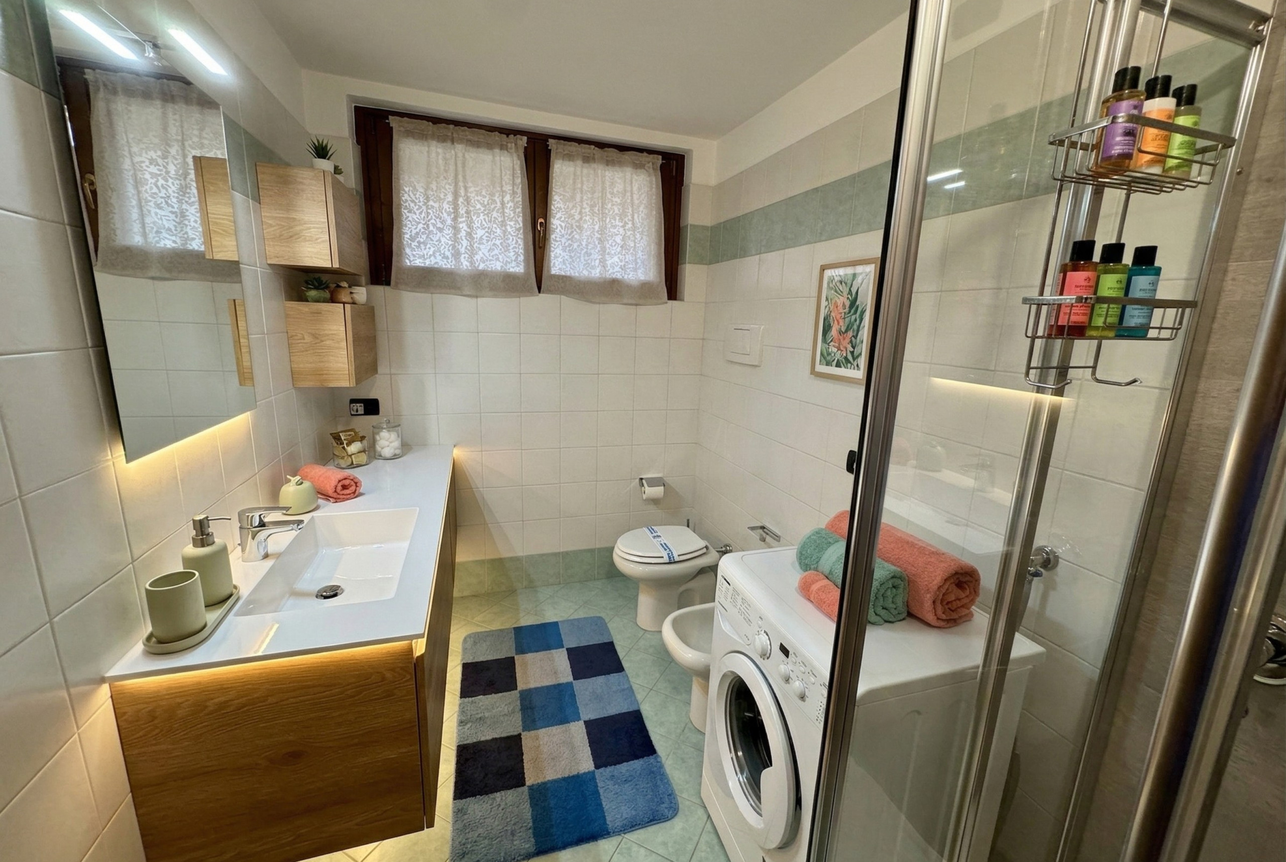 Gli ambienti sono pensati per offrire praticità, comfort e convivialità. La zona giorno è luminosa e funzionale, dotata di smart TV e di un comodo divano letto matrimoniale che permette di accogliere ulteriori due ospiti. La cucina è indipendente e completamente attrezzata, perfetta per preparare colazioni, pranzi e cene in totale autonomia durante il soggiorno. La zona giorno è climatizzata e l’impianto è ampiamente sufficiente per garantire una temperatura piacevole e confortevole in tutto l’appartamento anche durante i mesi più caldi.