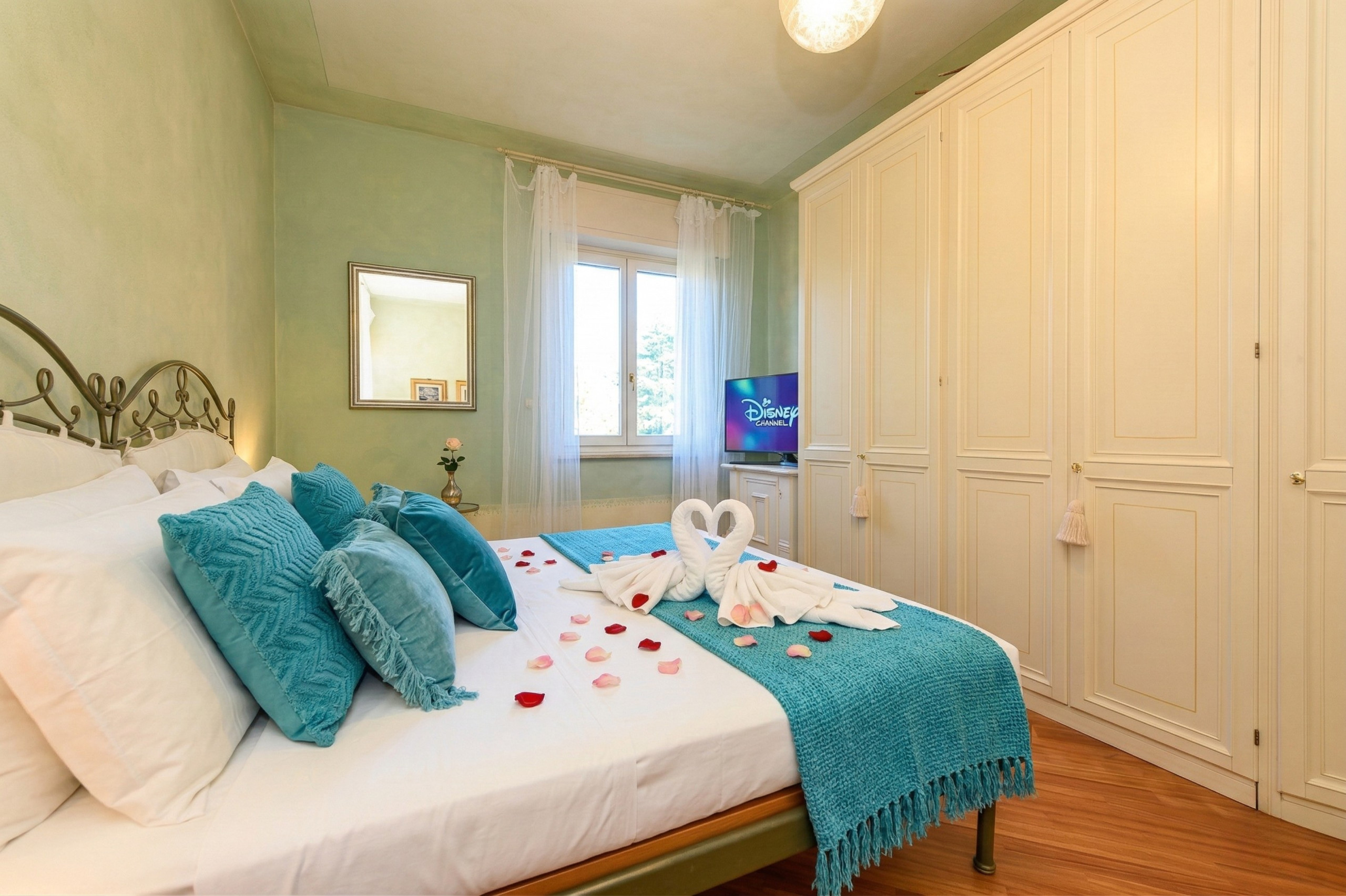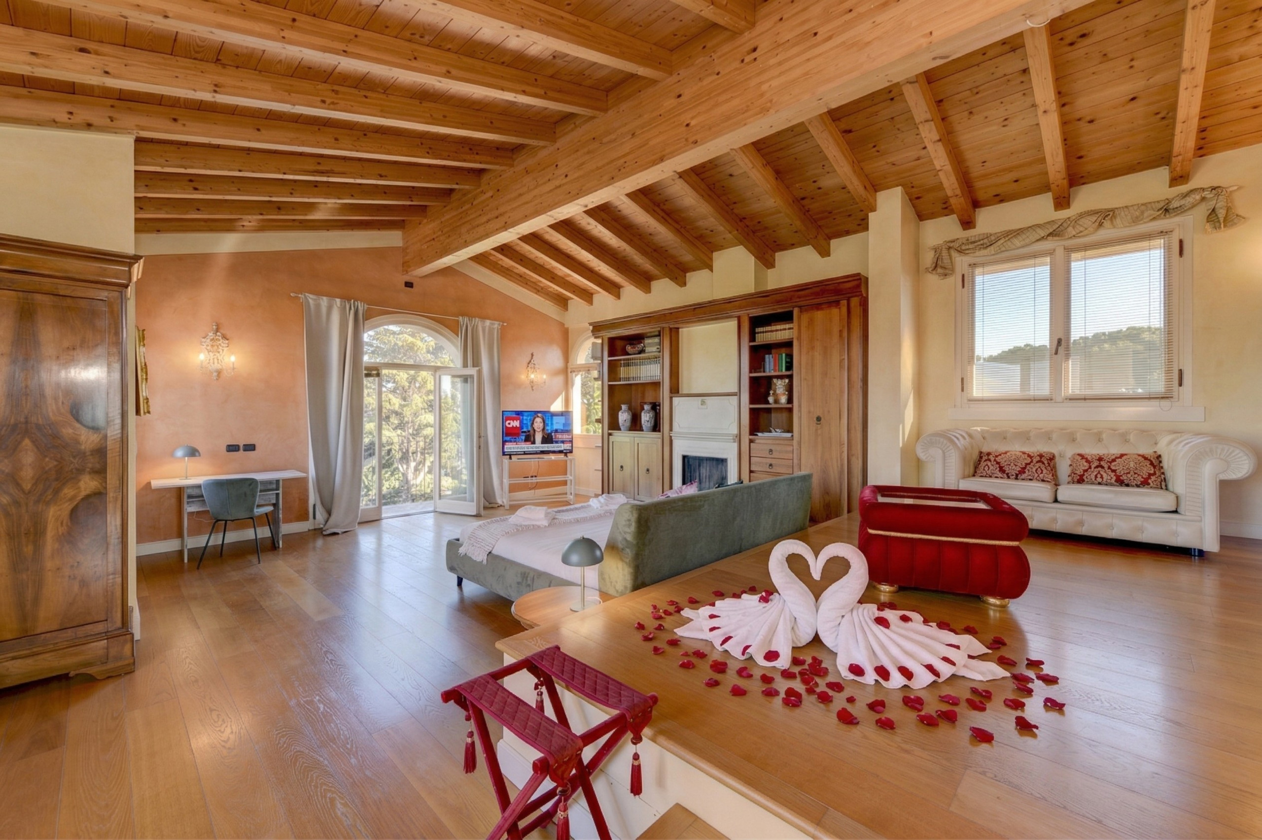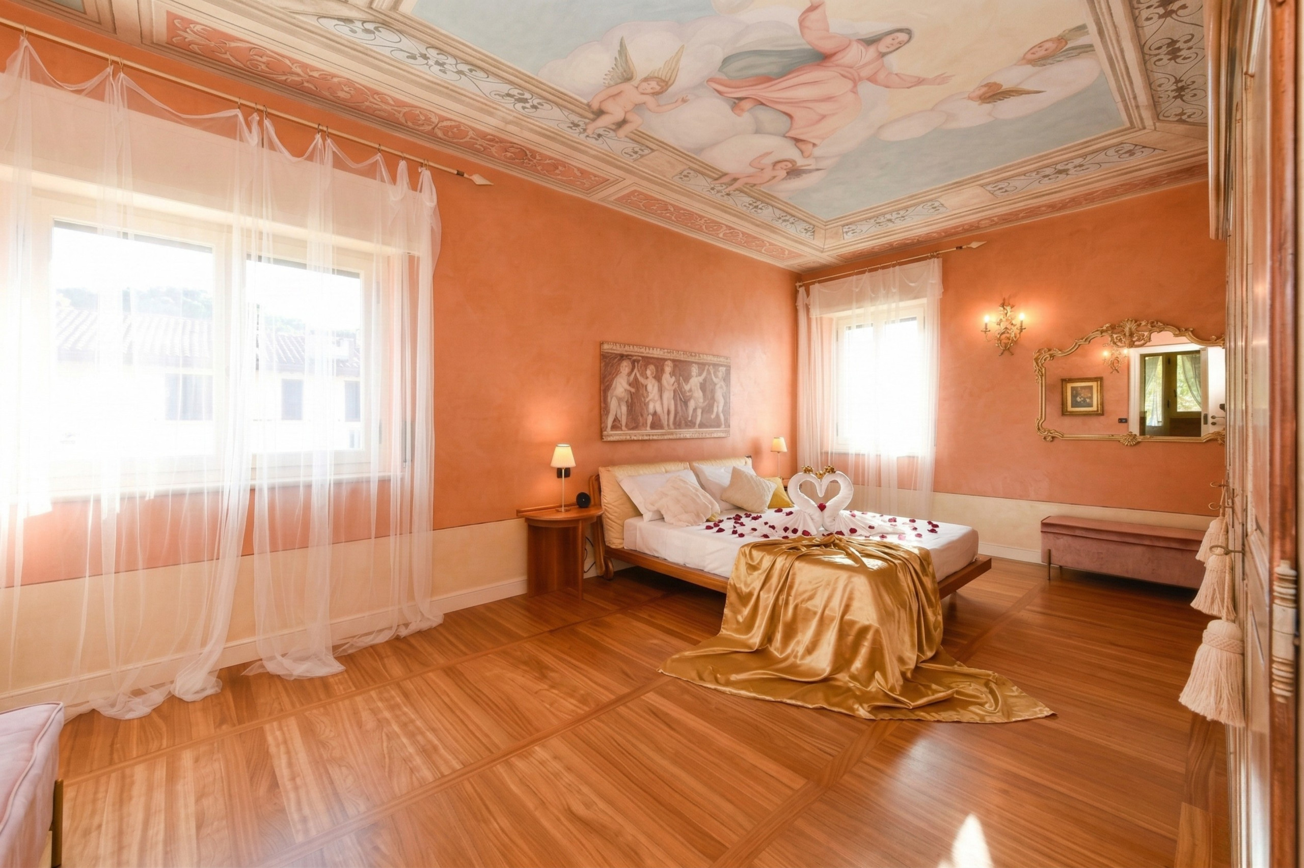 La camera padronale è il cuore elegante del piano: un raffinato affresco a soffitto incornicia il letto matrimoniale e crea un’atmosfera unica coniugando charme classico e comfort contemporaneo, mentre il bagno privato, ampio e perfettamente attrezzato, offre doppio lavabo, doccia walk-in e una splendida vasca da bagno ideale per concedersi un momento di benessere dopo una giornata trascorsa tra borghi, spiagge e paesaggi del Garda. Dal bagno si accede inoltre ad un poggiolo esterno, perfetto per un caffè al mattino o per godersi il silenzio delle ore serali.