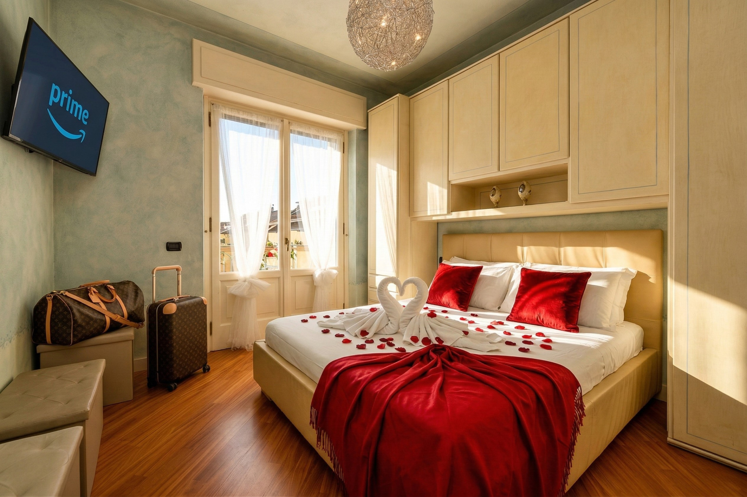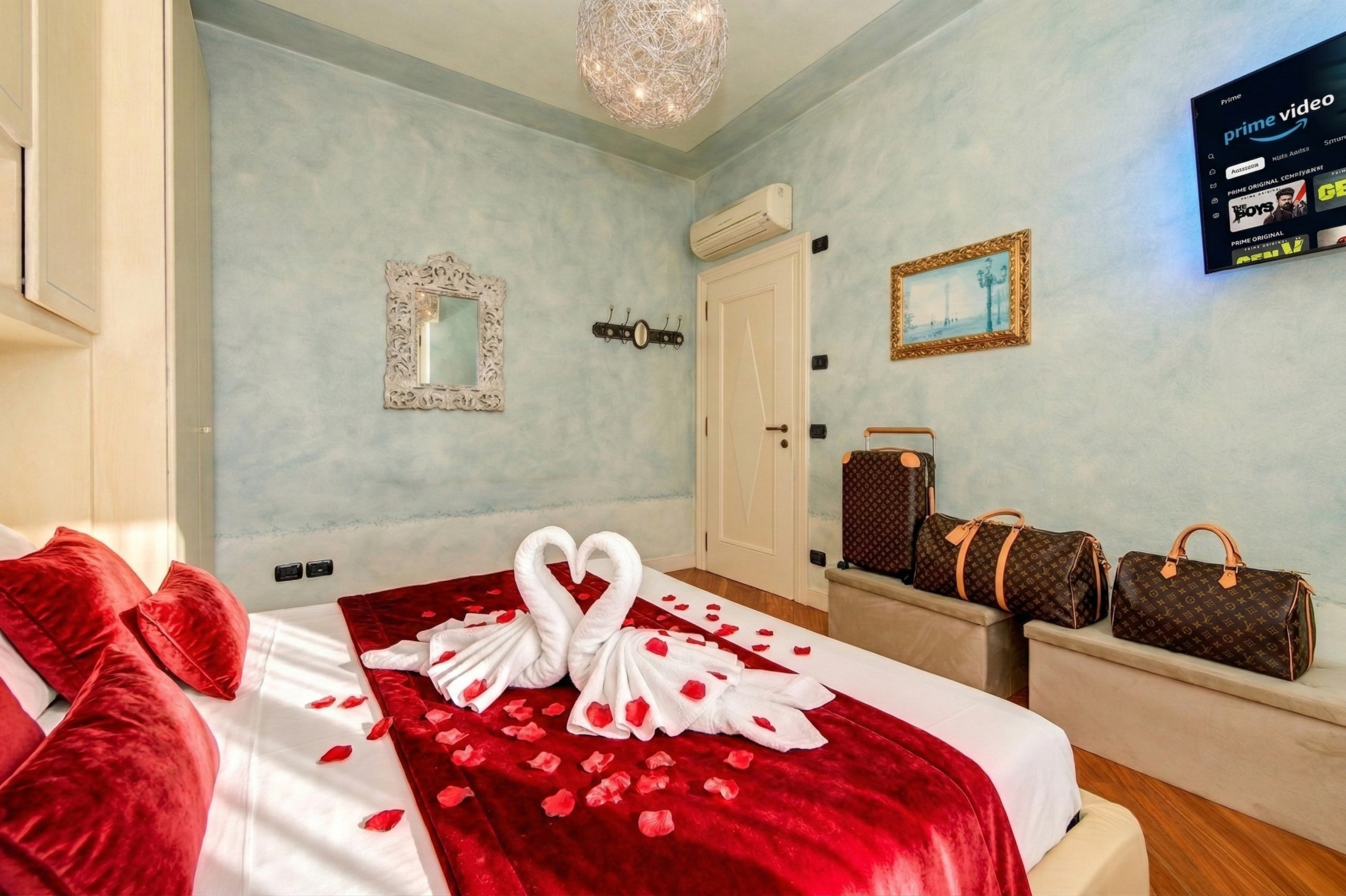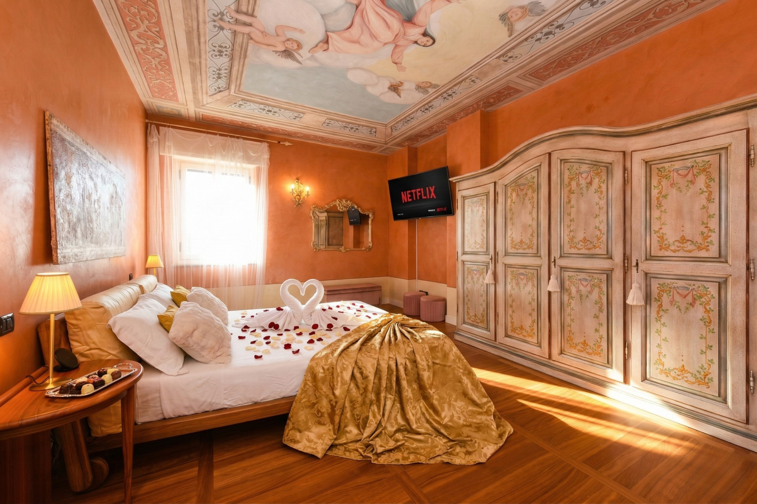 La camera padronale è il cuore elegante del piano: un raffinato affresco a soffitto incornicia il letto matrimoniale e crea un’atmosfera unica coniugando charme classico e comfort contemporaneo, mentre il bagno privato, ampio e perfettamente attrezzato, offre doppio lavabo, doccia walk-in e una splendida vasca da bagno ideale per concedersi un momento di benessere dopo una giornata trascorsa tra borghi, spiagge e paesaggi del Garda. Dal bagno si accede inoltre ad un poggiolo esterno, perfetto per un caffè al mattino o per godersi il silenzio delle ore serali.