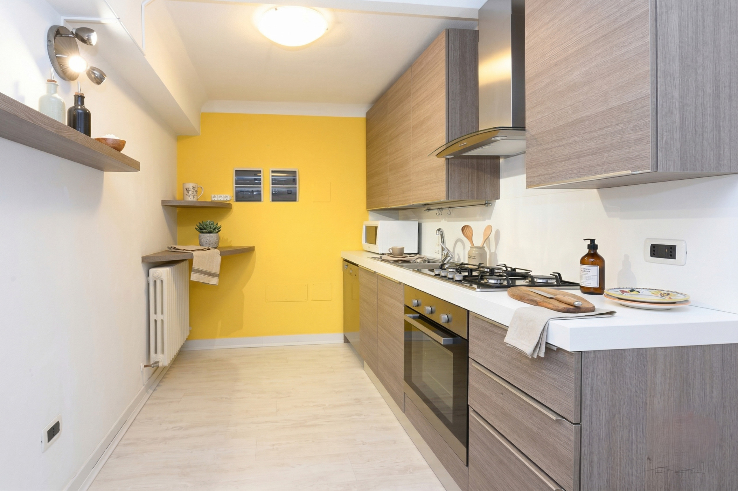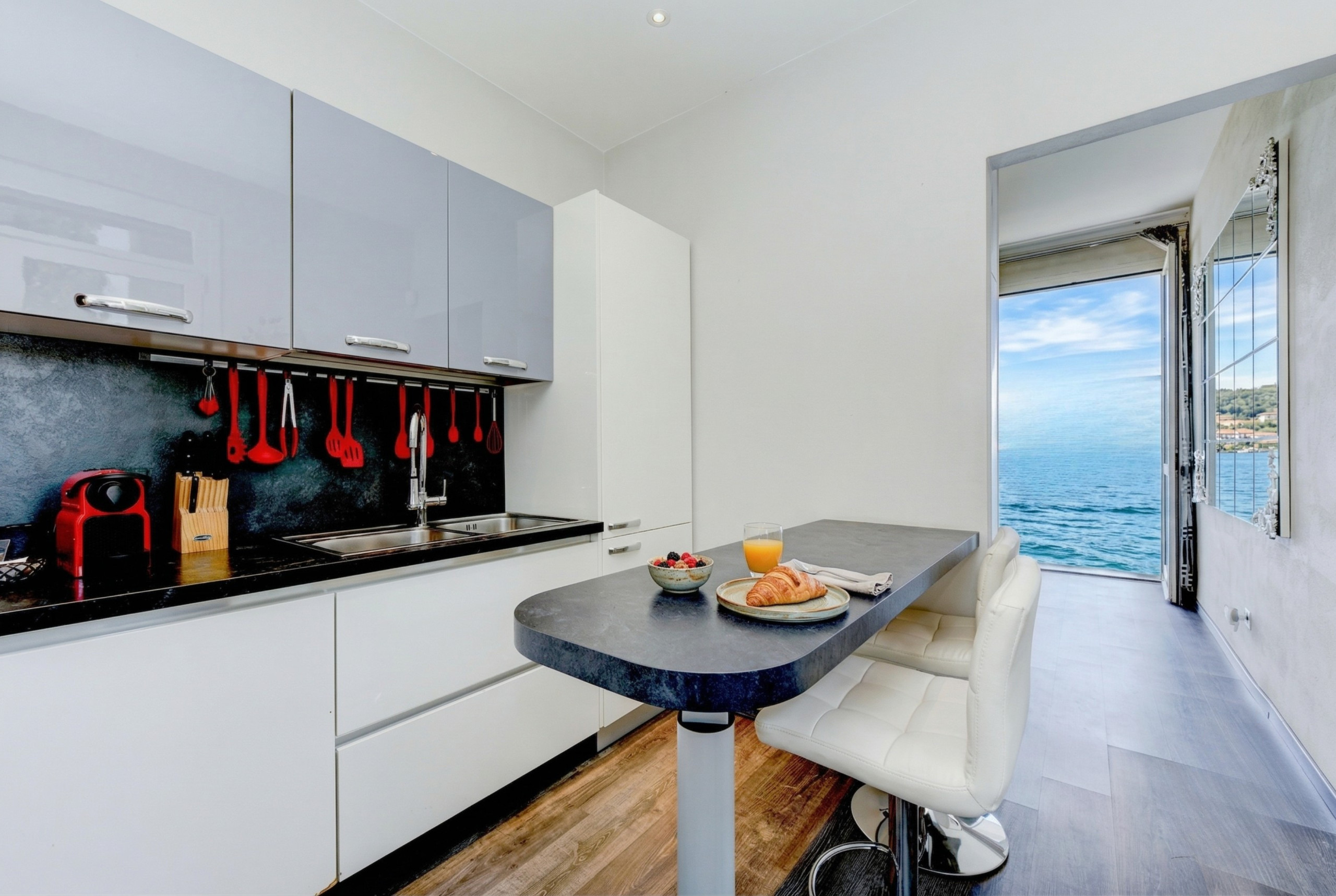 Die Küche, modern und komplett ausgestattet, ist der Traum all derjenigen, die gerne kochen und Mahlzeiten in Gesellschaft teilen. Hier fehlt wirklich nichts: Kühlschrank, Gefrierschrank, Ofen, Mikrowelle, Zitruspresse, elektrischer Wasserkocher, Gasherd, Geschirrspüler, Kaffeemaschine, Toaster und eine breite Palette von Küchenutensilien. Jedes Detail ist darauf ausgelegt, ein kompromisslos perfektes Erlebnis zu bieten, bei dem Praktikabilität sich mit raffiniertem Design verbindet.