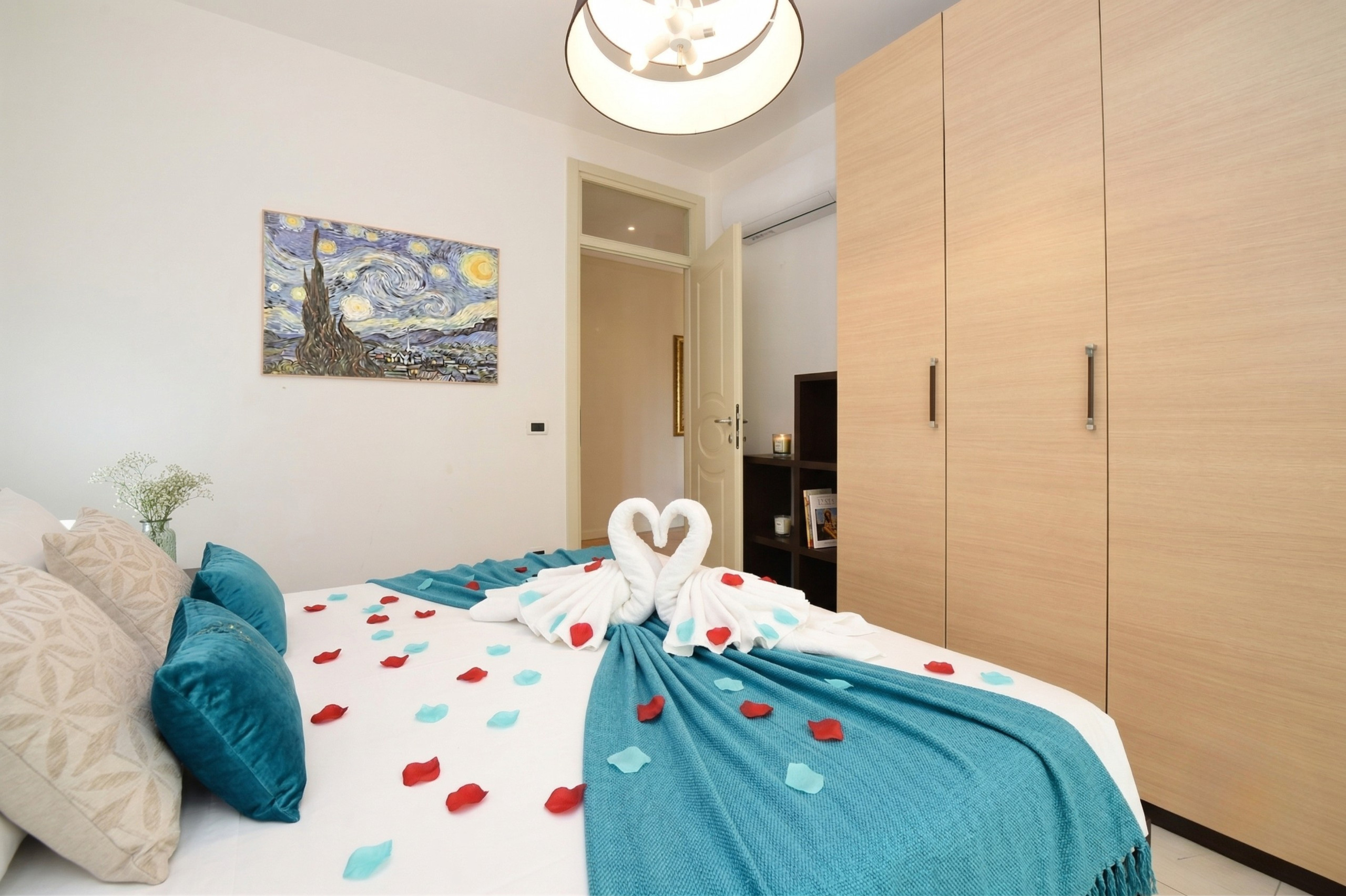 The sleeping area develops harmoniously along the corridor. The first double bedroom, located on the right, is an oasis of tranquillity, where a large French window lets in the morning light and an air of serenity. The bed, flanked by discreet bedside tables, is framed by a large four-door wardrobe, perfect for accommodating every space requirement. An artistic touch embellishes the environment: a reproduction of the famous Starry Night by Van Gogh, which gives the room a relaxing and evocative atmosphere.