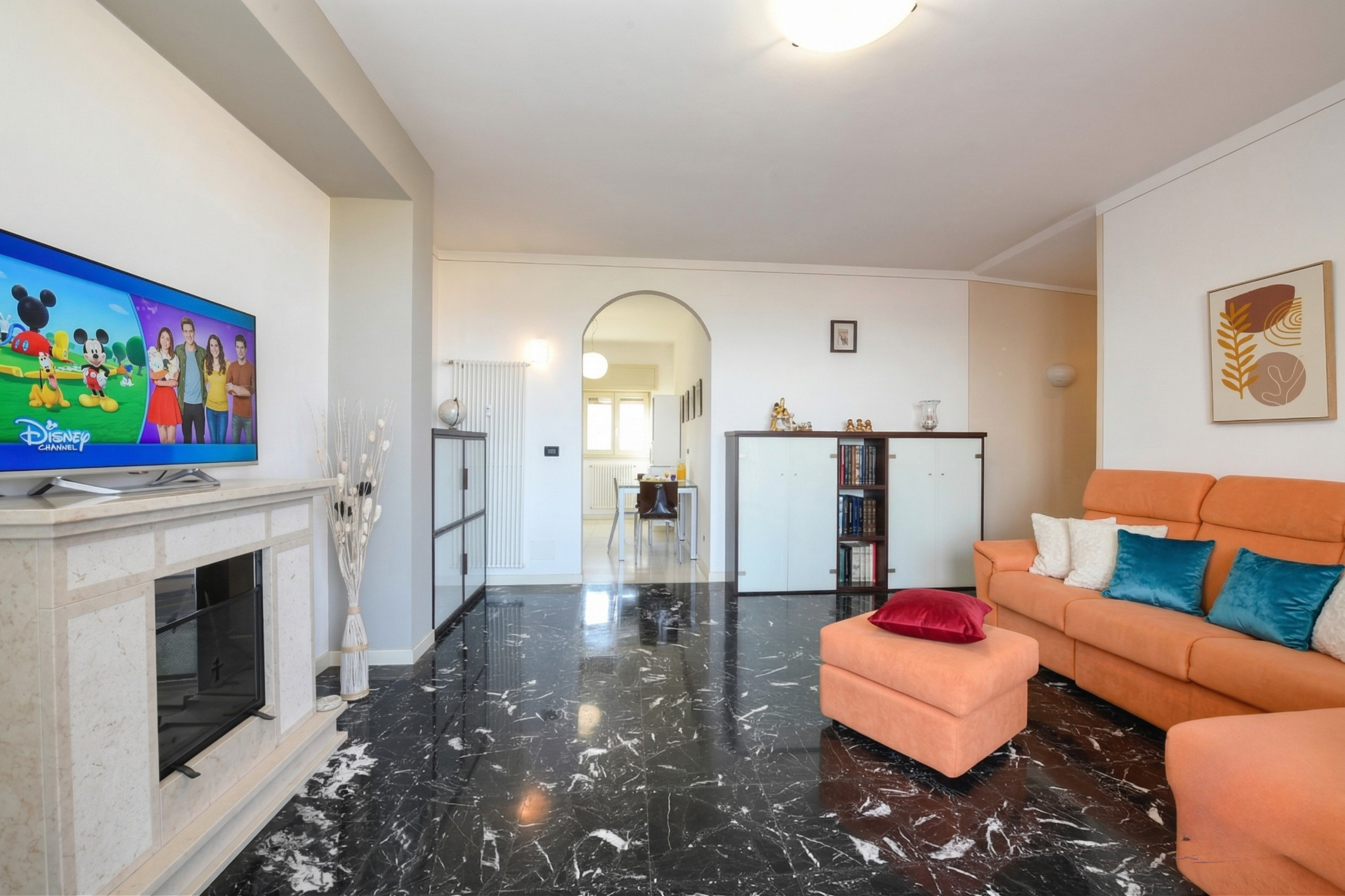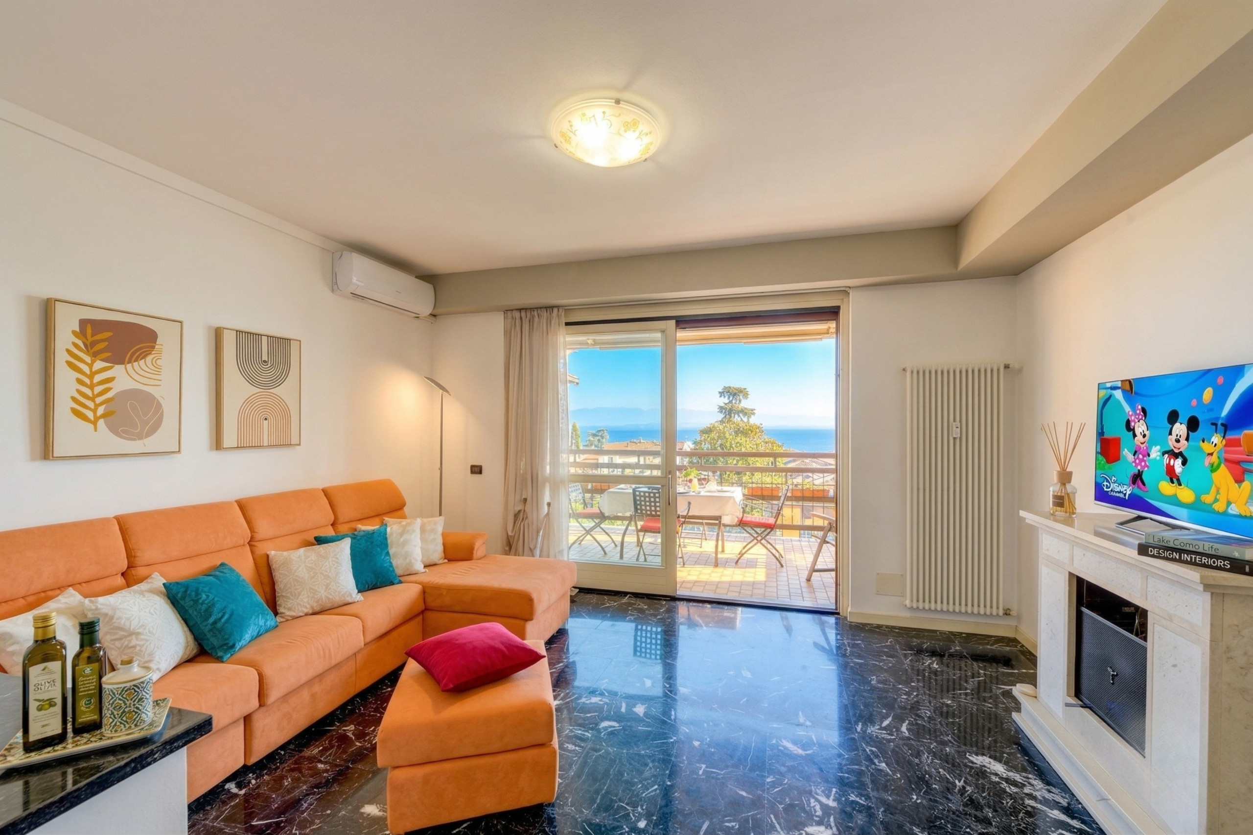 The heart of the apartment is the living room, a lively and sophisticated space, where elegance combines with practicality. The black and white marble floor creates a refined contrast with the large orange sofa, which invites relaxation and conviviality. Soft cushions in shades of grey, white and blue enrich the environment, while a refined glass coffee table adds a touch of class. The SMART TV, with access to Netflix and Amazon Prime, allows you to enjoy moments of leisure in total comfort. However, the real protagonist of this room is the spectacular terrace, accessible through a large French window. Here, the gaze is lost in the blue of the lake, offering an extraordinary panorama that accompanies days and evenings with postcard-like views.