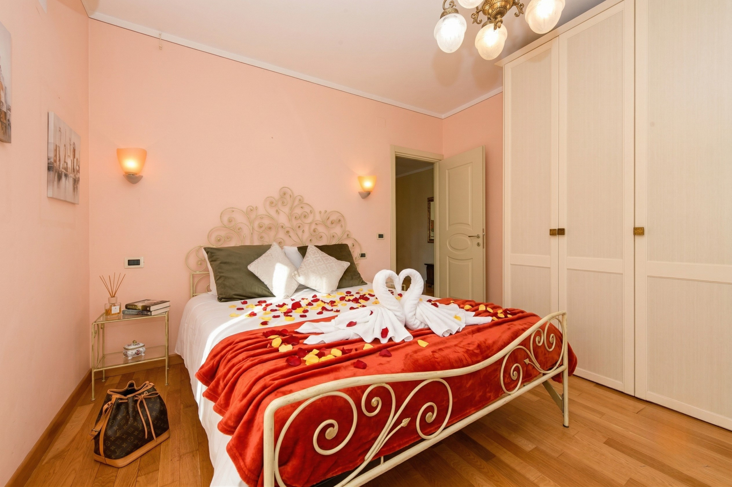 Next to the bathroom is the second double bedroom, elegant and welcoming, characterised by a wrought-iron bed, a chest of drawers and a large wardrobe. This room also boasts a private balcony, offering guests a relaxation corner outdoors. Both rooms are equipped with mattresses with high-quality toppers, designed to ensure regenerating sleep and unparalleled comfort.