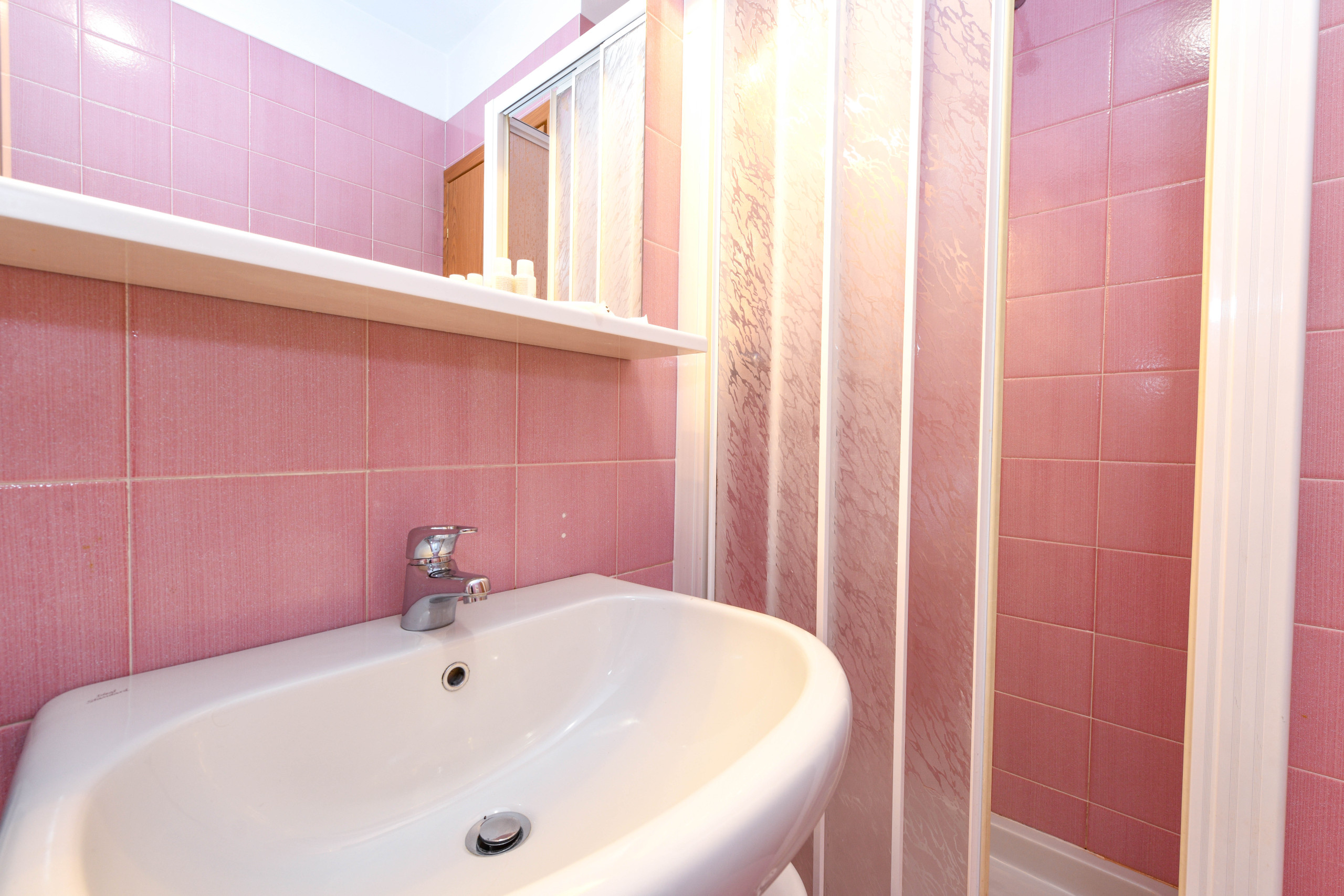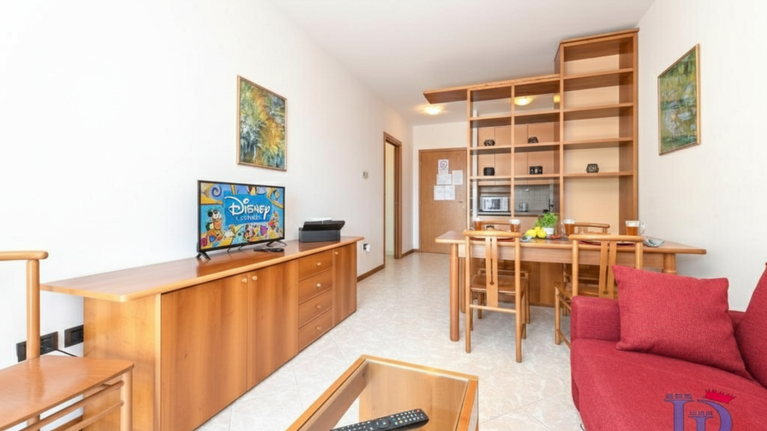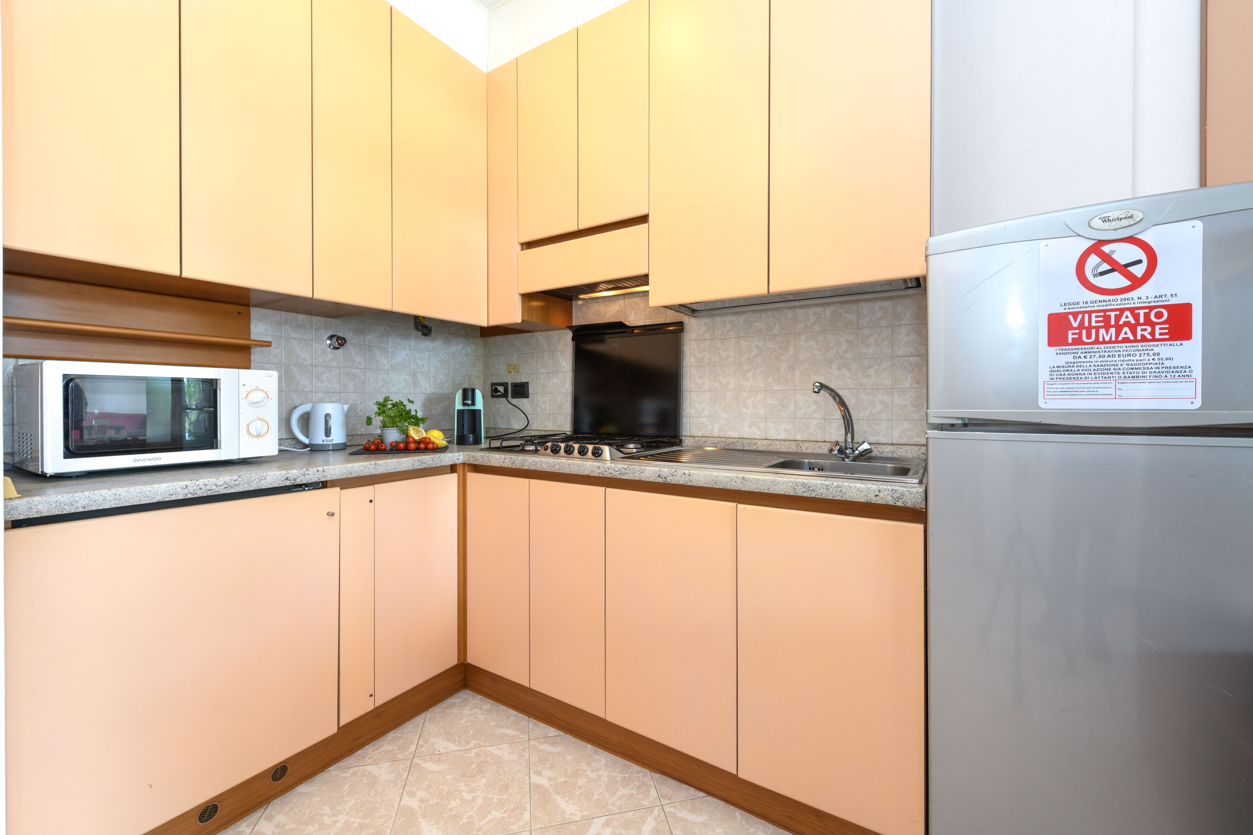 We wnętrzu klasyczny i funkcjonalny wystrój został zaprojektowany, aby zapewnić maksymalny komfort. Aneks kuchenny jest dobrze wyposażony w lodówkę, płytę grzewczą, mikrofalówkę i naczynia, pozwalając gościom na łatwe przygotowanie posiłków. Salon, jasny i przestronny, jest wyposażony w rozkładaną sofę małżeńską, idealną do relaksu po dniu zwiedzania. Dzięki drzwiom balkonowym salon otwiera się na taras, zalewając wnętrze naturalnym światłem.