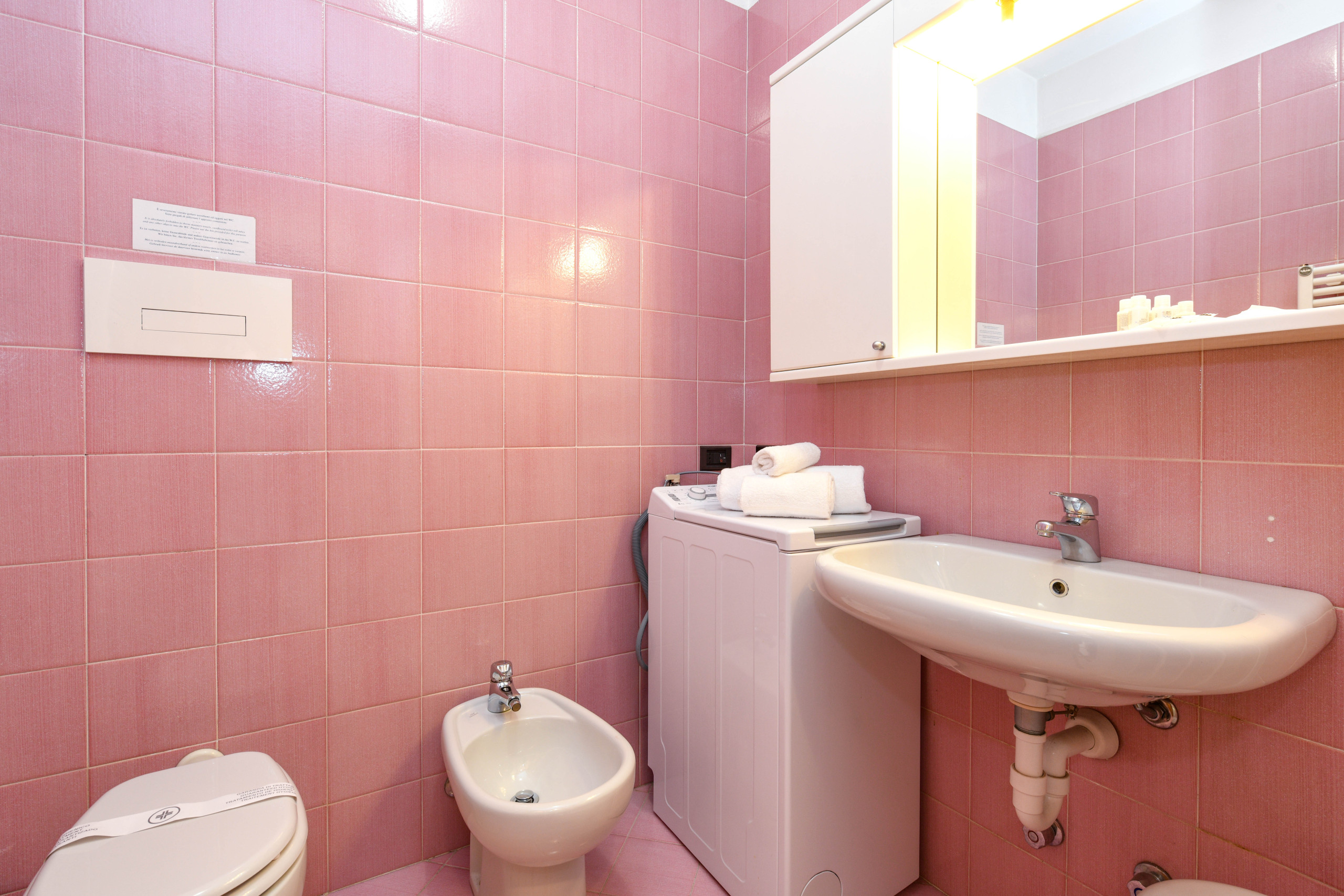 Po prawej stronie wejścia praktyczna komórka oferuje przydatne akcesoria, takie jak suszarka, żelazko i deska do prasowania, zapewniając, że apartament zawsze pozostanie uporządkowany i funkcjonalny. Łazienka, charakteryzująca się ciepłymi i relaksacyjnymi tonami, jest wyposażona w kabinę prysznicową, WC, bidet, pralkę i obszerną umywalkę z lustrem, oferując wszystko, co niezbędne do komfortowego pobytu.