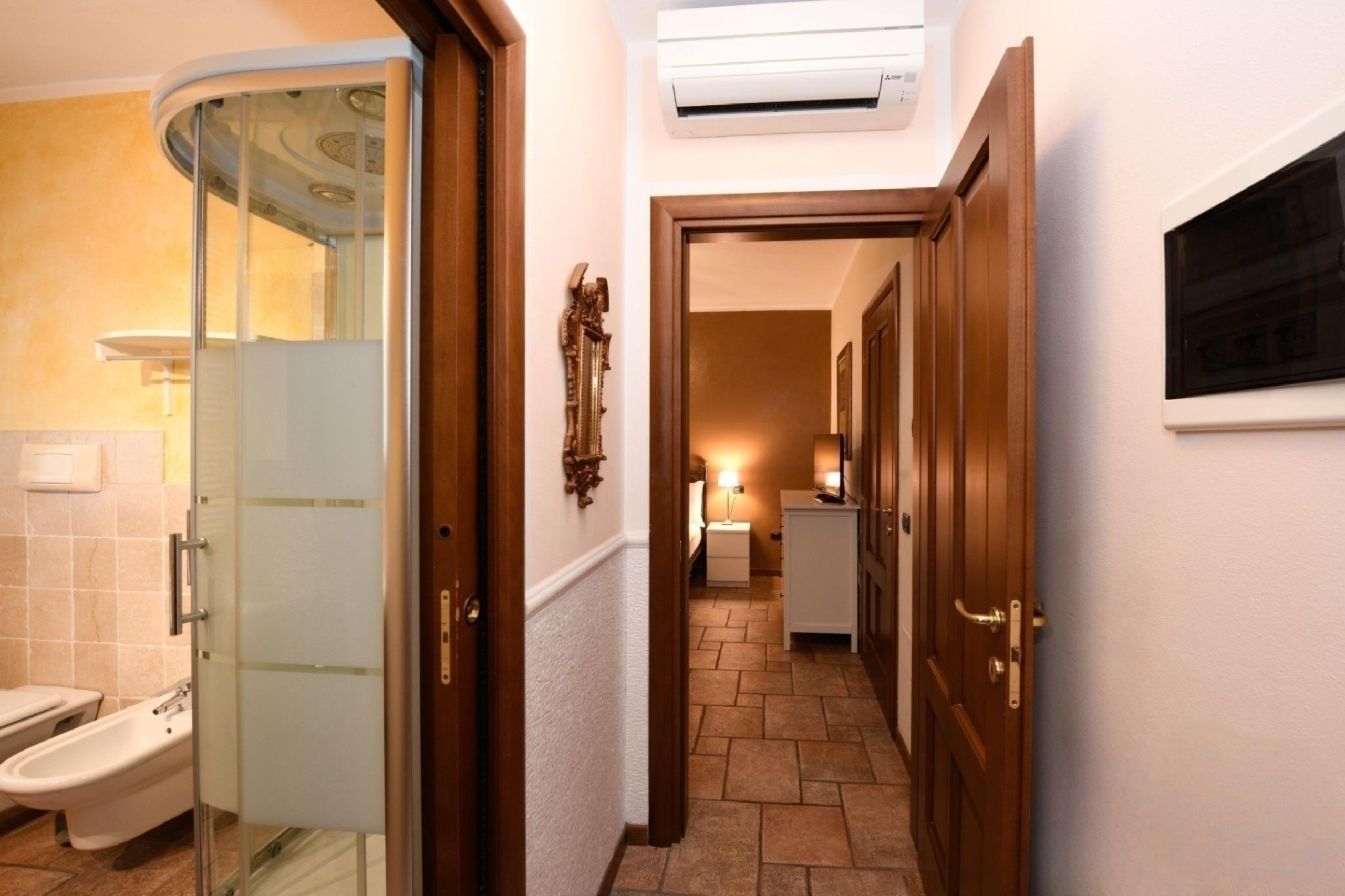 Strefa sypialna, oddzielona od strefy dziennej, składa się z przestronnej i przytulnej sypialni małżeńskiej, wyposażonej w dużą szafę, szafki nocne i lustro nadające pomieszczeniu jasności. Łazienka jest nowoczesna i funkcjonalna, z przestronnym prysznicem i pralką, zapewniając większą wygodę podczas pobytu.