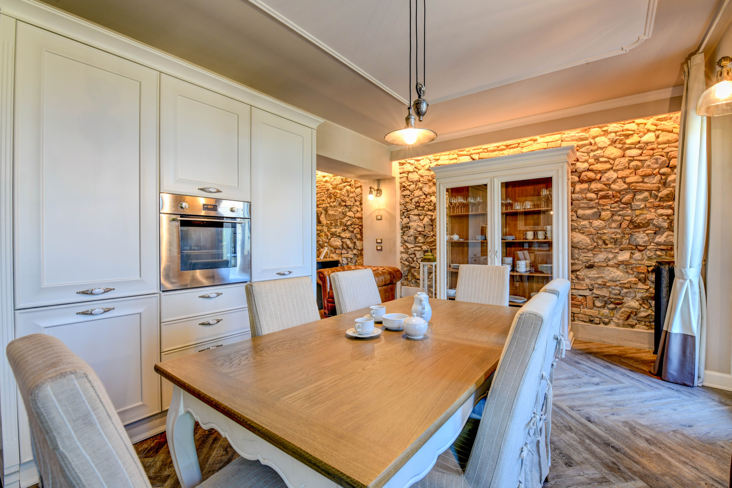 Z kuchni można wyjść na panoramiczny taras z widokiem na rozległy ogród, wyposażony w stół, krzesła i parasol. Wracając do domu, wita nas wspaniały salon z kamiennymi ścianami, sufitem z widocznymi belkami, starannie urządzony: duży telewizor smart, wygodna rozkładana sofa, biblioteczka, fotel i wyrafinowane dodatki.