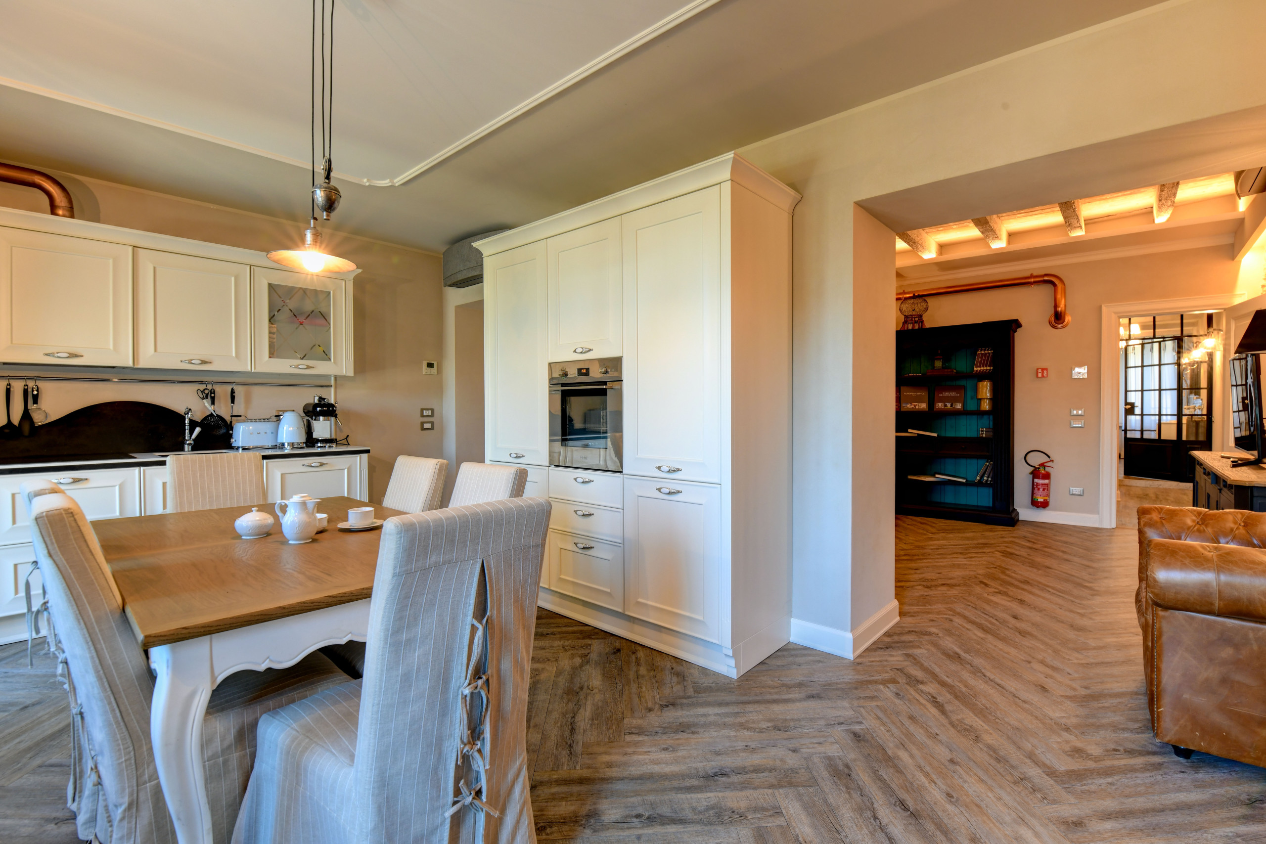 Po schodach, po prawej stronie mamy stanowisko do dezynfekcji klienta. Jesteśmy na pierwszym piętrze i... wchodzimy! Przed nami krótki korytarz prowadzący do przestronnej i jasnej kuchni z żywymi kamiennymi ścianami, wyposażonej w stół, krzesła, szafę, ładną witrynę oraz wszystkie niezbędne urządzenia i narzędzia do przygotowywania kolacji, śniadań i aperitifów.