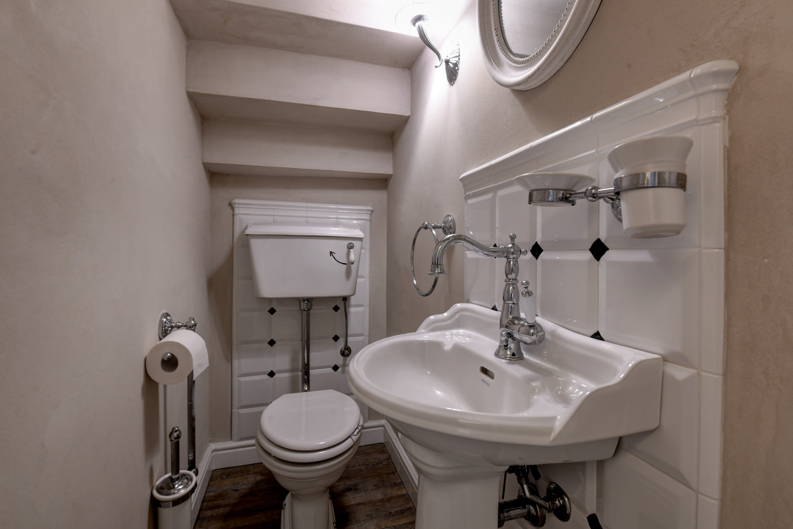 Z boku salonu po lewej stronie znajduje się mała toaleta z WC, umywalką i małym lustrem.
