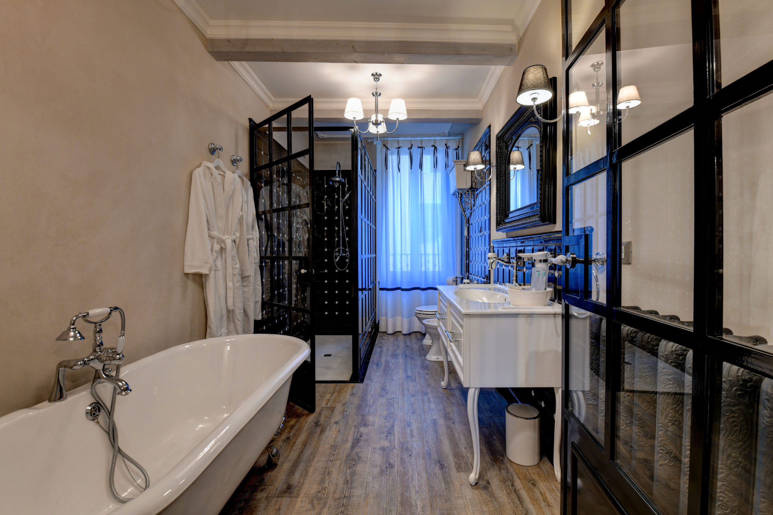 Po drugiej stronie korytarza jest obszerna łazienka główna, wyposażona w wannę, WC, bidet, umywalkę, dużą (XXXL) otwartą prysznicę i ładne lustro z szufladkami.