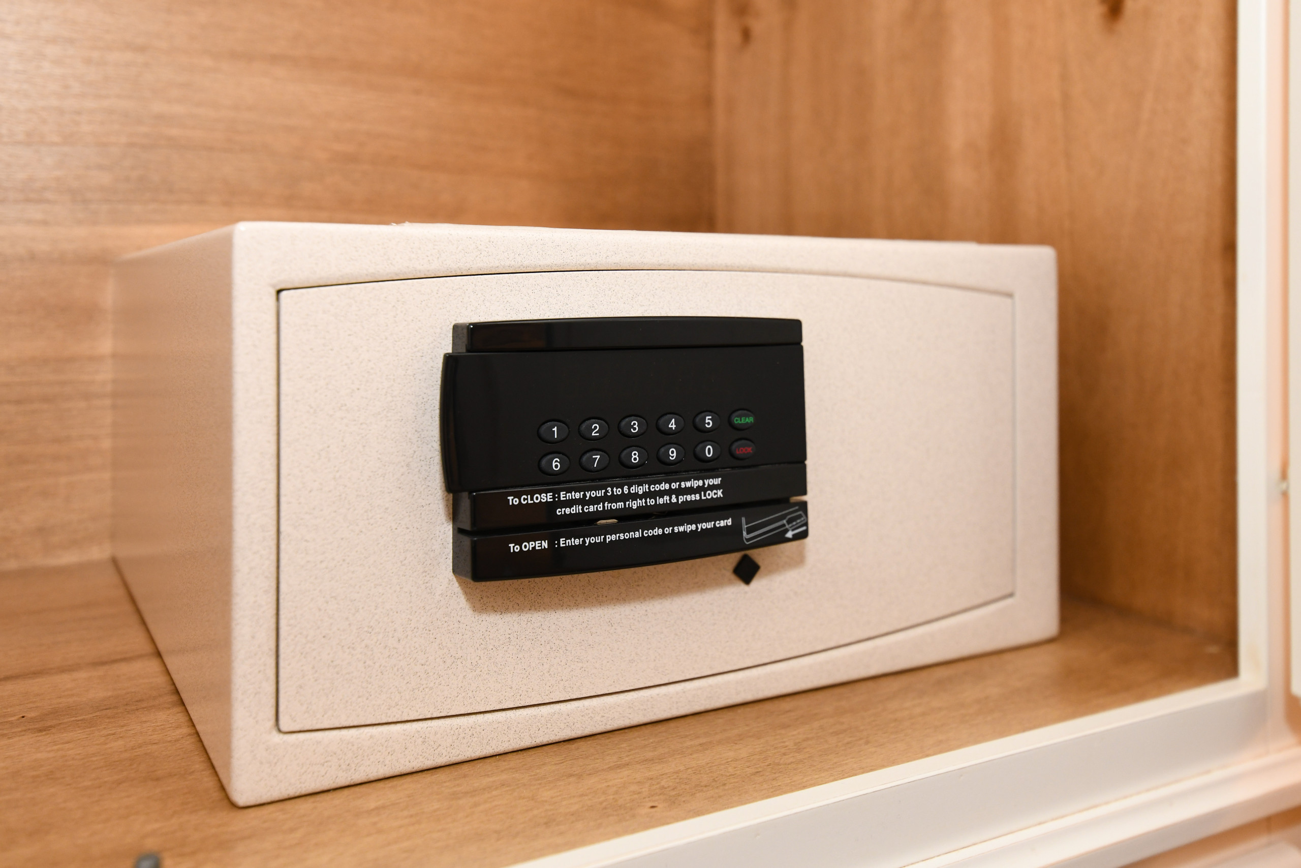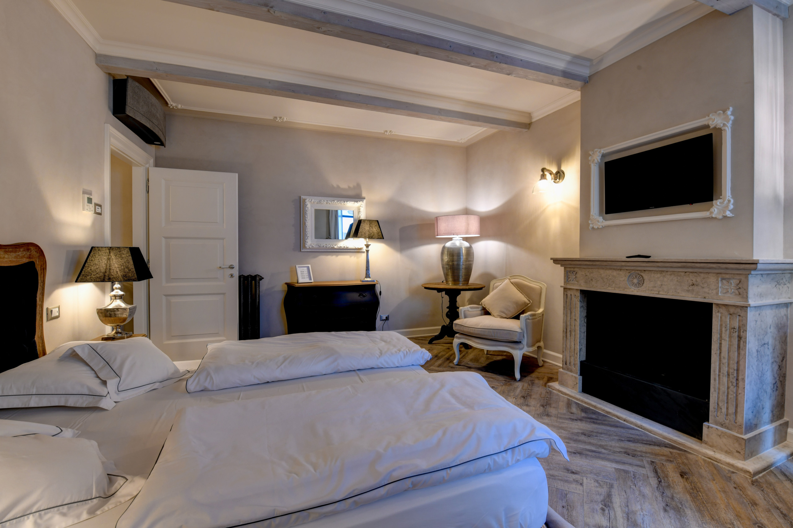 Wreszcie po prawej stronie znajdziecie sypialnię z łóżkiem king size, podwójną szafką nocną z abażurem, podwójnym fotelem, ozdobnym kominkiem, telewizorem smart i dużą szafą z sejfem.