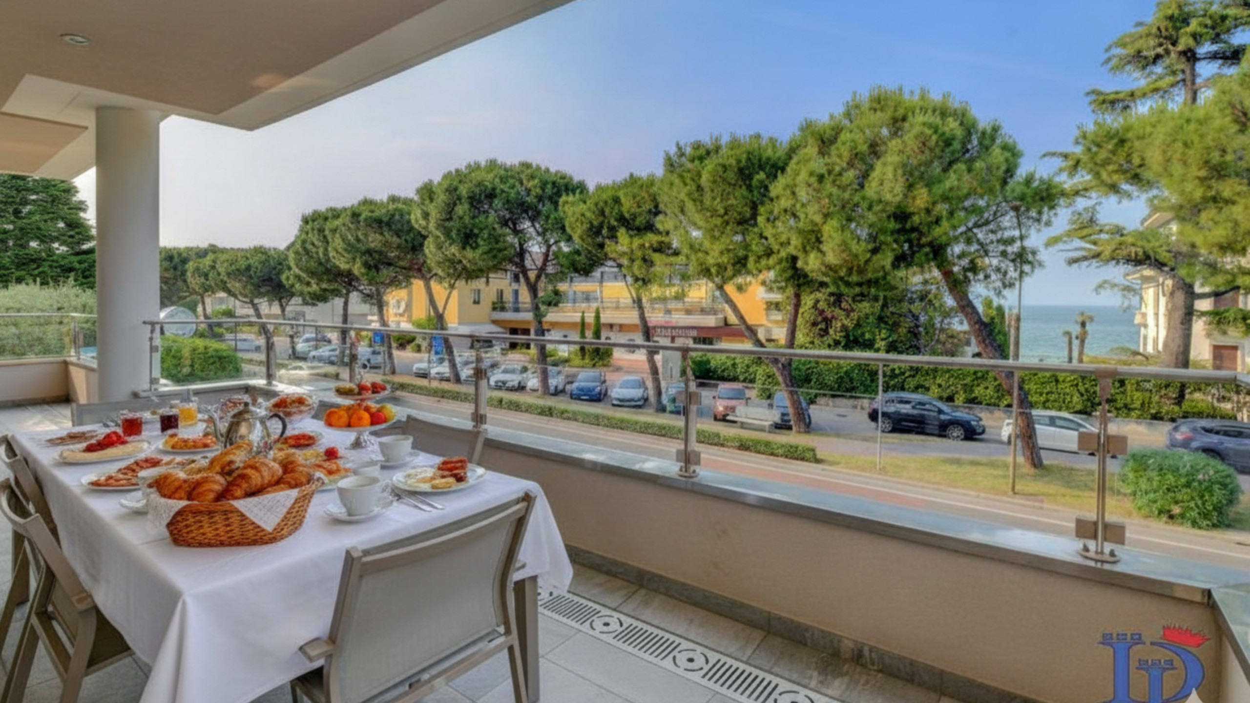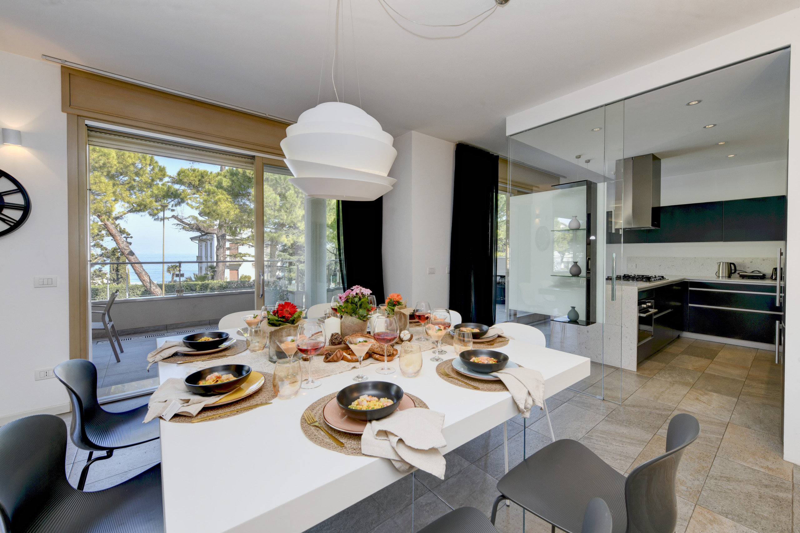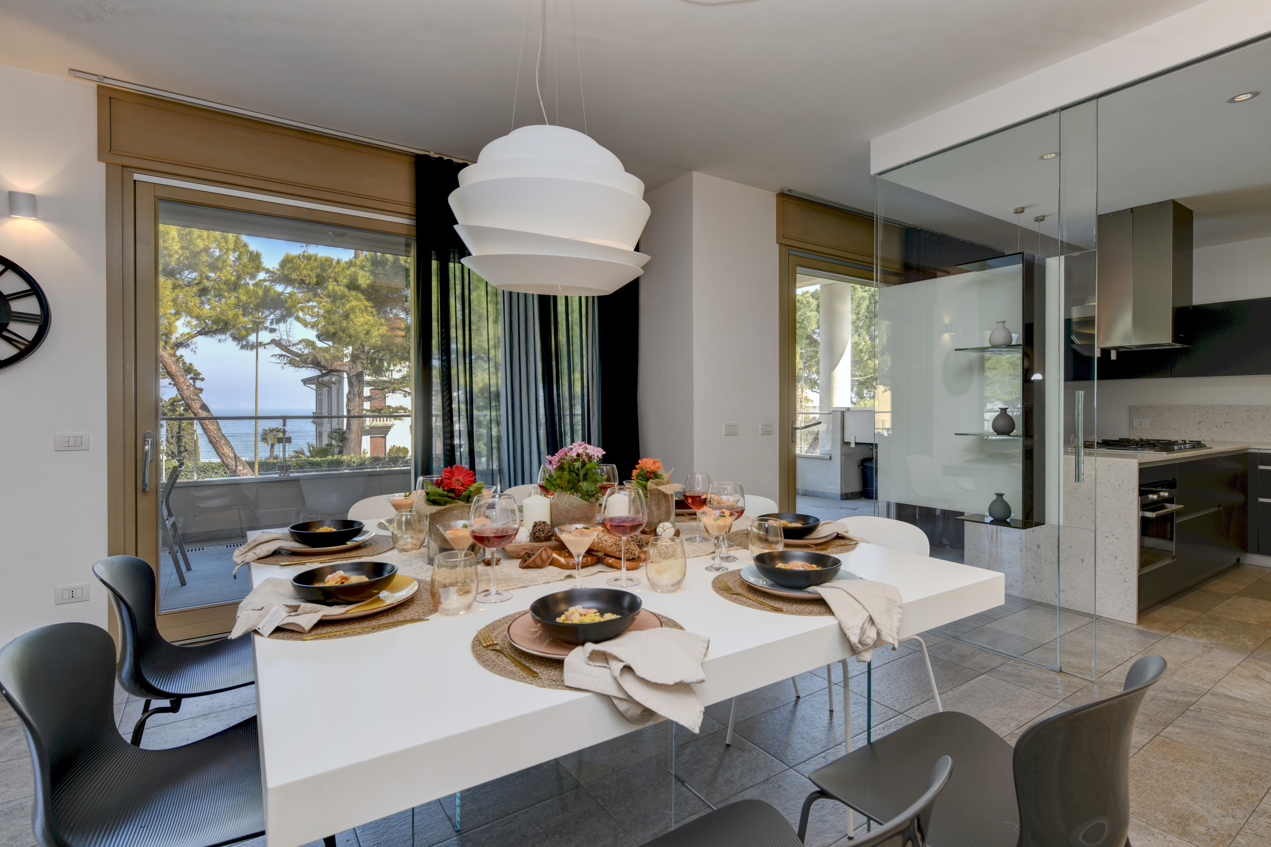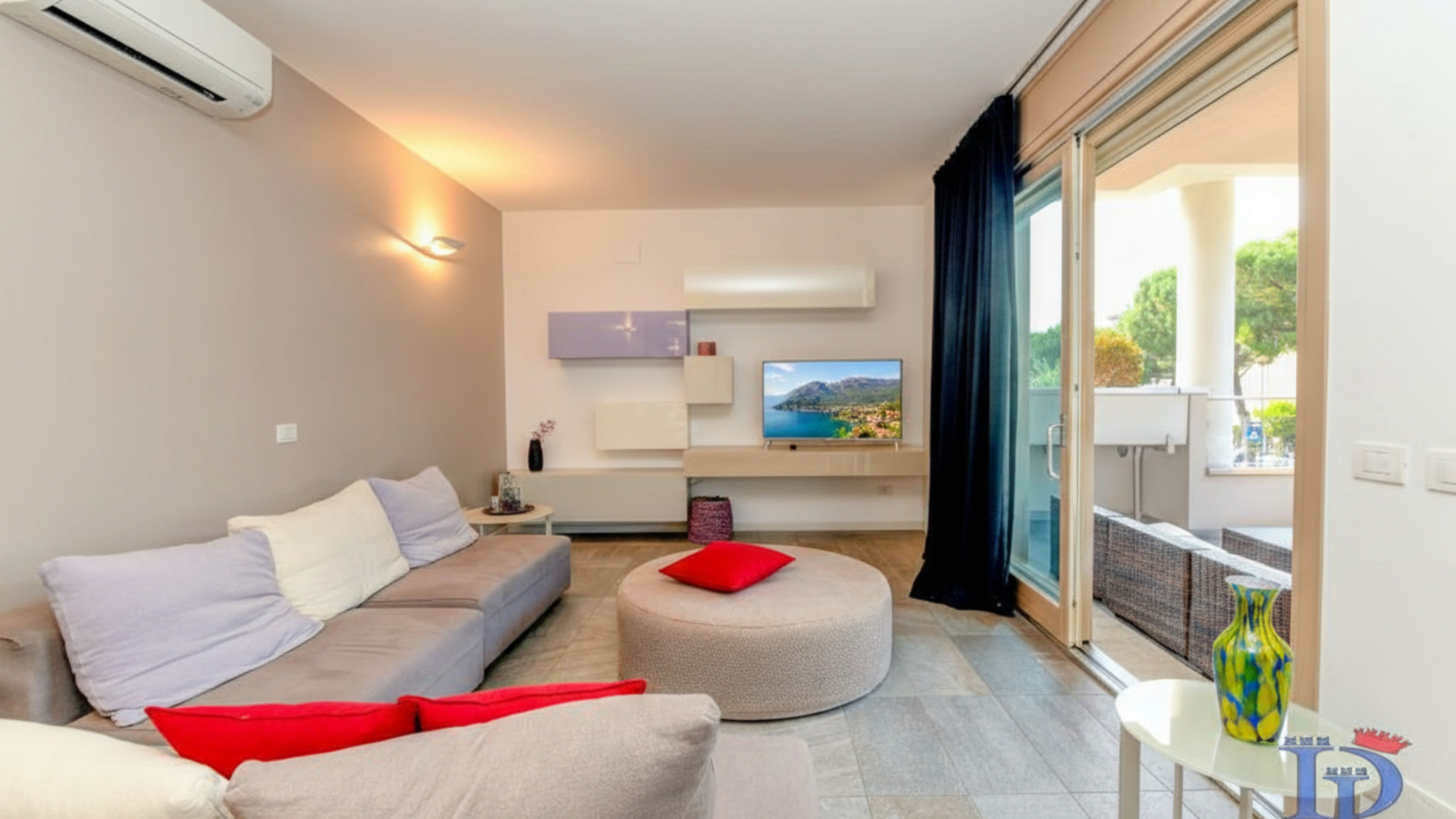 Apartament wyróżnia się elegancją i funkcjonalnością przestrzeni. Po wejściu przywitamy się w przestronnym i jasnym salonie, urządzonym z gustem i wyposażonym we wszystkie udogodnienia: klimatyzację, Smart TV i wygodną sofę, idealną do relaksu lub wieczoru w towarzystwie. Strefa dzienna łączy się bezpośrednio z kuchnią w stylu amerykańskim, oddzieloną eleganckimi przesuwnymi drzwiami, dzięki czemu jest idealna do otwartego i jasnego użytkowania. Kuchnia jest przestronna, wyposażona w wyspę i wszystkie niezbędne akcesoria do przygotowania pysznych potraw lub aperitifów. Z kuchni i salonu trzy duże drzwi balkonowe prowadzą na obszerny taras o powierzchni 48 m², oferujący panoramiczny widok na jezioro. Ta przestrzeń zewnętrzna jest prawdziwym rajem, z dużym stołem, krzesłami i wygodną sofą, idealną do posiłków na świeżym powietrzu lub chwil relaksu. Wieczorem atmosfera staje się jeszcze bardziej urokliwa dzięki dyskretnym reflektorom, tworząc idealną scenerię do delektowania się widokiem i spokojem.