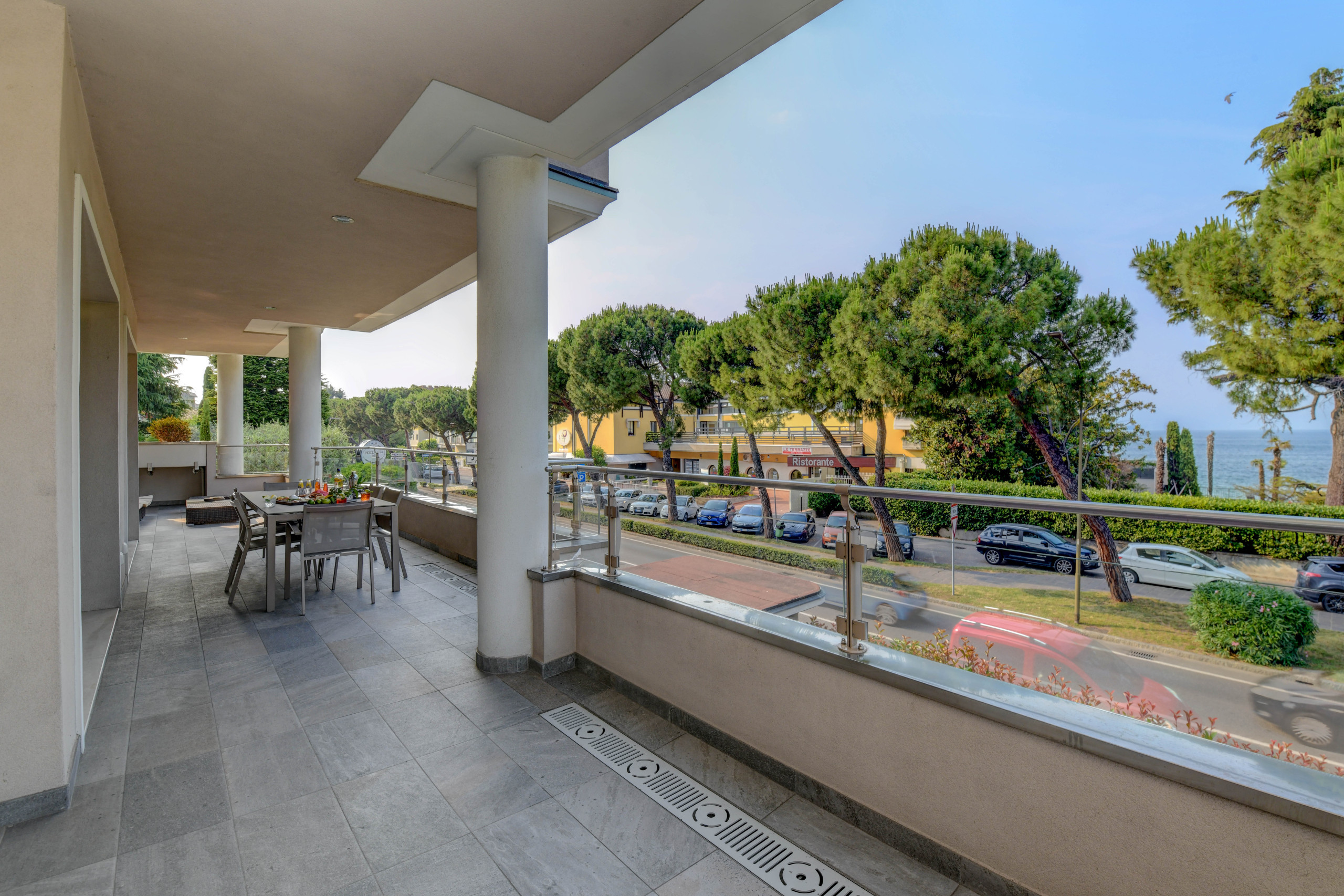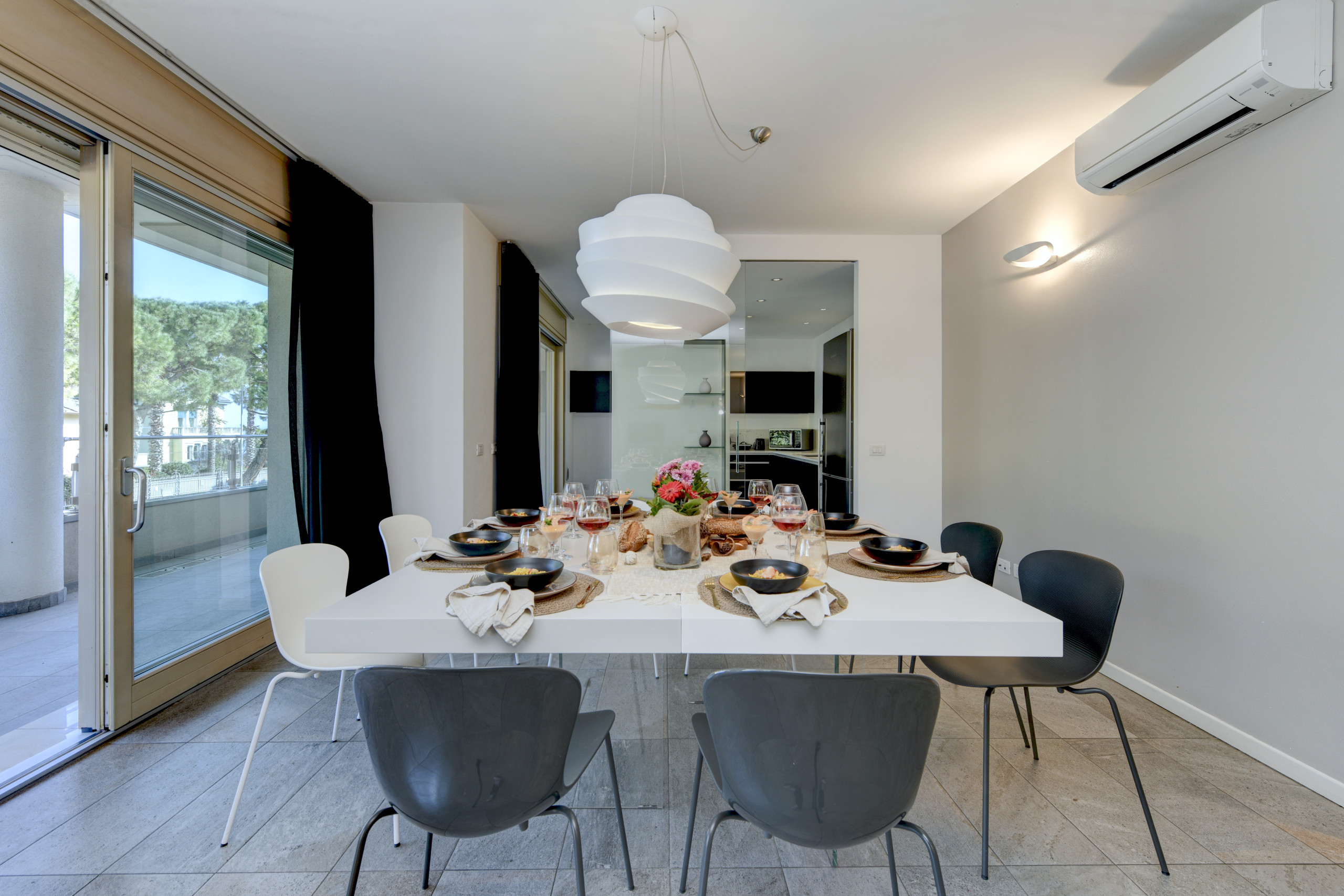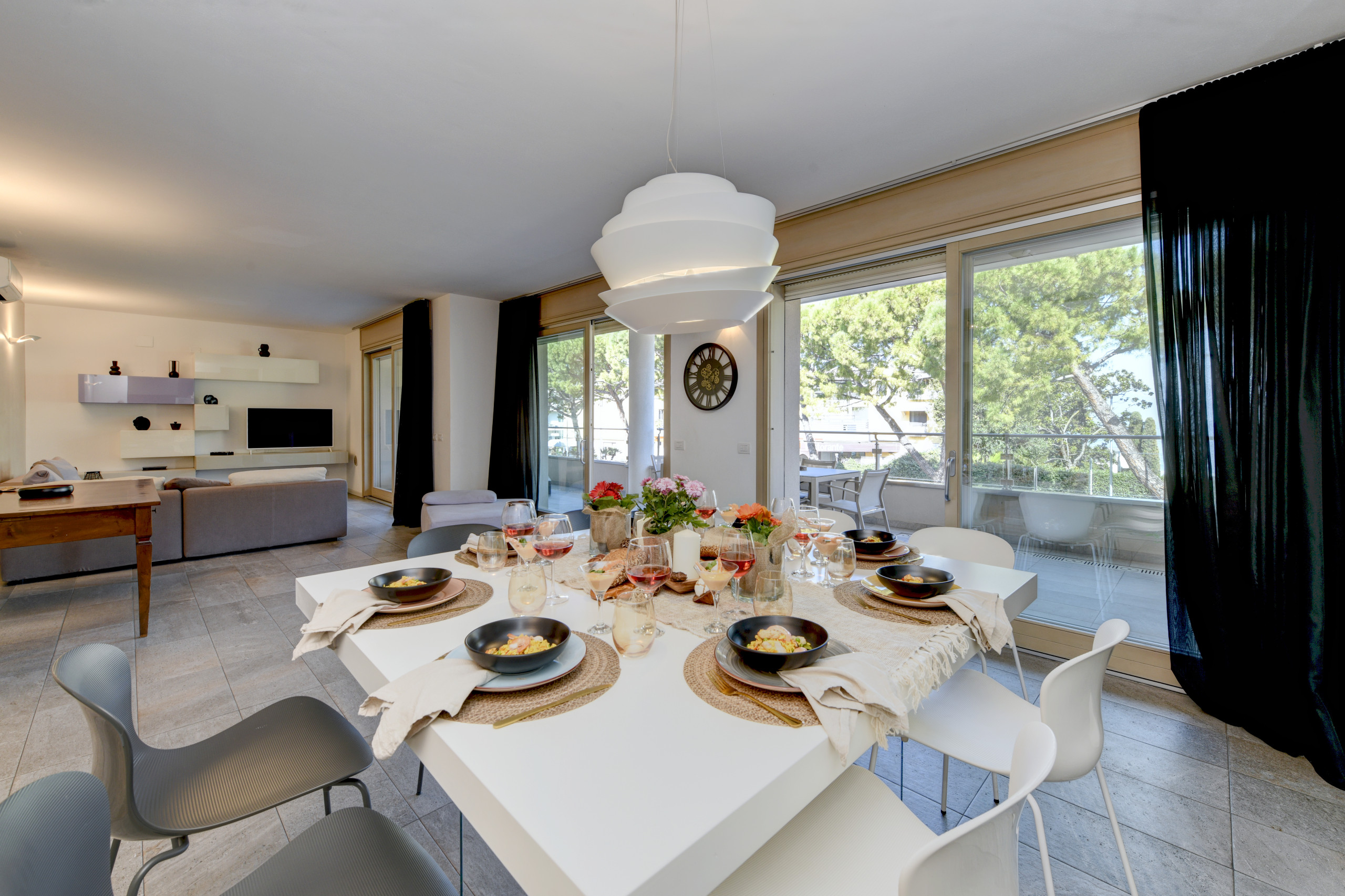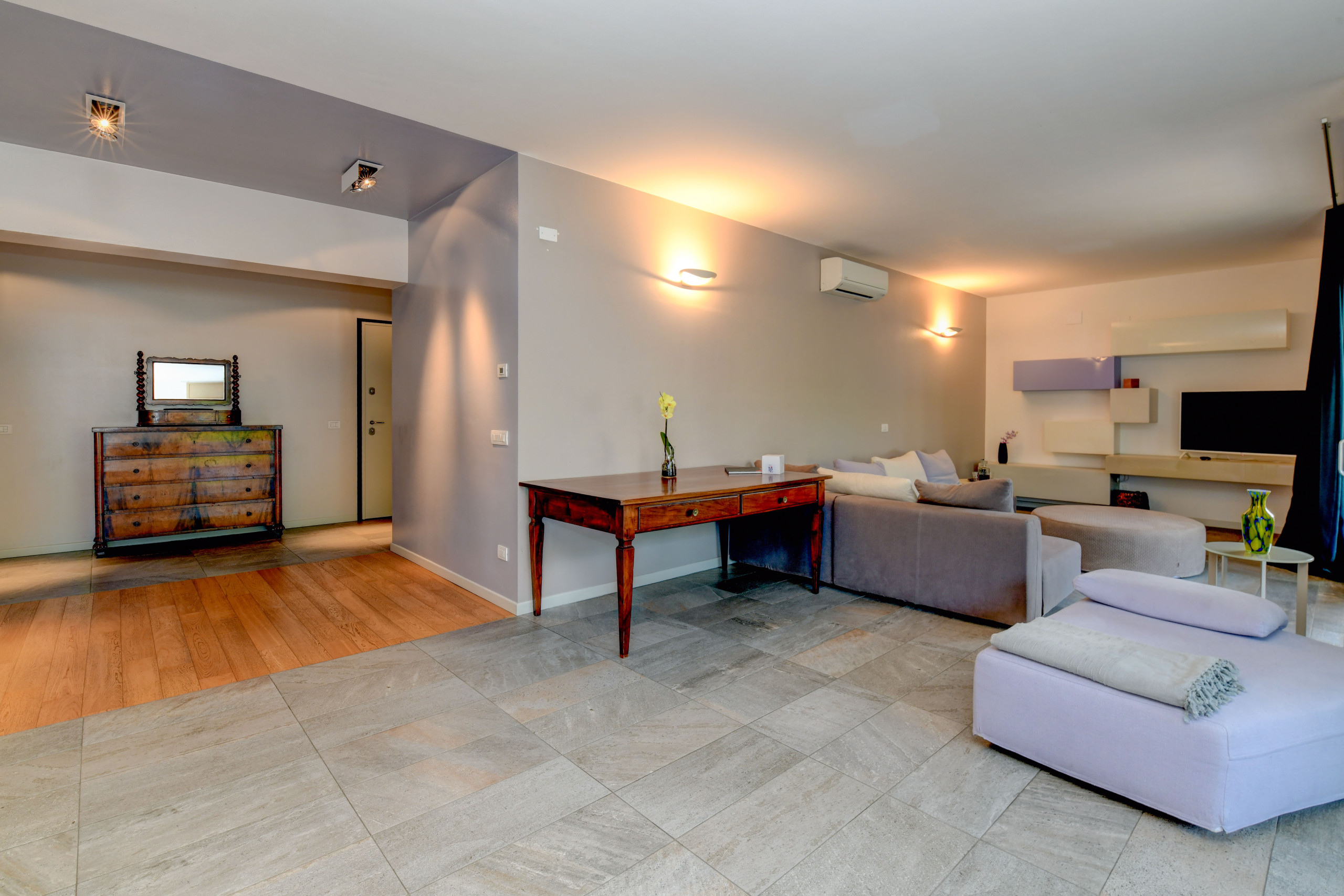 Apartament wyróżnia się elegancją i funkcjonalnością przestrzeni. Po wejściu przywitamy się w przestronnym i jasnym salonie, urządzonym z gustem i wyposażonym we wszystkie udogodnienia: klimatyzację, Smart TV i wygodną sofę, idealną do relaksu lub wieczoru w towarzystwie. Strefa dzienna łączy się bezpośrednio z kuchnią w stylu amerykańskim, oddzieloną eleganckimi przesuwnymi drzwiami, dzięki czemu jest idealna do otwartego i jasnego użytkowania. Kuchnia jest przestronna, wyposażona w wyspę i wszystkie niezbędne akcesoria do przygotowania pysznych potraw lub aperitifów. Z kuchni i salonu trzy duże drzwi balkonowe prowadzą na obszerny taras o powierzchni 48 m², oferujący panoramiczny widok na jezioro. Ta przestrzeń zewnętrzna jest prawdziwym rajem, z dużym stołem, krzesłami i wygodną sofą, idealną do posiłków na świeżym powietrzu lub chwil relaksu. Wieczorem atmosfera staje się jeszcze bardziej urokliwa dzięki dyskretnym reflektorom, tworząc idealną scenerię do delektowania się widokiem i spokojem.