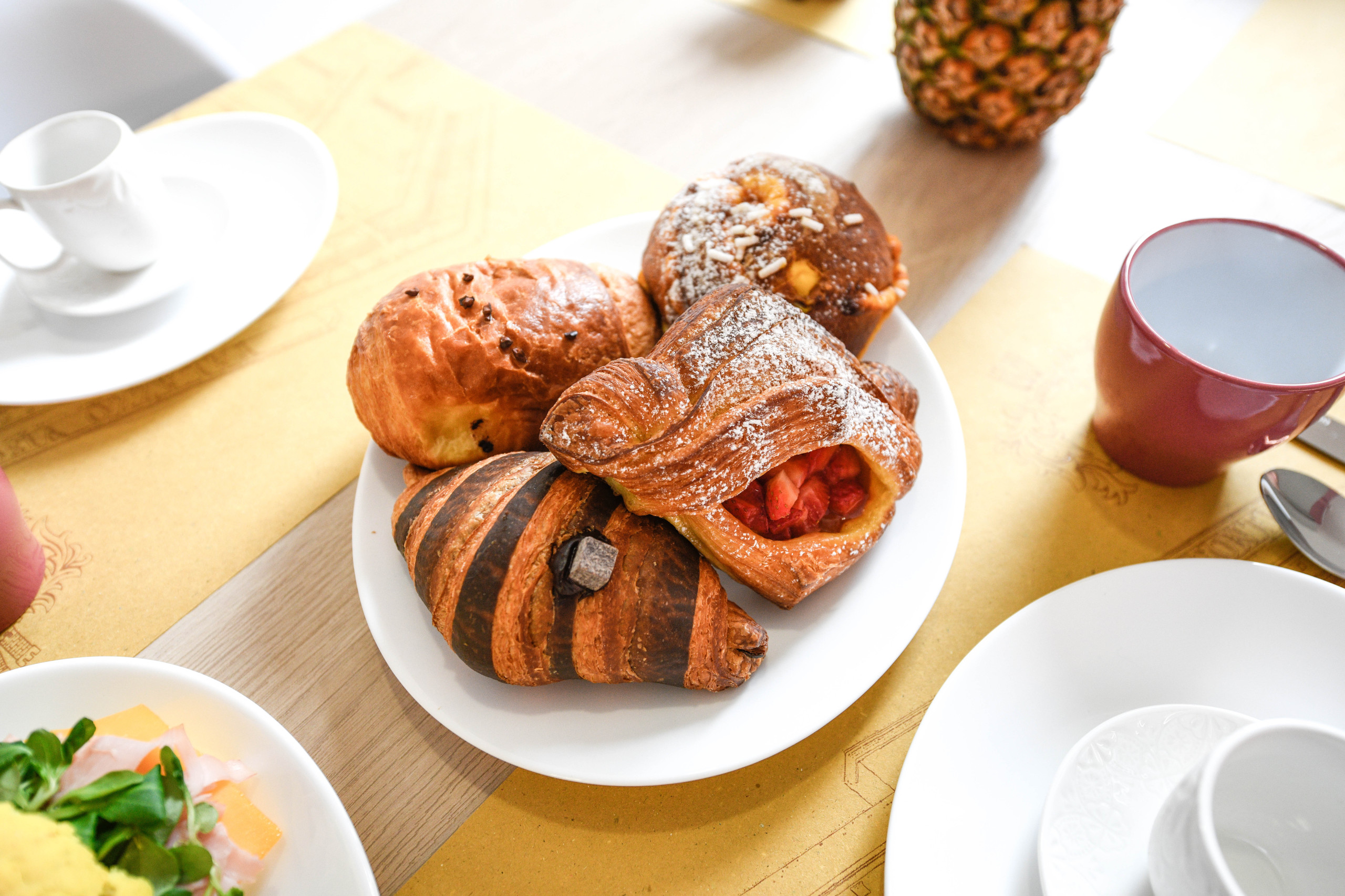Gebäck für Frühstück anbieten, da wenige Bäckereien vor Ort sind.