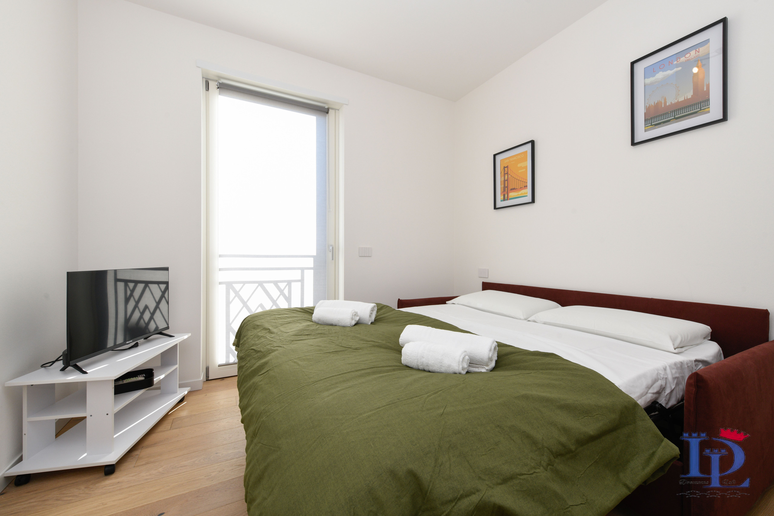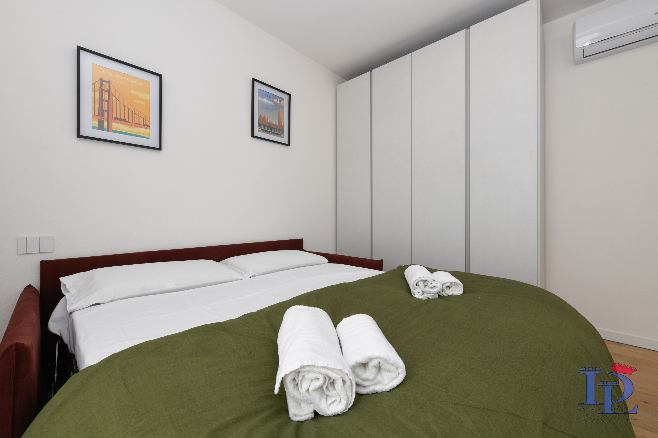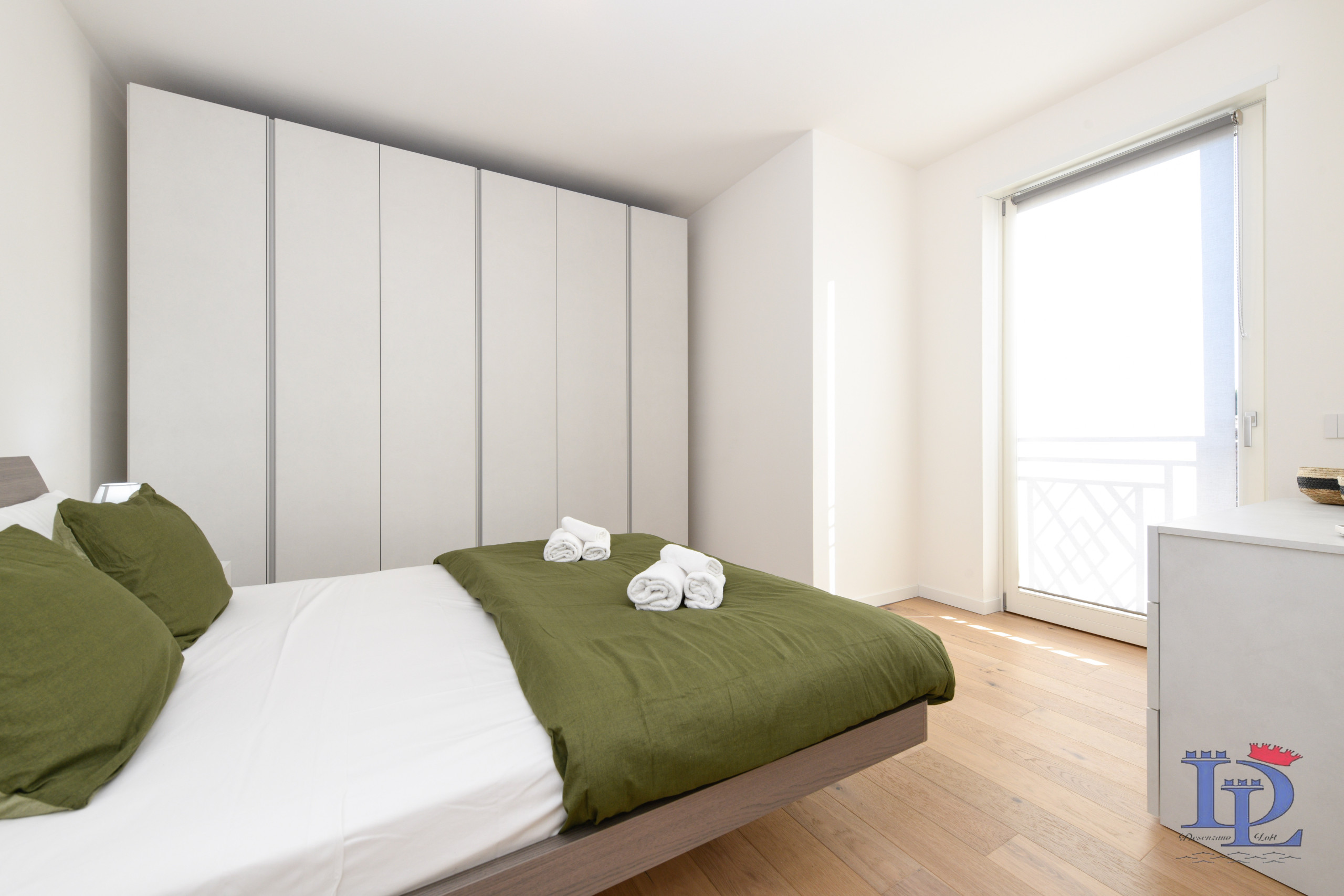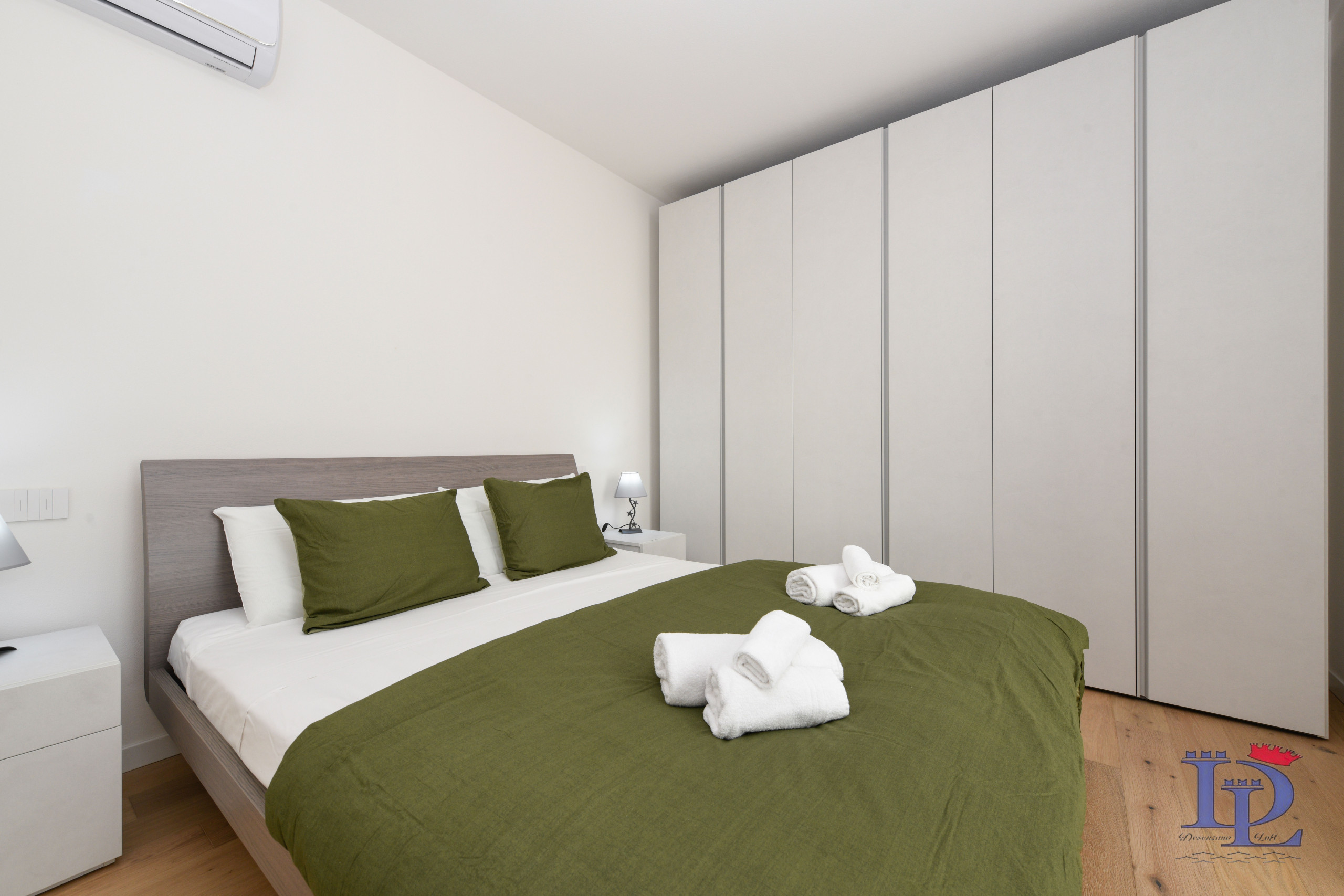 Na drugim piętrze (również z windą) niedawno wybudowanego budynku nad jeziorem znajduje się jeden z naszych najlepiej sprzedających się apartamentów "Smeraldo". Wchodząc do apartamentu Smeraldo wita nas hol wejściowy prowadzący do części sypialnej, która jest harmonijnie podzielona na dwie wygodne klimatyzowane dwuosobowe sypialnie wyposażone w nakładki zapewniające maksymalny komfort (nakładka to akcesorium do łóżka, które dodaje dodatkową warstwę komfortu). Klimatyzacja w każdym pokoju zapewnia dodatkową warstwę komfortu, elegancji i dobrego samopoczucia, pozwalając gościom zoptymalizować środowisko snu i rozrywki.