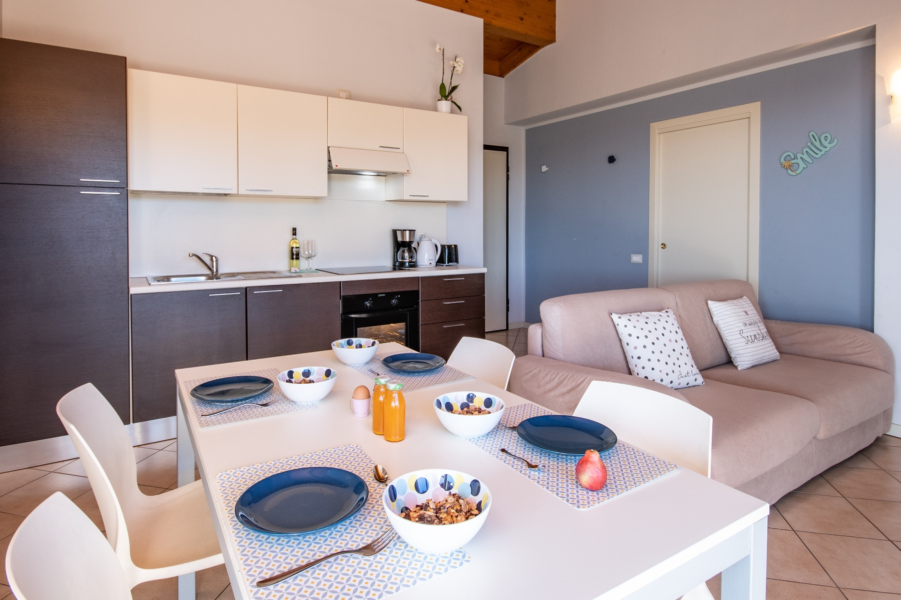 Kuchnia otwarta od płyta indukcyjna, jest wyposażone w chłodziarka, piekarnik, zamrażarka, zmywarka, naczynia/sztućce, ekspres do kawy, opiekacz/toster i czajnik.