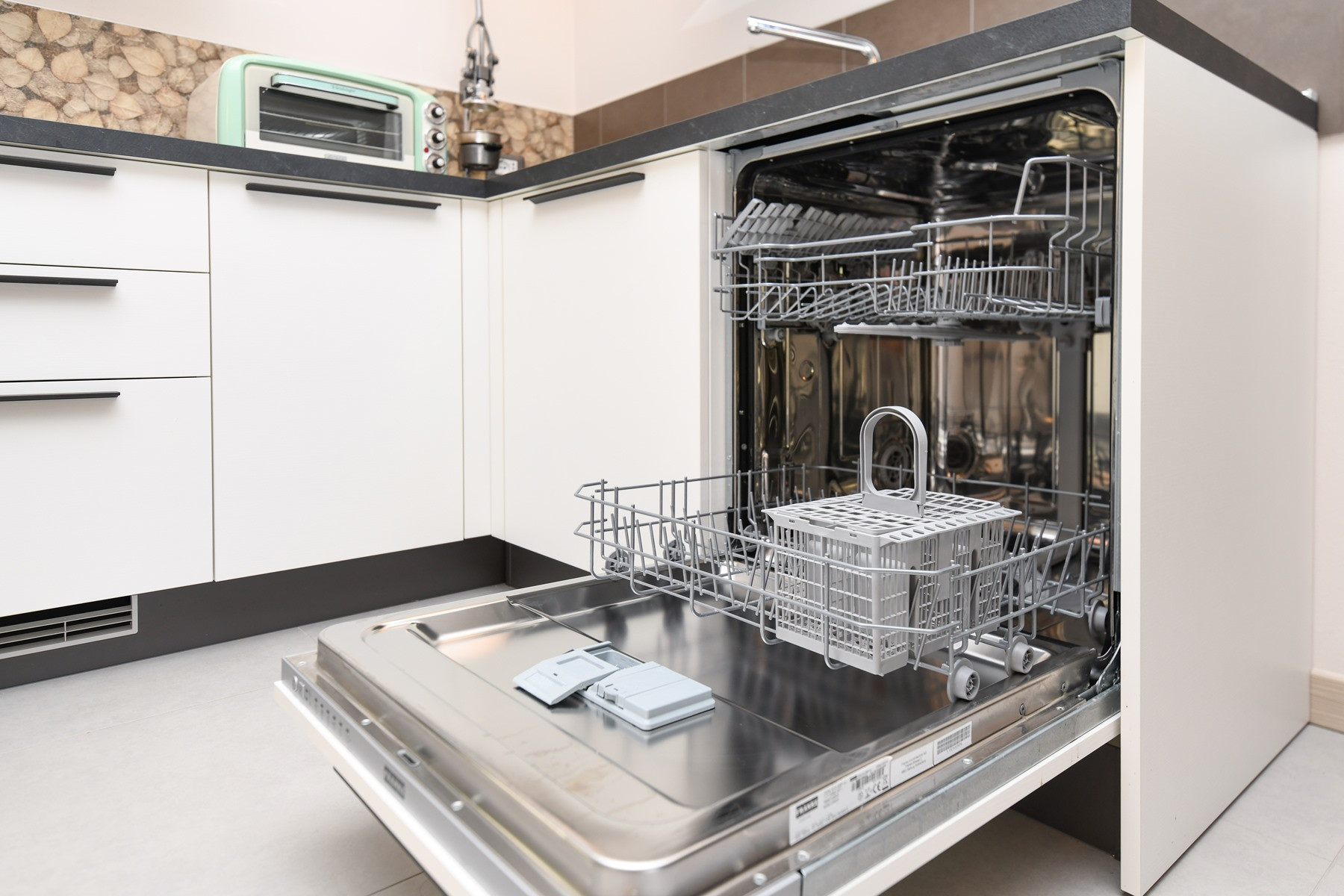 Für eine vierköpfige Familie etwas spärliche Ausstattung der Küche mit Besteck und Töpfen.