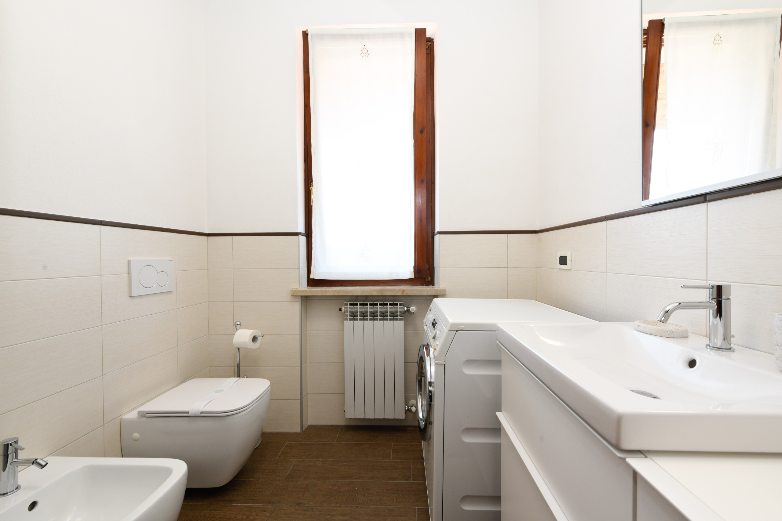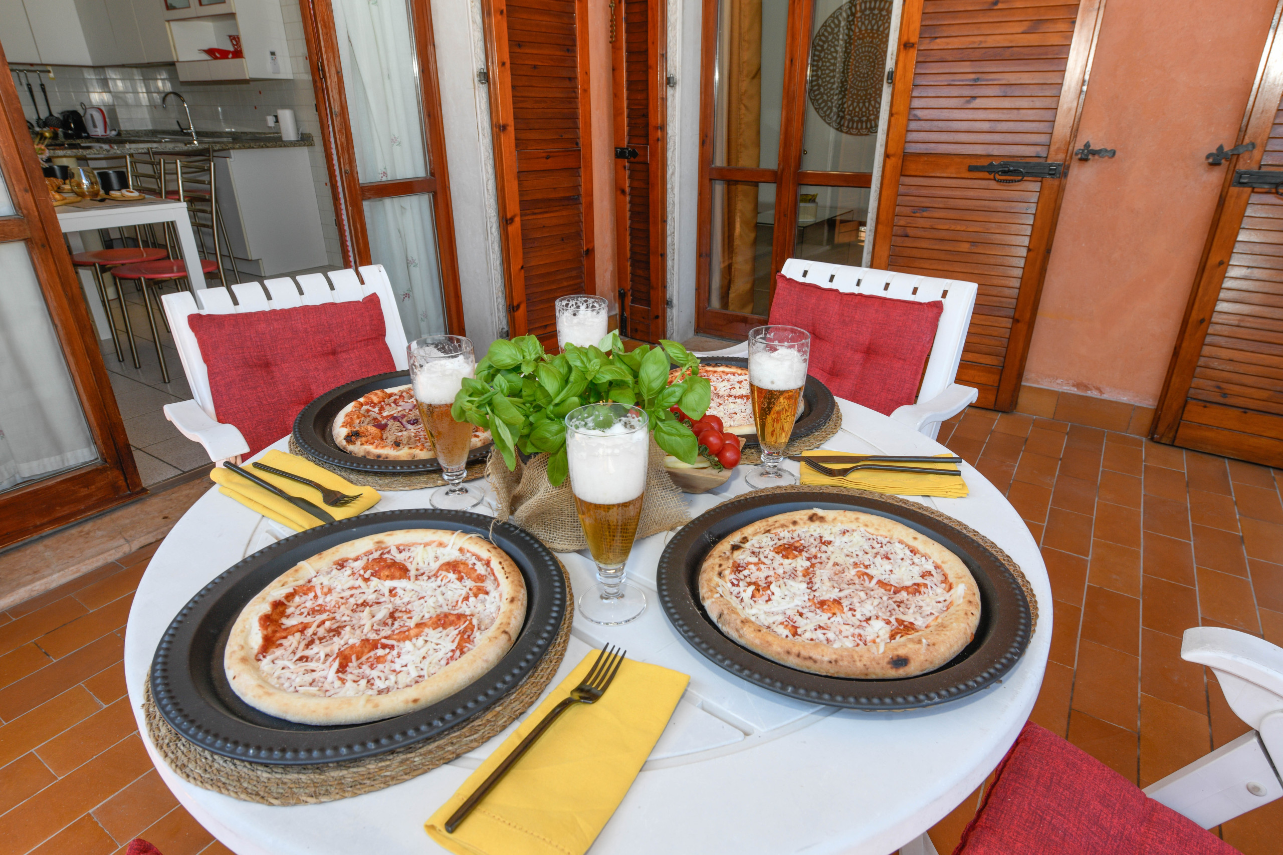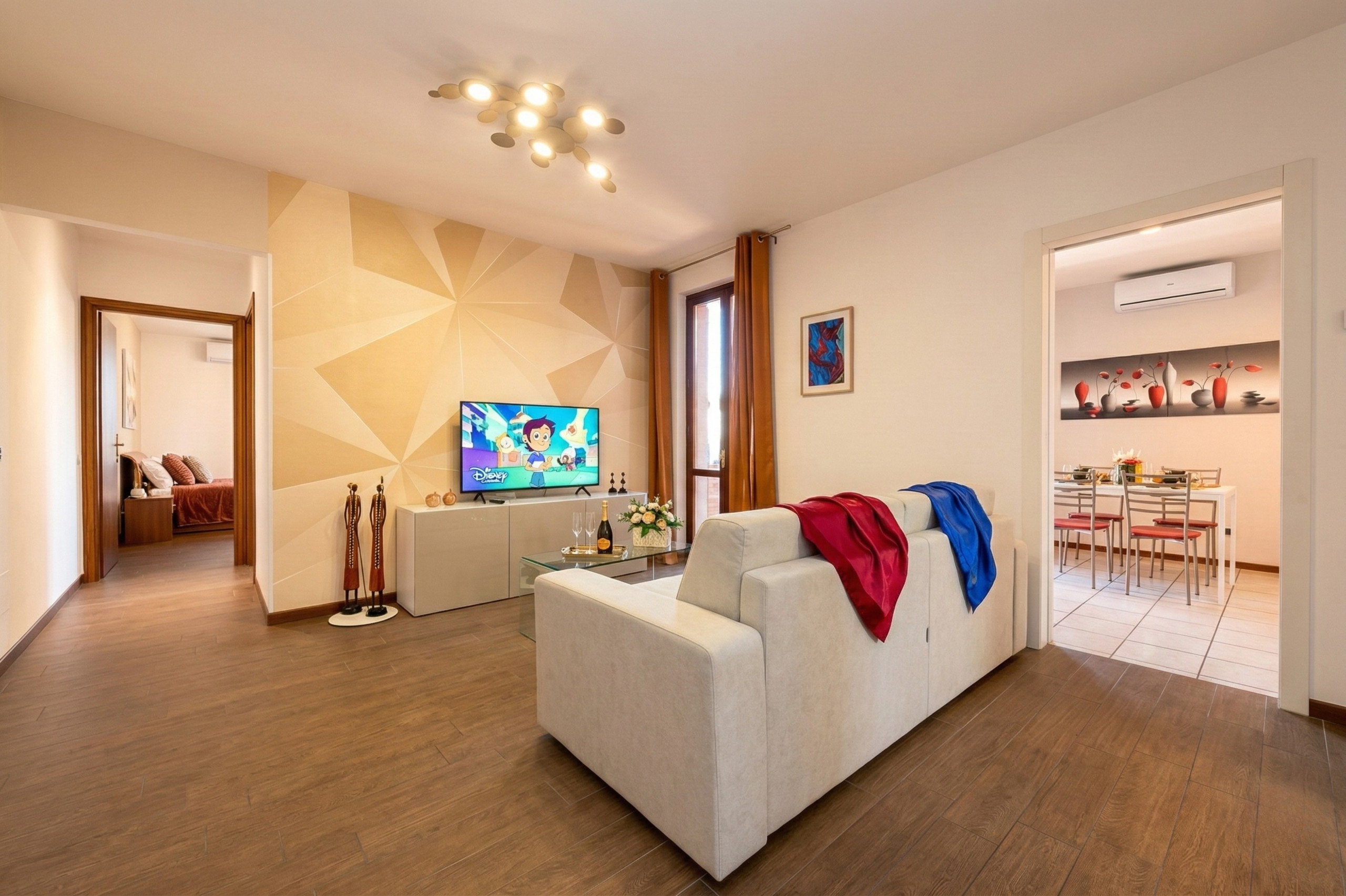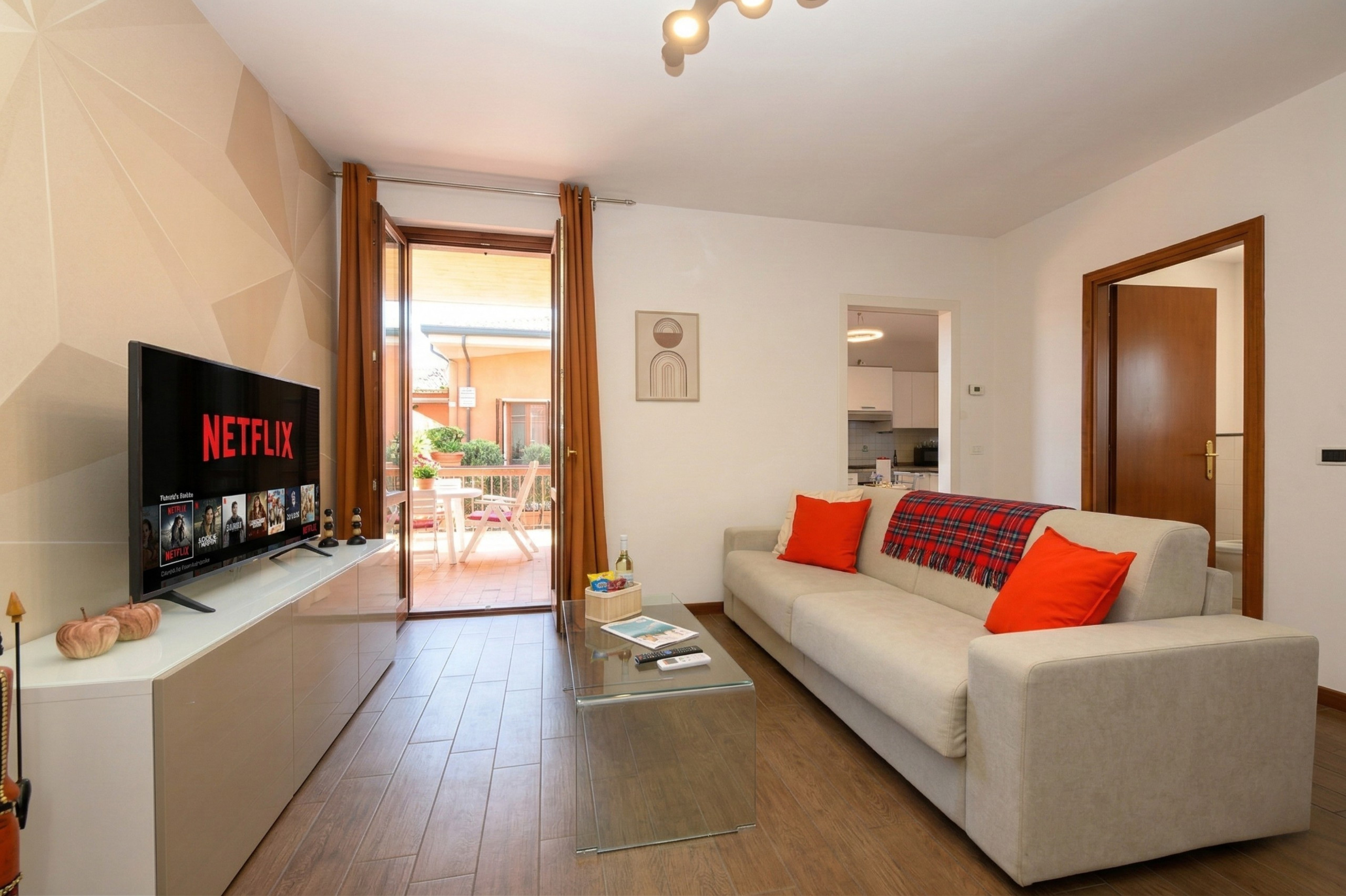 Zaraz po przekroczeniu progu znajdziecie przytulny i jasny salon: superwygodna sofa-łóżko i najnowszej generacji Smart TV czekają na wasze chwile relaksu, czy to wieczory filmowe, czy rozmowy w towarzystwie. Kuchnia, oddzielona, ale zawsze połączona z salonem, jest idealna, by wyrazić waszą kulinarną kreatywność. Znajdziecie ekspres do kawy Nespresso, by obudzić się w najlepszy sposób, tradycyjny piekarnik i mikrofalówkę dla każdej potrzeby, a także zmywarkę i pojemną lodówkę: wszystko, czego trzeba, by poczuć się jak w domu, nawet daleko od domu.