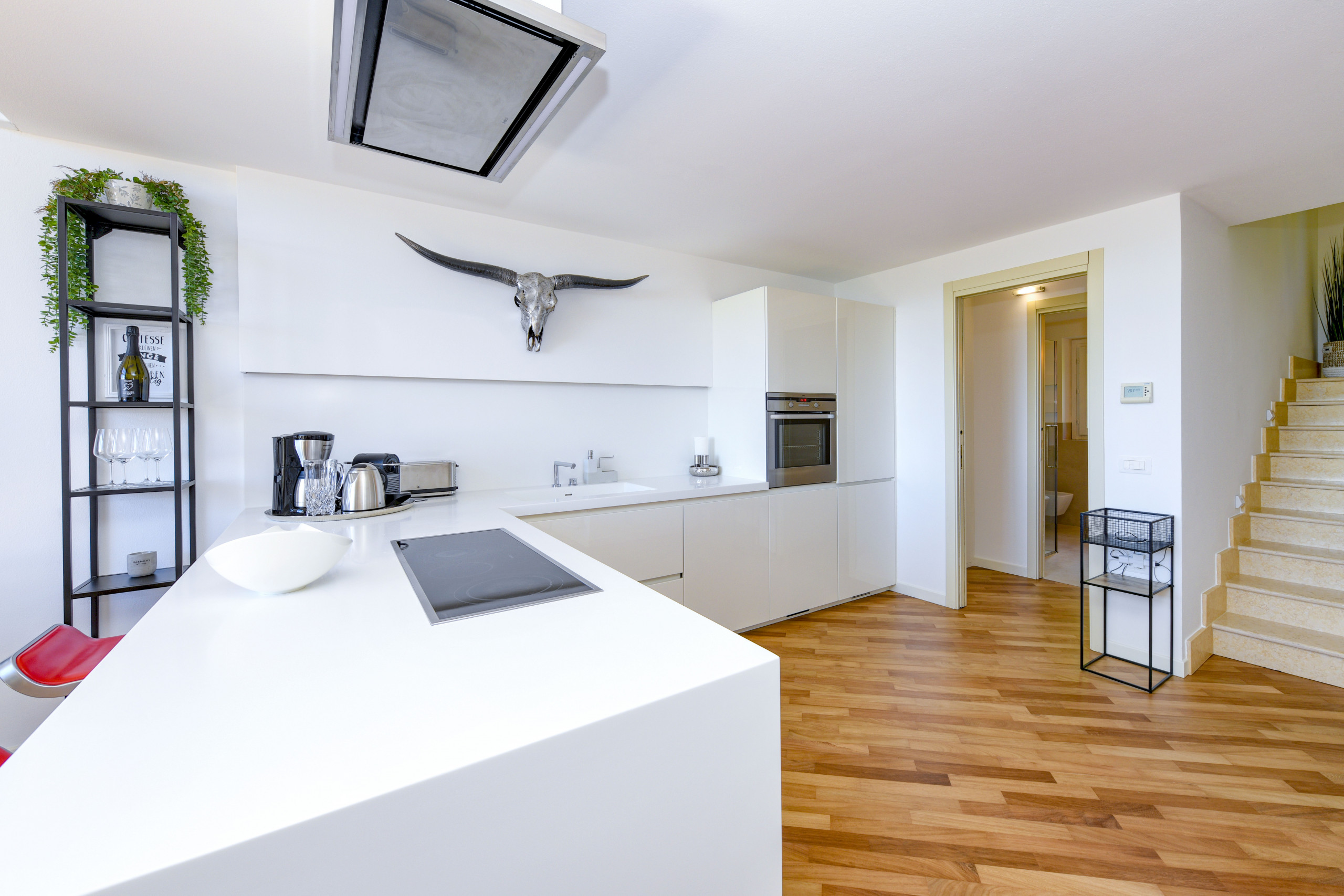 Kuchnia otwarta od płyta indukcyjna, jest wyposażone w chłodziarka, piekarnik, zamrażarka, zmywarka, naczynia/sztućce, ekspres do kawy, opiekacz/toster i czajnik.