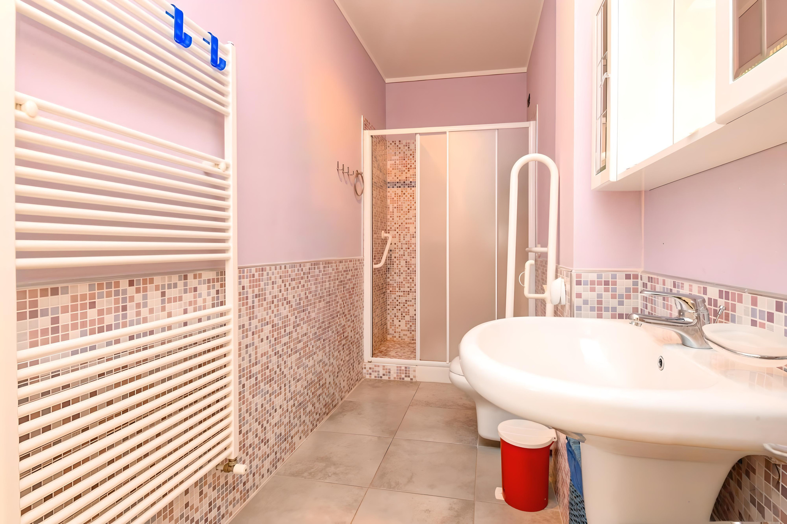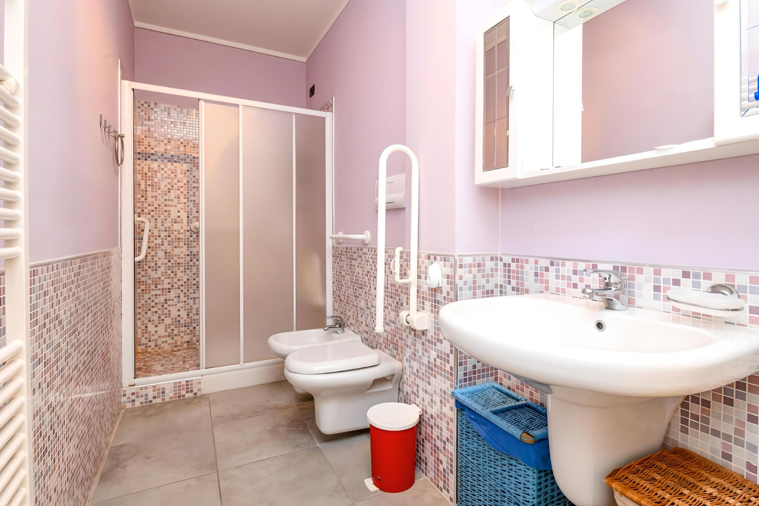 Łazienka apartamentu jest przestronna i funkcjonalna, wyposażona w nowoczesny prysznic, toaletę z uchwytami dla niepełnosprawnych, bidet i pralkę, oferując maksymalną wygodę również tym z szczególnymi potrzebami. Wybór każdego elementu został przemyślany, aby zapewnić przyjemny i bezstresowy pobyt, sprawiając, że goście czują się zawsze komfortowo.