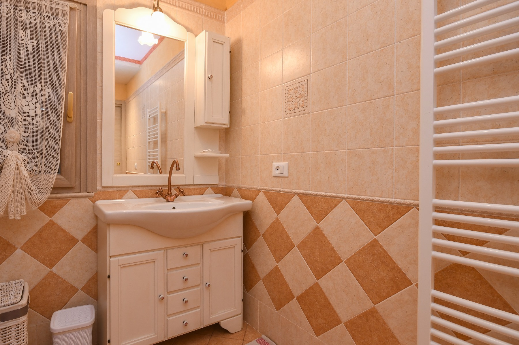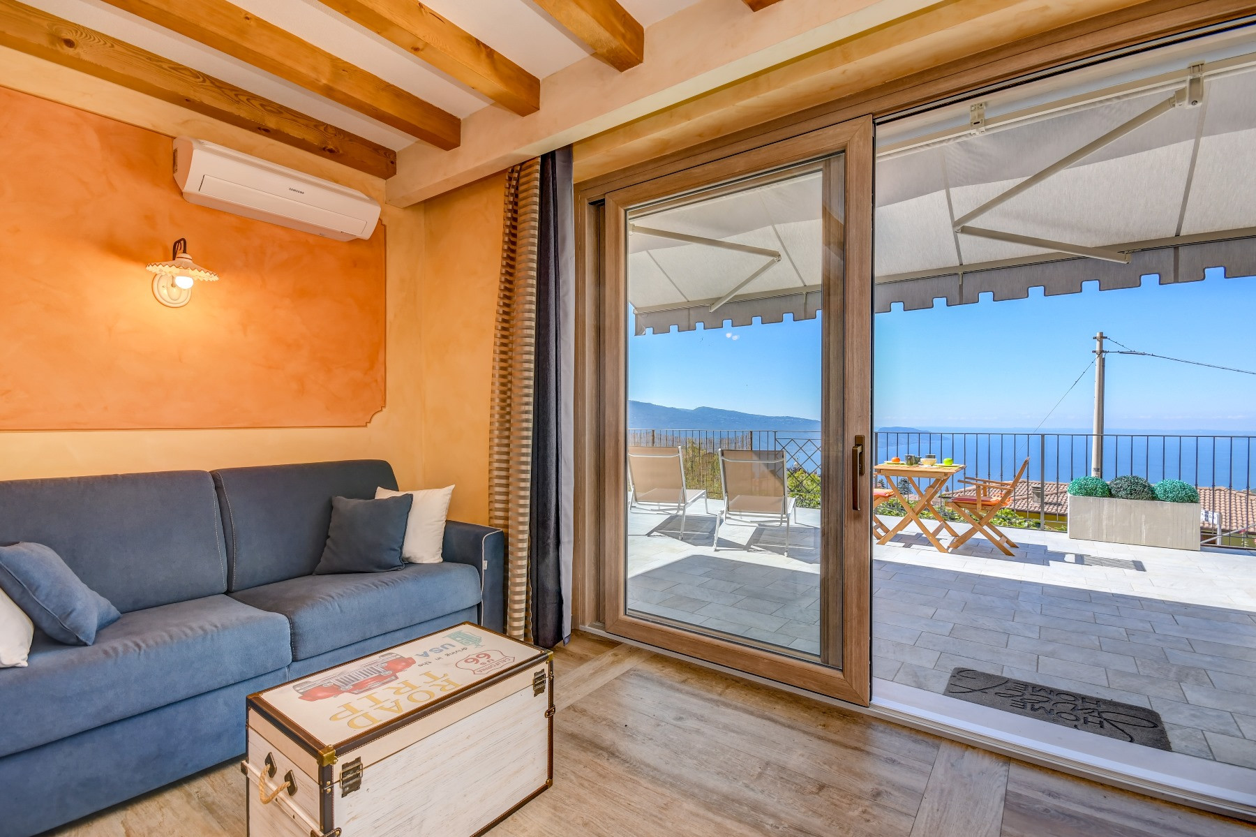 Das Schlafzimmer hatte zwar 2 Fenster. Eines war jedoch nur eine Luke über dem Bett mit Buntglas und das andere führte in einen schmalen Gang, welcher wiederum auf die Terrasse führte. Dadurch kam kein Tageslicht in das Schlafzimmer und man konnte nicht so recht lüften. Das war ein bisschen schade, architektonisch aber nicht anders lösbar. Von daher kam die Klimaanlage in den Einsatz.