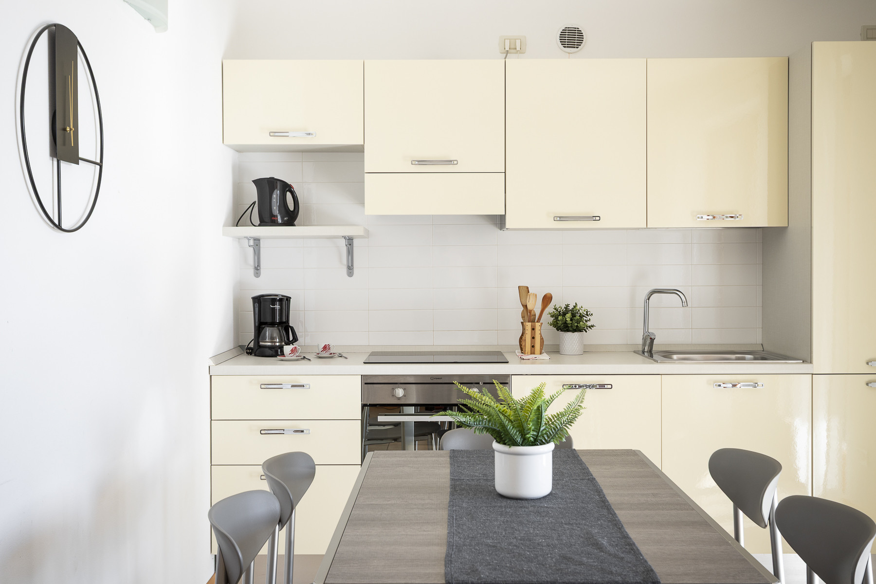 Niezależna kuchnia od kuchenka gazowa, jest wyposażone w chłodziarka, piekarnik, zamrażarka, zmywarka, naczynia/sztućce, ekspres do kawy, opiekacz/toster i czajnik.