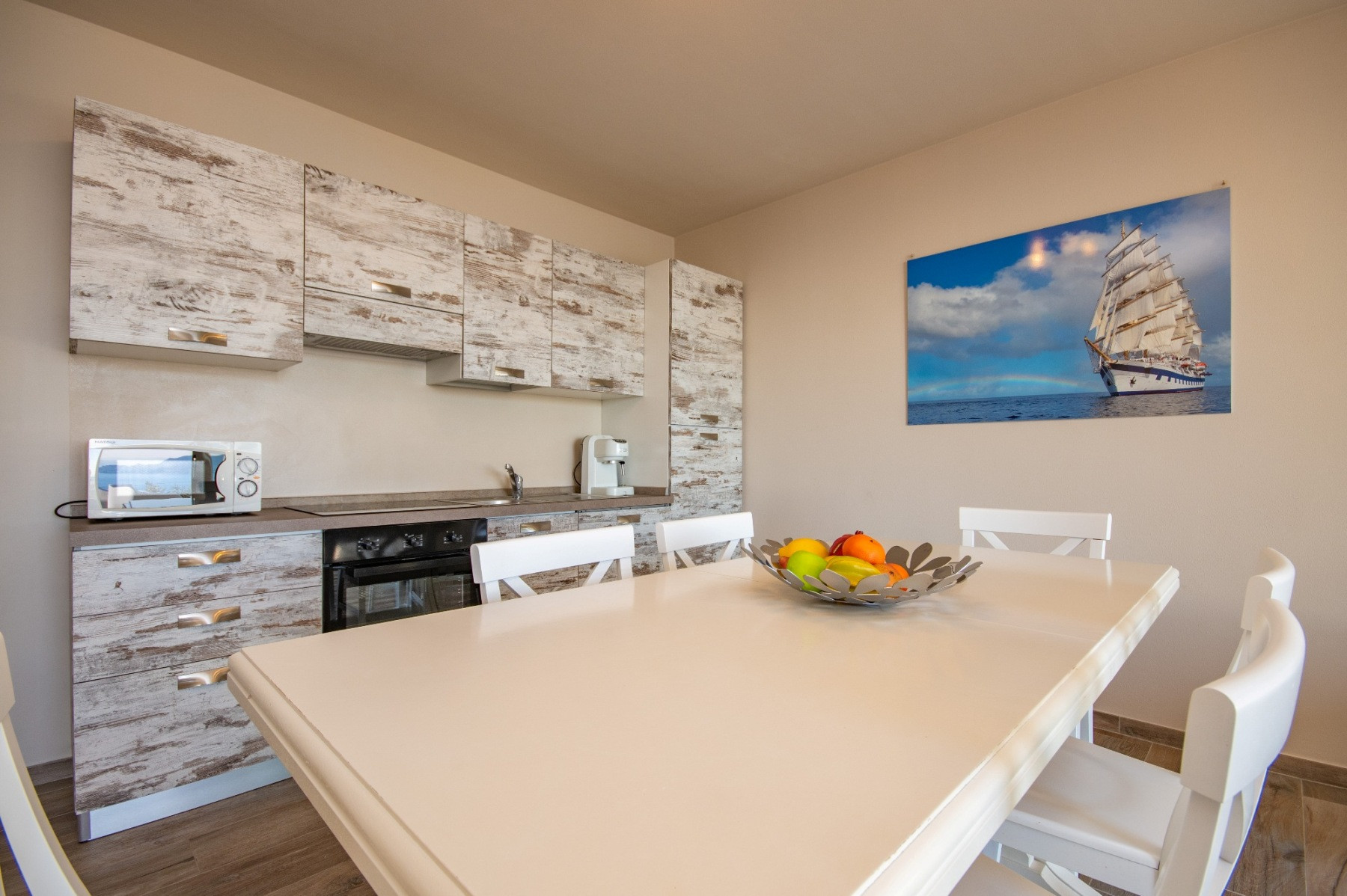 Niezależna kuchnia od płyta indukcyjna, jest wyposażone w chłodziarka, piekarnik, zamrażarka, zmywarka, naczynia/sztućce, ekspres do kawy, opiekacz/toster i sokowirówka.