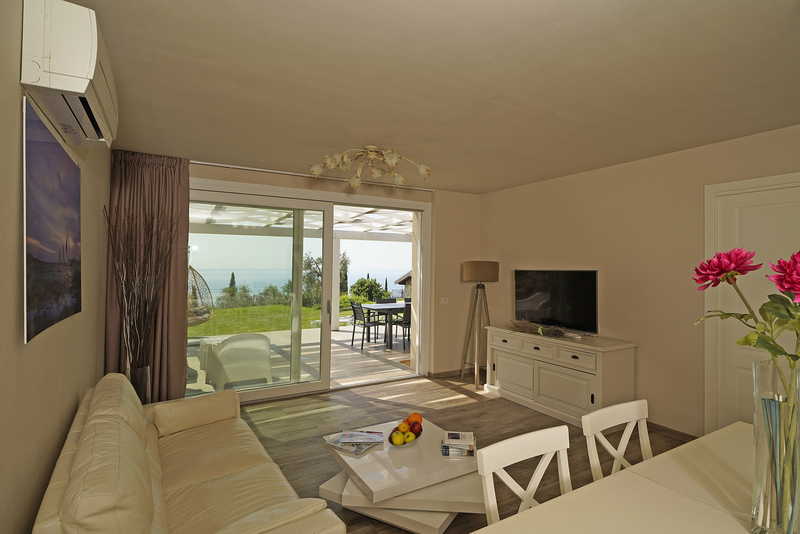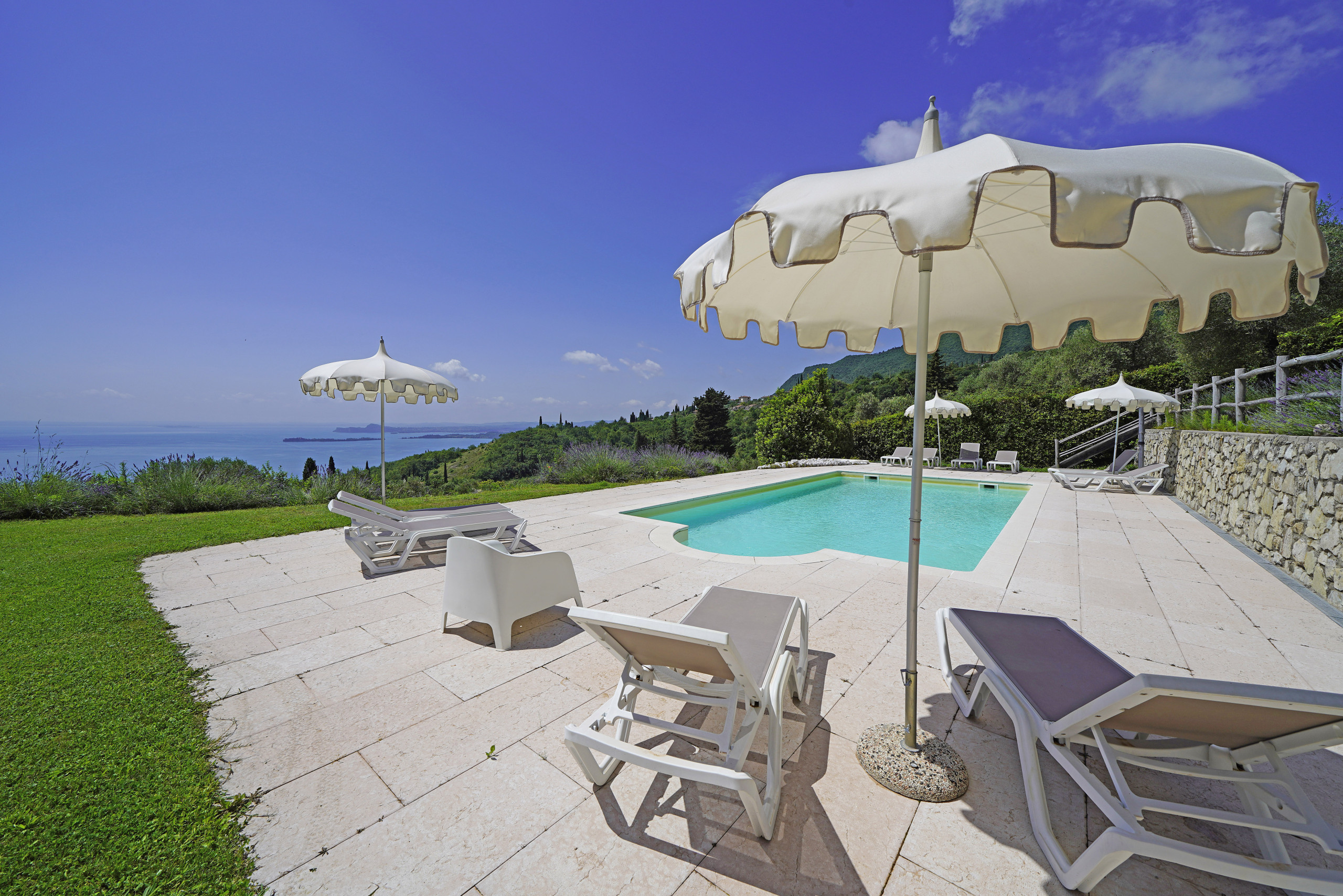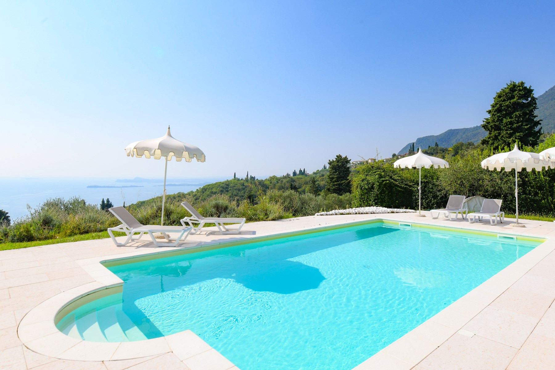 absolut ruhige Lage auf einem sehr großen Privatgrundstück mit Olivenbäumen und Säulenpinien, einzigartiger Blick über den Gardasee, modern eingerichtete Wohnung mit zwei sehr schönen Bädern, drei Schlafzimmer davon eins mit Seeblick aus dem Bett, eizobacz więcej