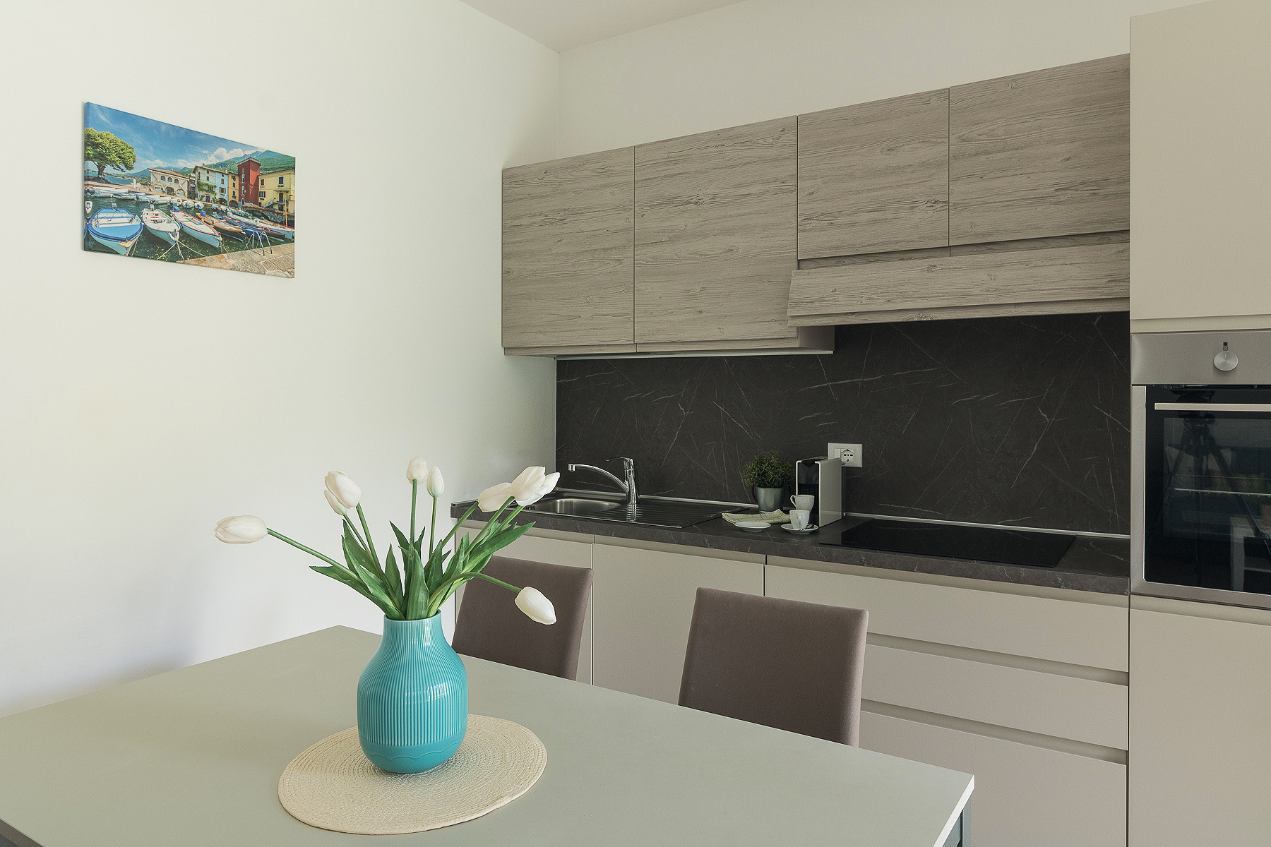 Niezależna kuchnia od płyta indukcyjna, jest wyposażone w chłodziarka, piekarnik, zamrażarka, zmywarka, naczynia/sztućce, ekspres do kawy i opiekacz/toster.