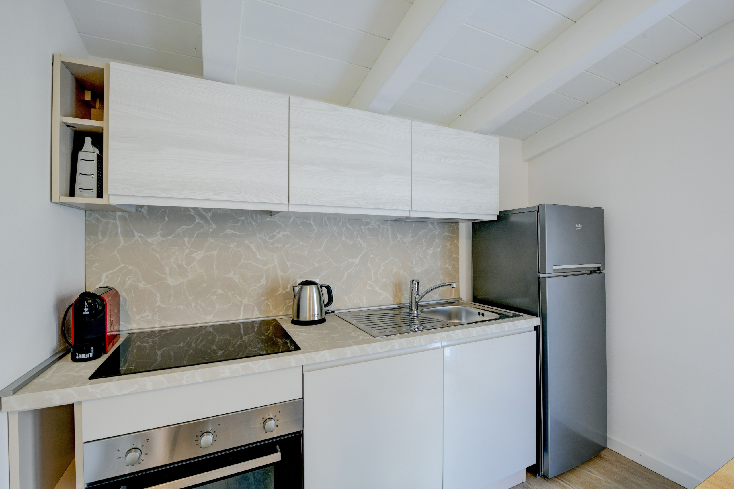 Niezależna kuchnia od płyta indukcyjna, jest wyposażone w chłodziarka, piekarnik, zamrażarka, zmywarka, naczynia/sztućce, ekspres do kawy i opiekacz/toster.