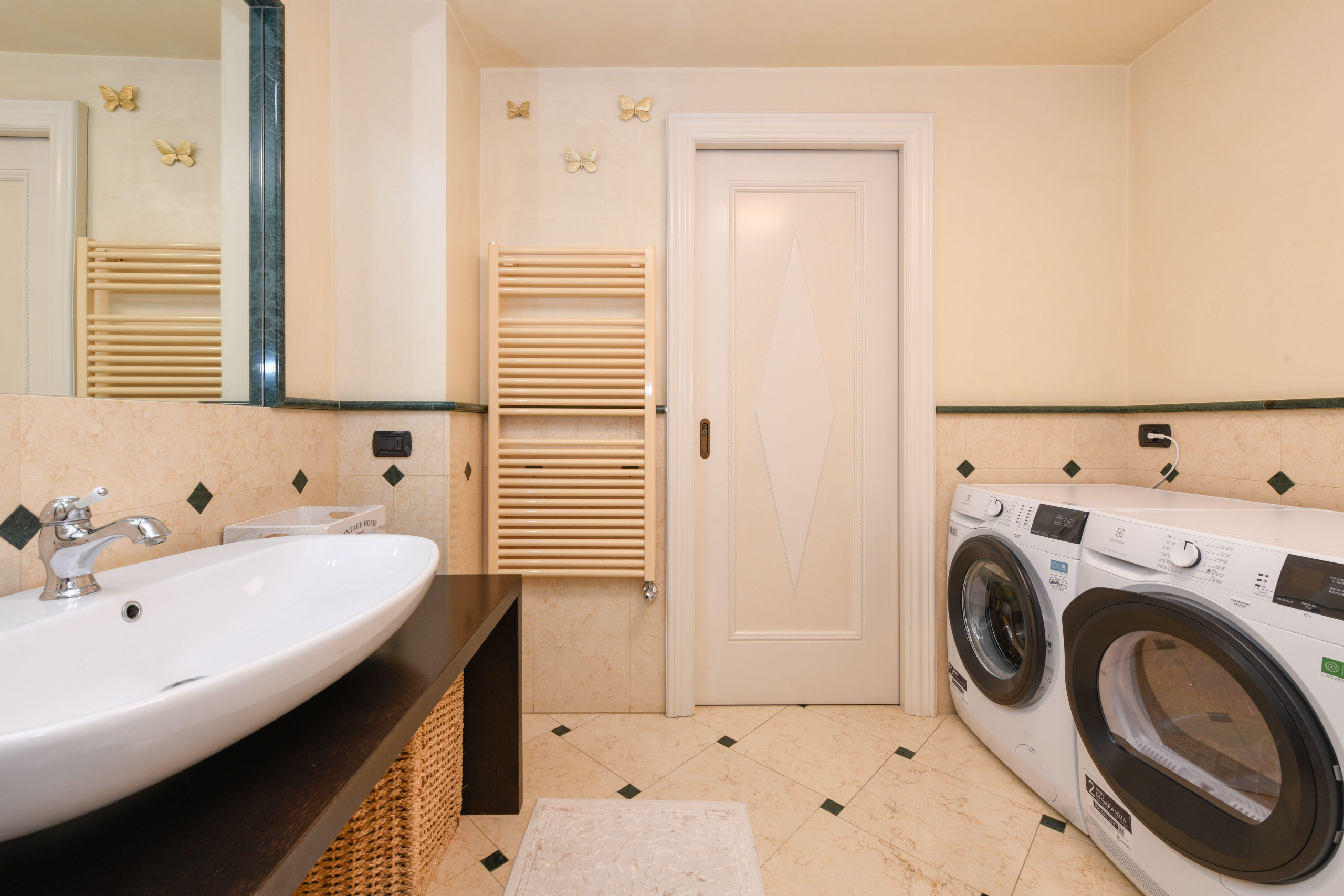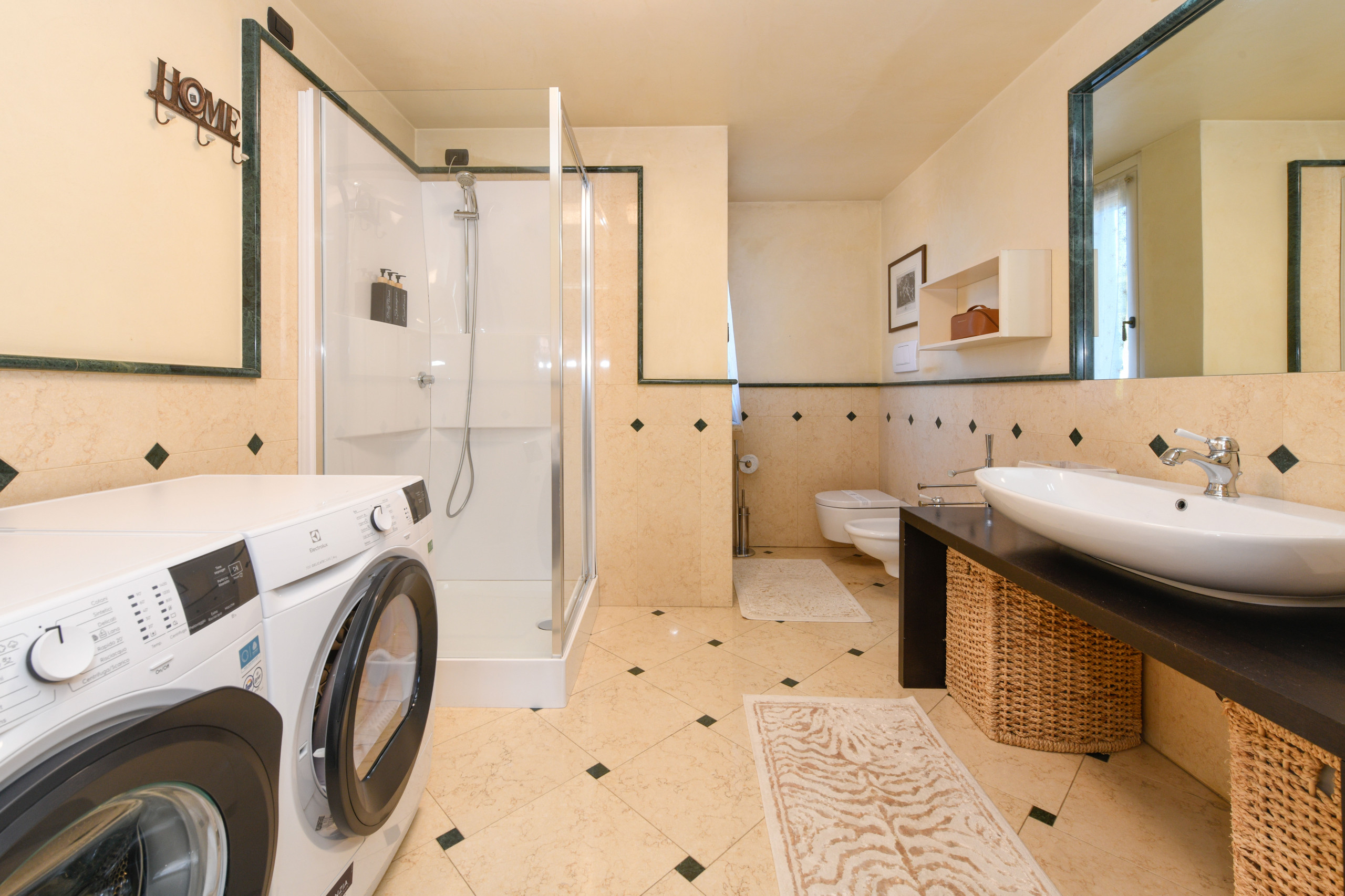Aby uzupełnić przestrzeń, znajduje się druga pełna łazienka, wyposażona również w pralkę i suszarkę, pomyślana, aby praktycznie towarzyszyć dłuższym pobytom.