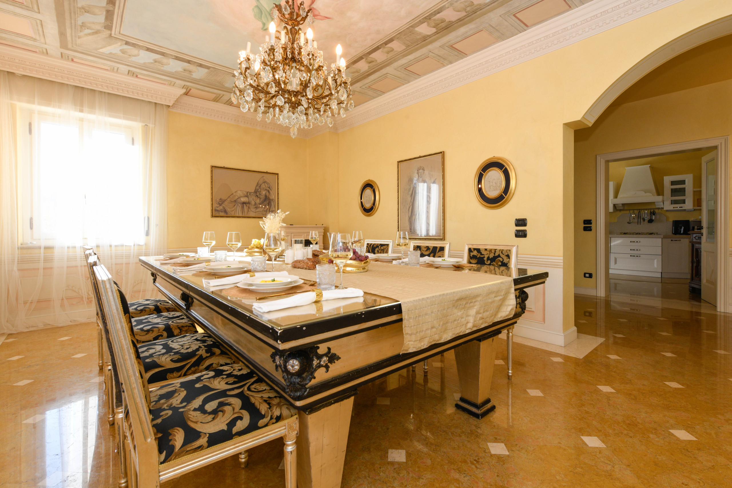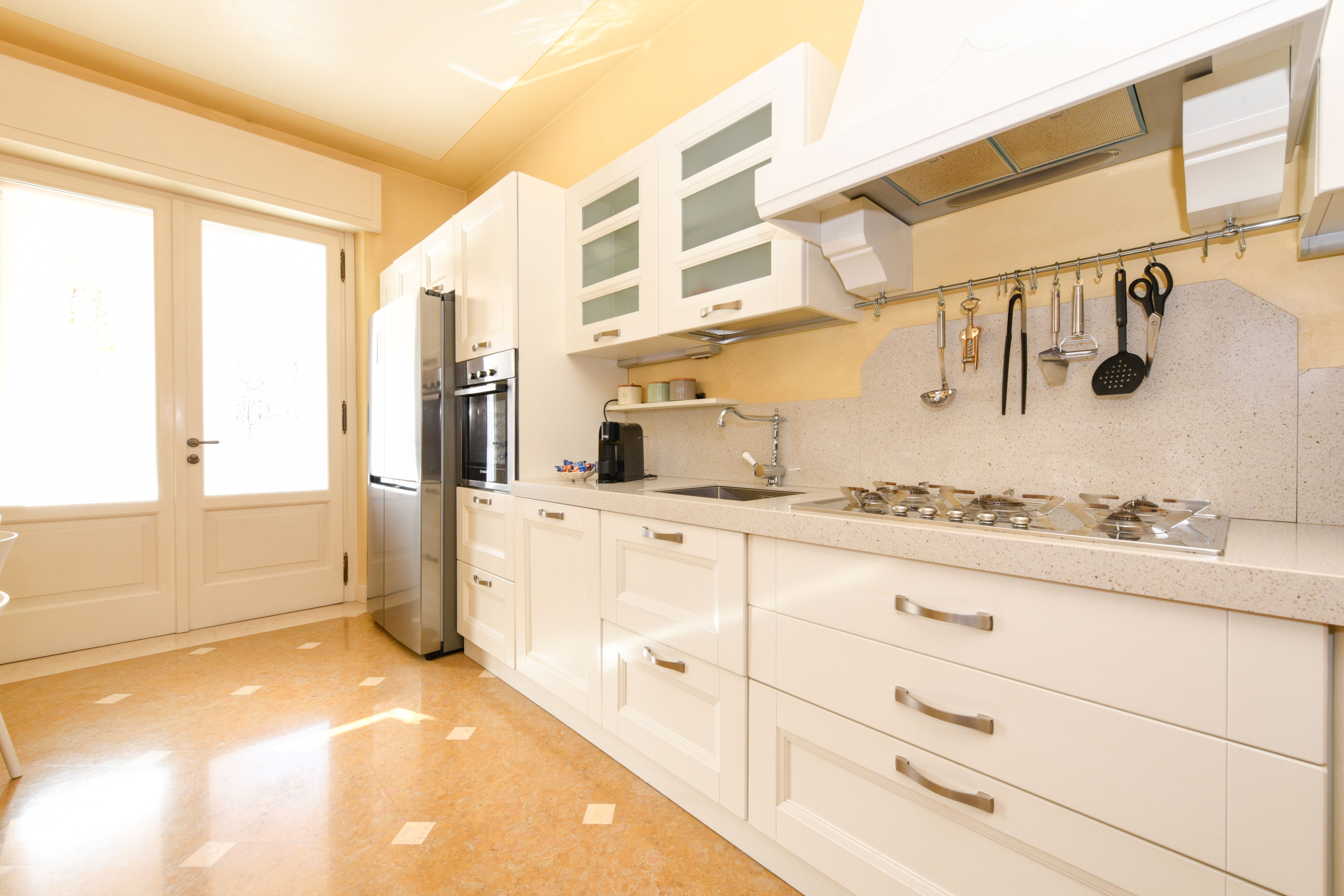 Kuchnia, przylegająca, ale oddzielona od salonu, jest w pełni wyposażona i zaprojektowana dla miłośników wspólnego biesiadowania: zmywarka, mikrofalówka, frytkownica, czajnik, ekspres do kawy i szeroki zestaw akcesoriów pozwalają z łatwością przejść od nieformalnego śniadania do bardziej wyrafinowanej kolacji.