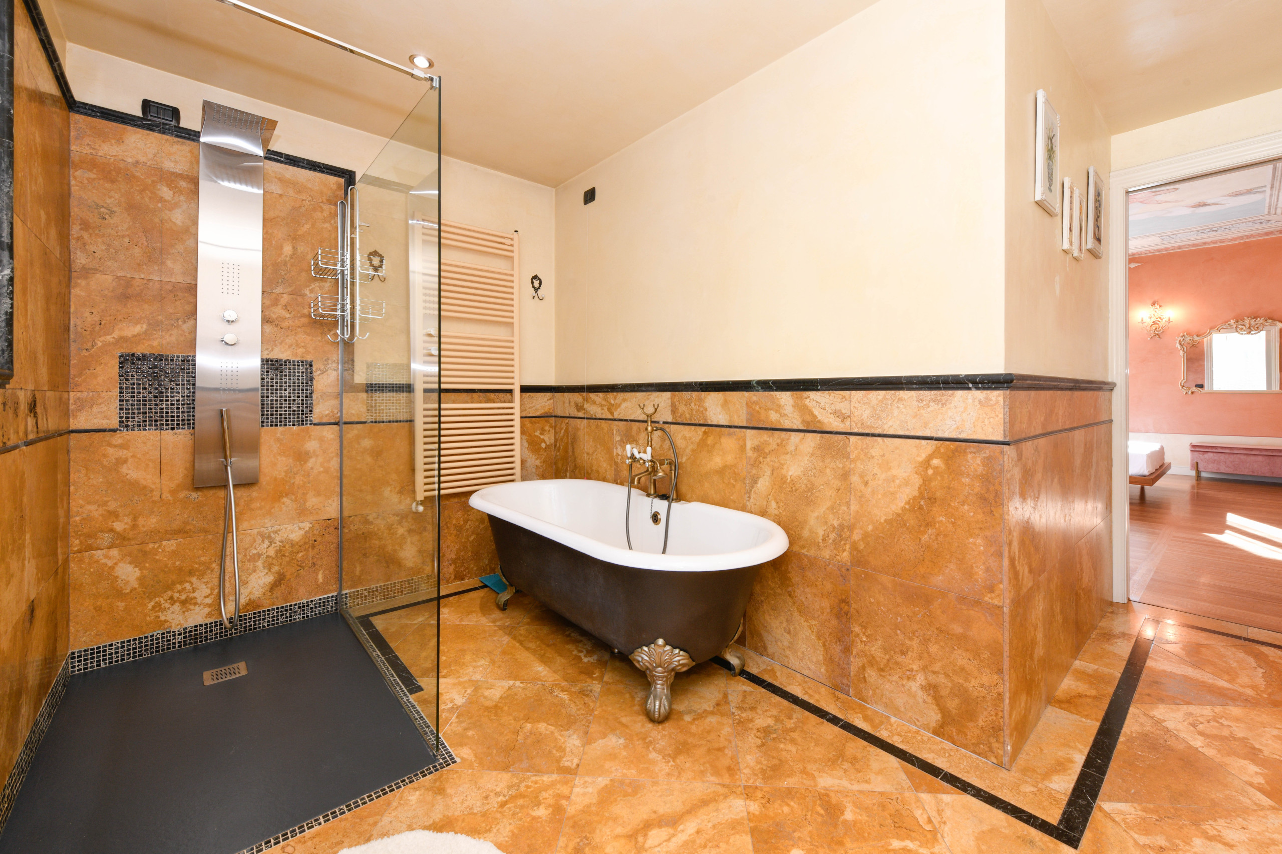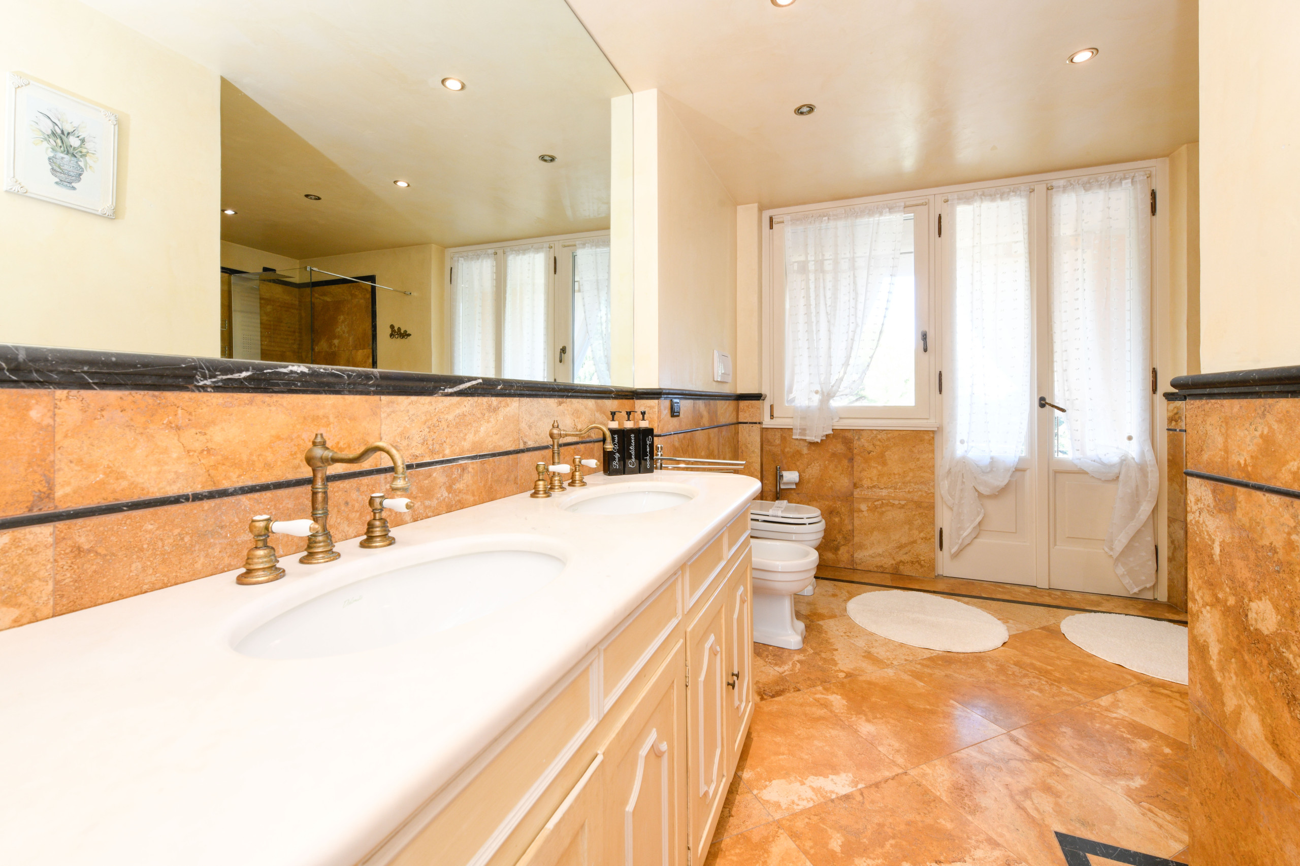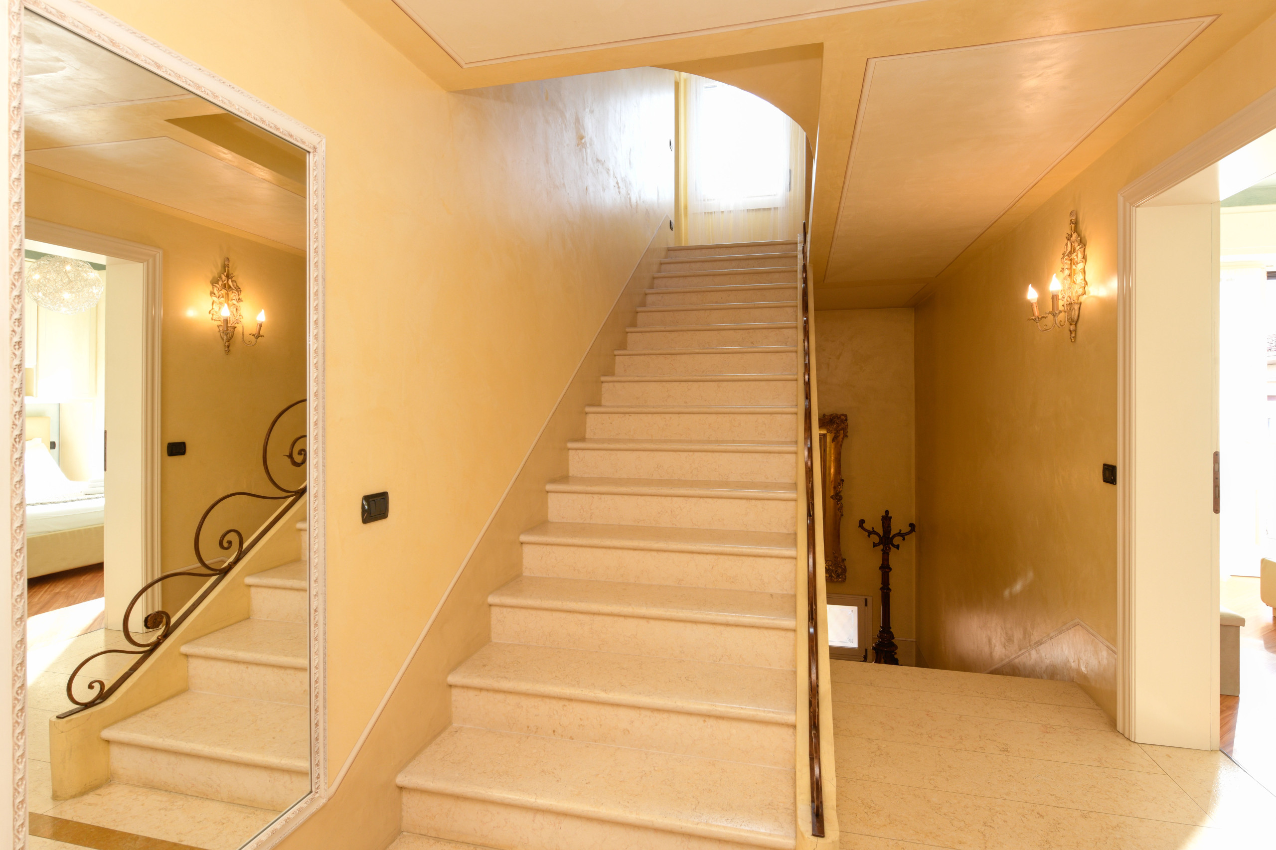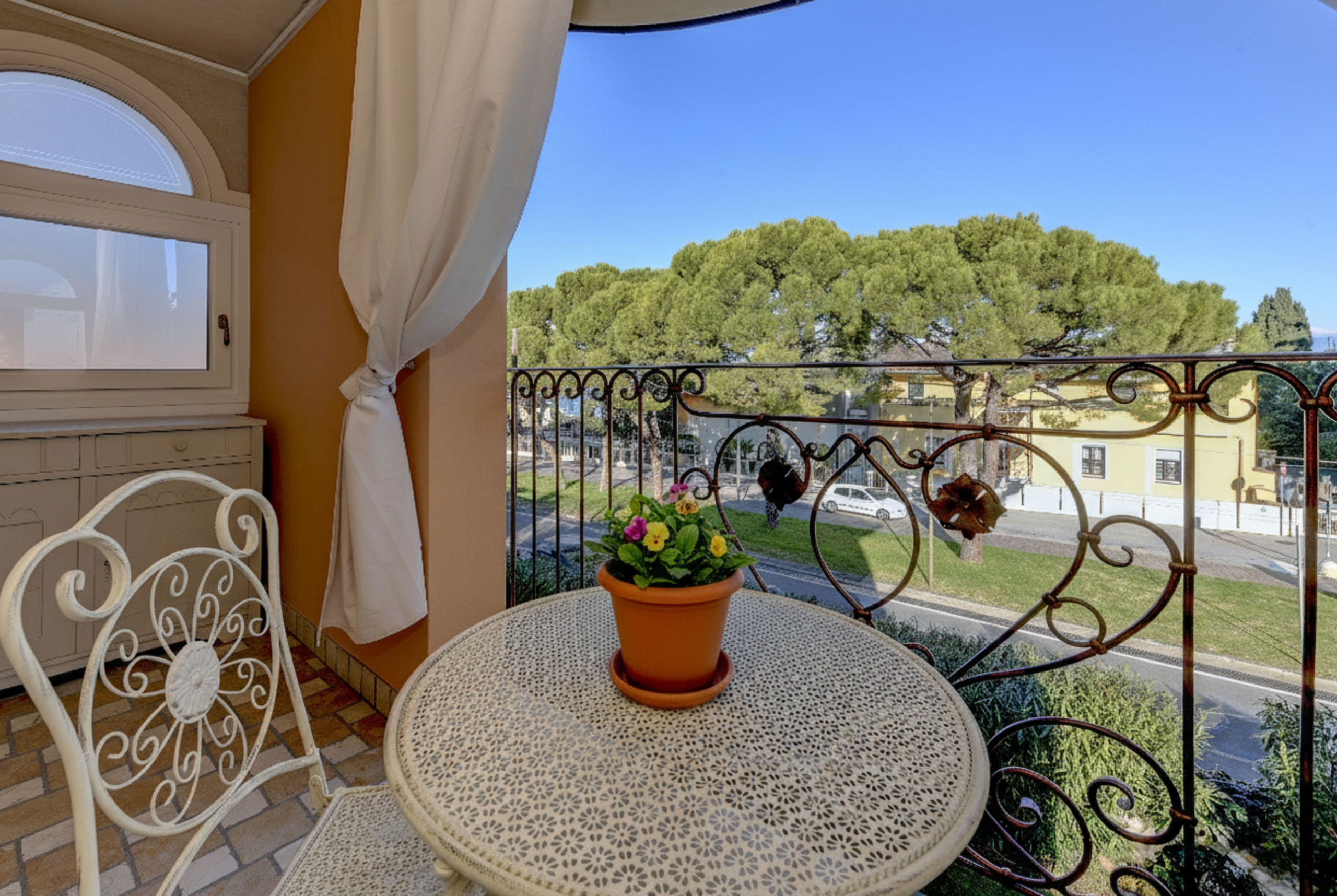 Pokój główny to eleganckie serce piętra: wyrafinowany fresk na suficie oprawia małżeńskie łoże i tworzy wyjątkową atmosferę, łącząc klasyczny urok z nowoczesnym komfortem, podczas gdy prywatna, obszerna i doskonale wyposażona łazienka oferuje podwójną umywalkę, prysznic walk-in i wspaniałą wannę idealną do chwili relaksu po dniu spędzonym wśród miasteczek, plaż i krajobrazów Garda. Z łazienki można również wyjść na zewnętrzny balkonik, idealny na poranną kawę lub delektowanie się ciszą wieczornych godzin.