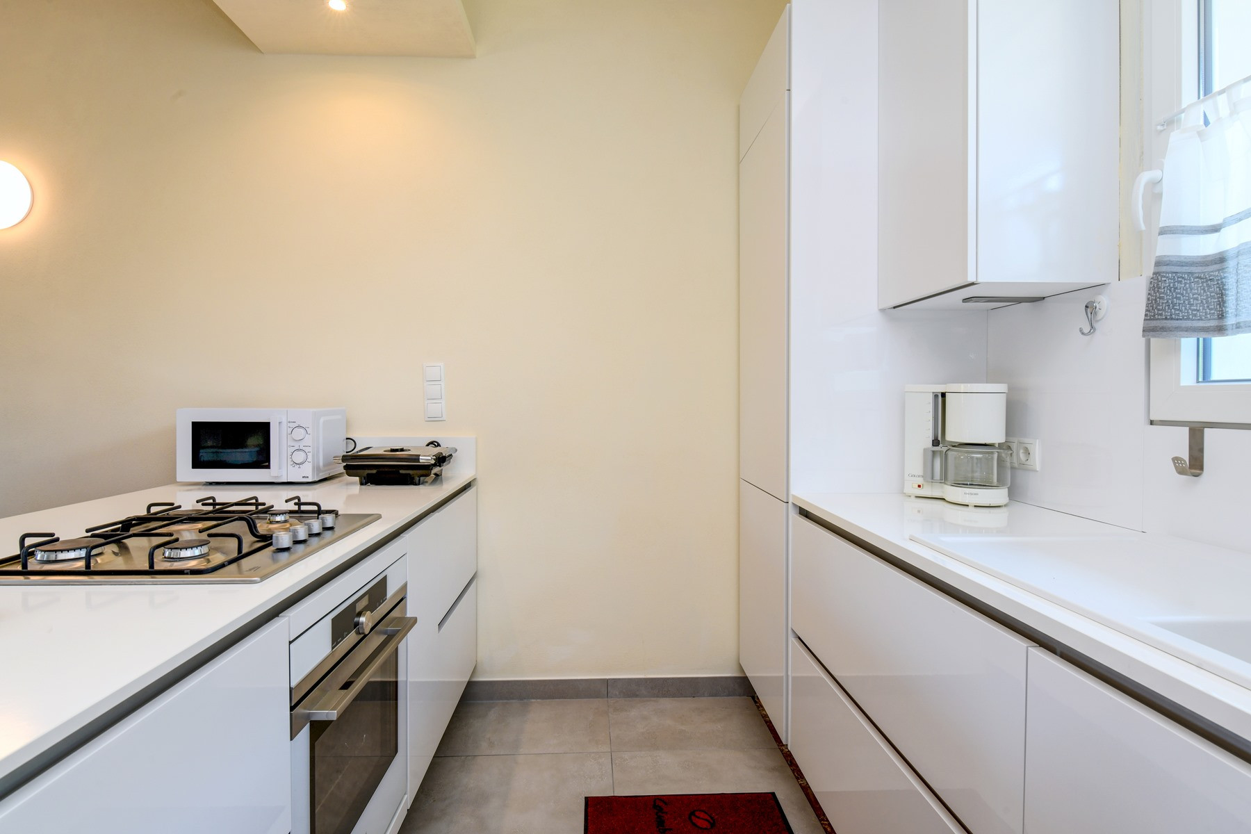 Kuchnia otwarta od kuchenka gazowa, jest wyposażone w chłodziarka, mikrofalówka, piekarnik, zamrażarka, zmywarka, naczynia/sztućce, ekspres do kawy, opiekacz/toster i czajnik.
