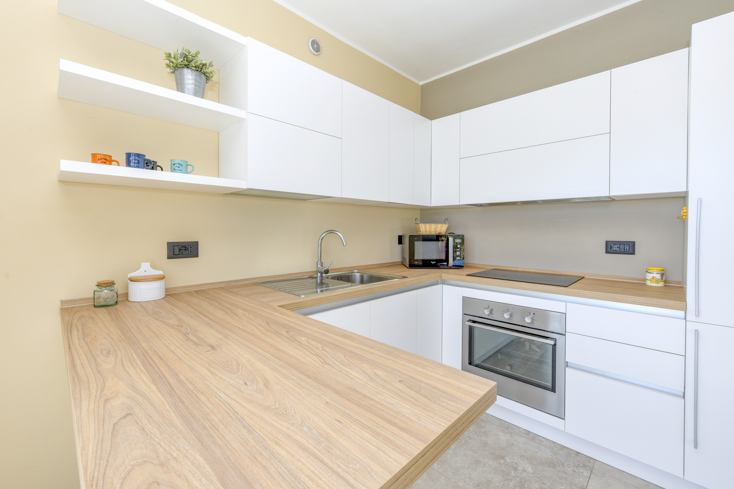Kuchnia otwarta od płyta indukcyjna, jest wyposażone w chłodziarka, mikrofalówka, piekarnik, zamrażarka, zmywarka, naczynia/sztućce, ekspres do kawy, opiekacz/toster i czajnik.