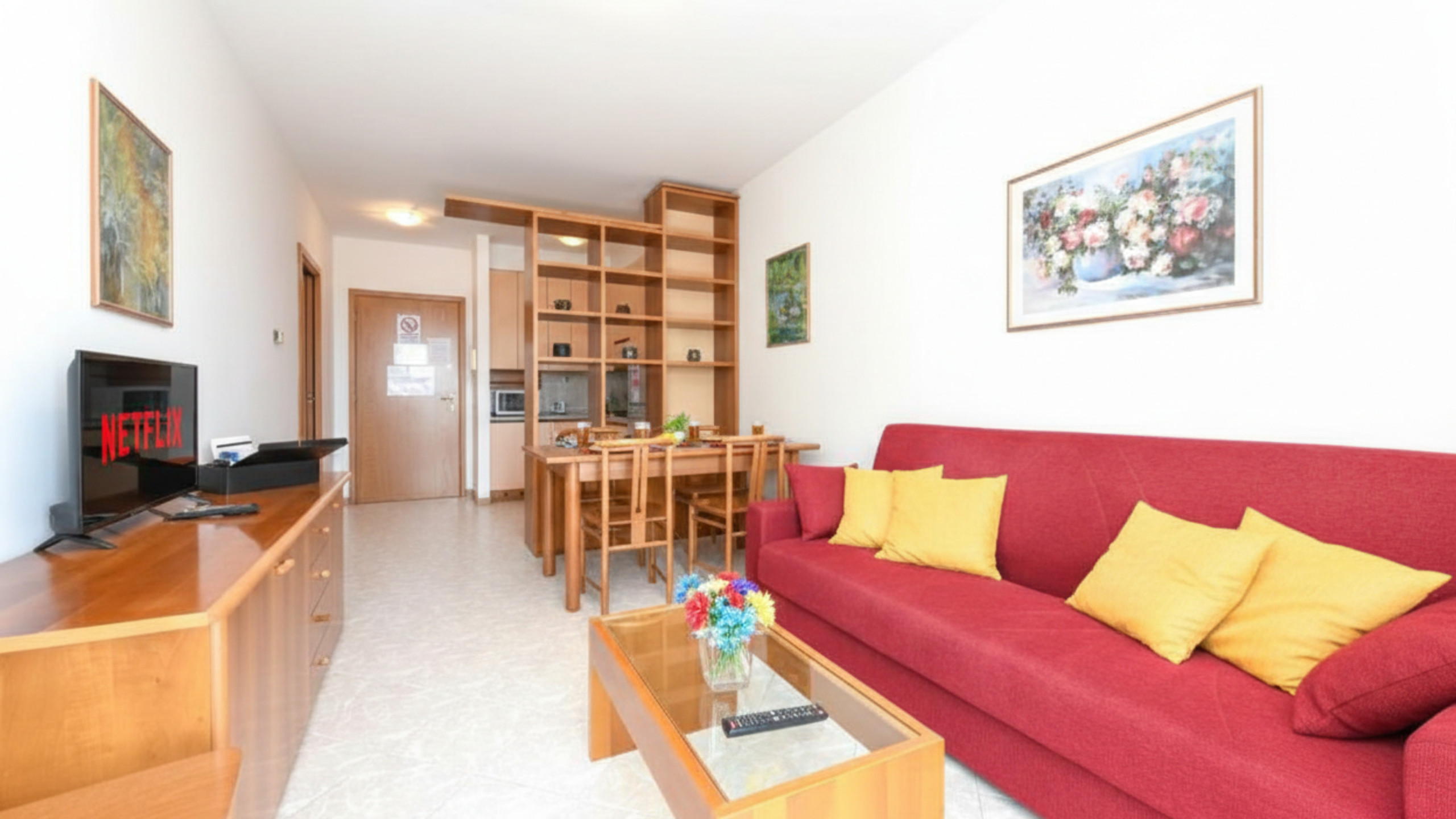 We wnętrzu klasyczny i funkcjonalny wystrój został zaprojektowany, aby zapewnić maksymalny komfort. Aneks kuchenny jest dobrze wyposażony w lodówkę, płytę grzewczą, mikrofalówkę i naczynia, pozwalając gościom na łatwe przygotowanie posiłków. Salon, jasny i przestronny, jest wyposażony w rozkładaną sofę małżeńską, idealną do relaksu po dniu zwiedzania. Dzięki drzwiom balkonowym salon otwiera się na taras, zalewając wnętrze naturalnym światłem.