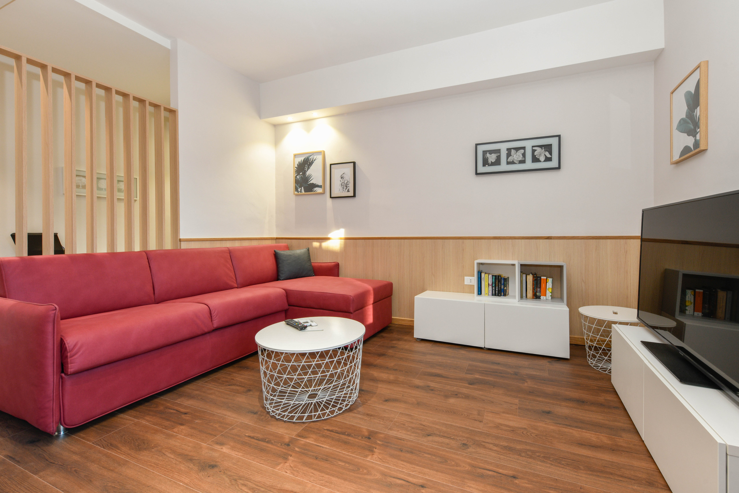 El apartamento completo. Diseño de las habitaciones y baños. Camas muy comodas. Tranquilo de ruidos y muy cerca del lago. Parking privado a 3 minutos. Lara encantadora. Nos explico perfectamente todo sobre transportes...supermercados...lugares a visitar y cosas que hacer. Muchas Gracias.