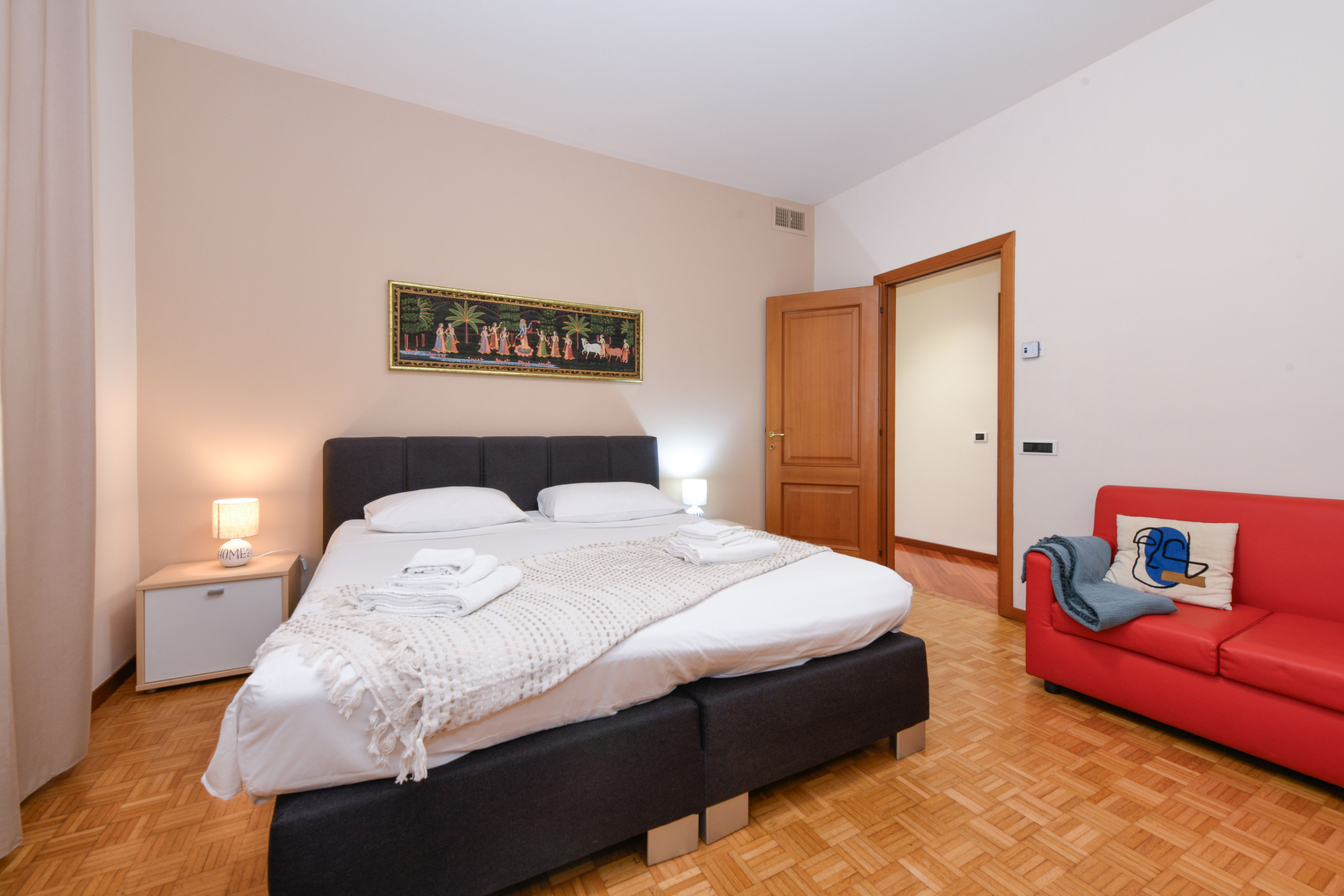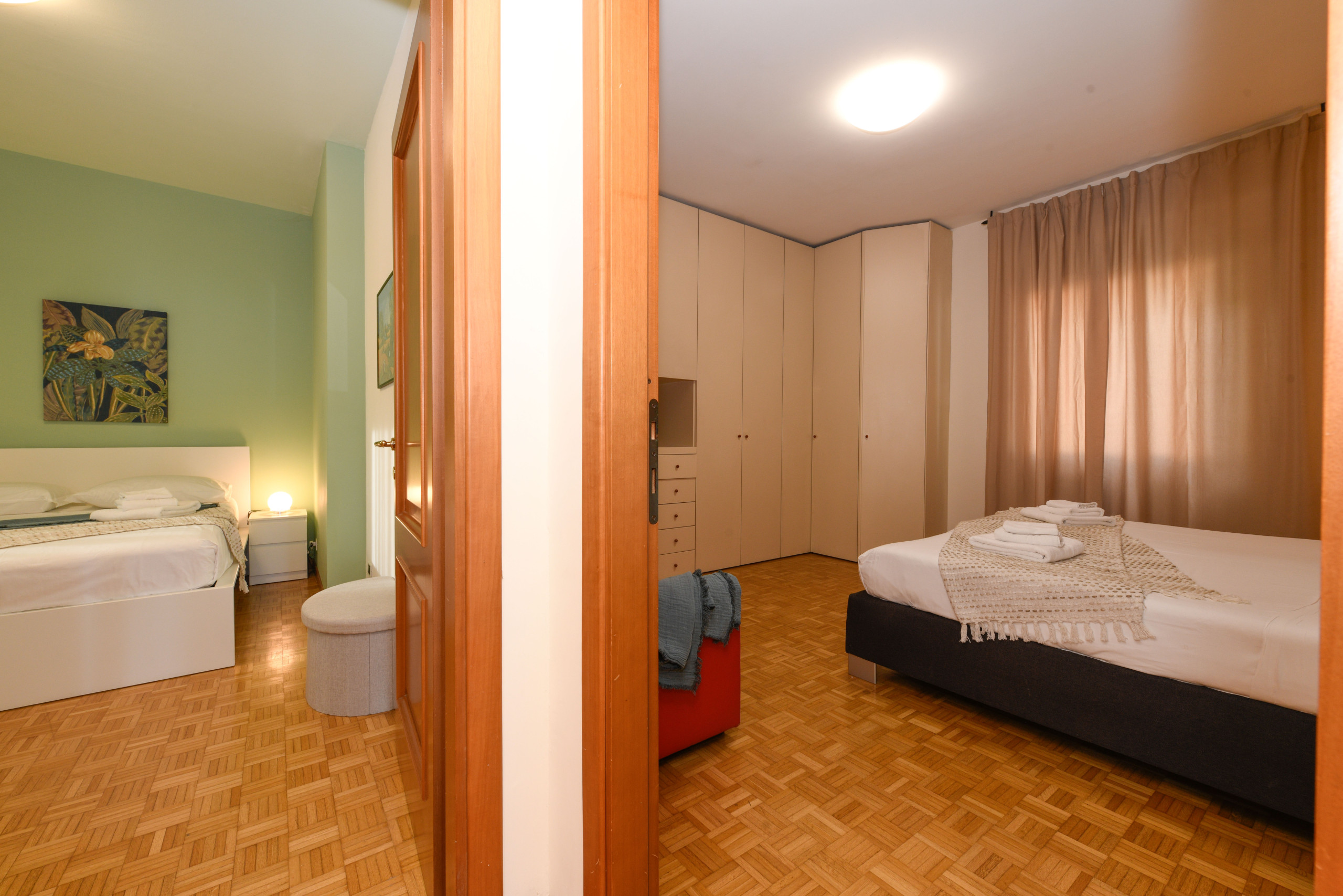 Strefa sypialna składa się z trzech przestronnych i jasnych sypialni małżeńskich, wszystkie wyposażone w obszerne szafy i materace z wysokiej jakości nakładką, zaprojektowane, aby zapewnić maksymalny komfort podczas snu. Główna sypialnia dodatkowo ozdobiona jest 40-calowym smart TV. Każdy szczegół wyposażenia został przemyślany, aby zapewnić relaksujący i komfortowy pobyt. Apartament posiada dwie łazienki, jedną z wanną, umywalką, toaletą i bidetem, oraz drugą z kabiną prysznicową, umywalką i toaletą. Każde pomieszczenie jest jeszcze bardziej komfortowe dzięki klimatyzacji kanałowej, którą można regulować w każdym pokoju, zapewniając maksymalny komfort w każdej porze roku.