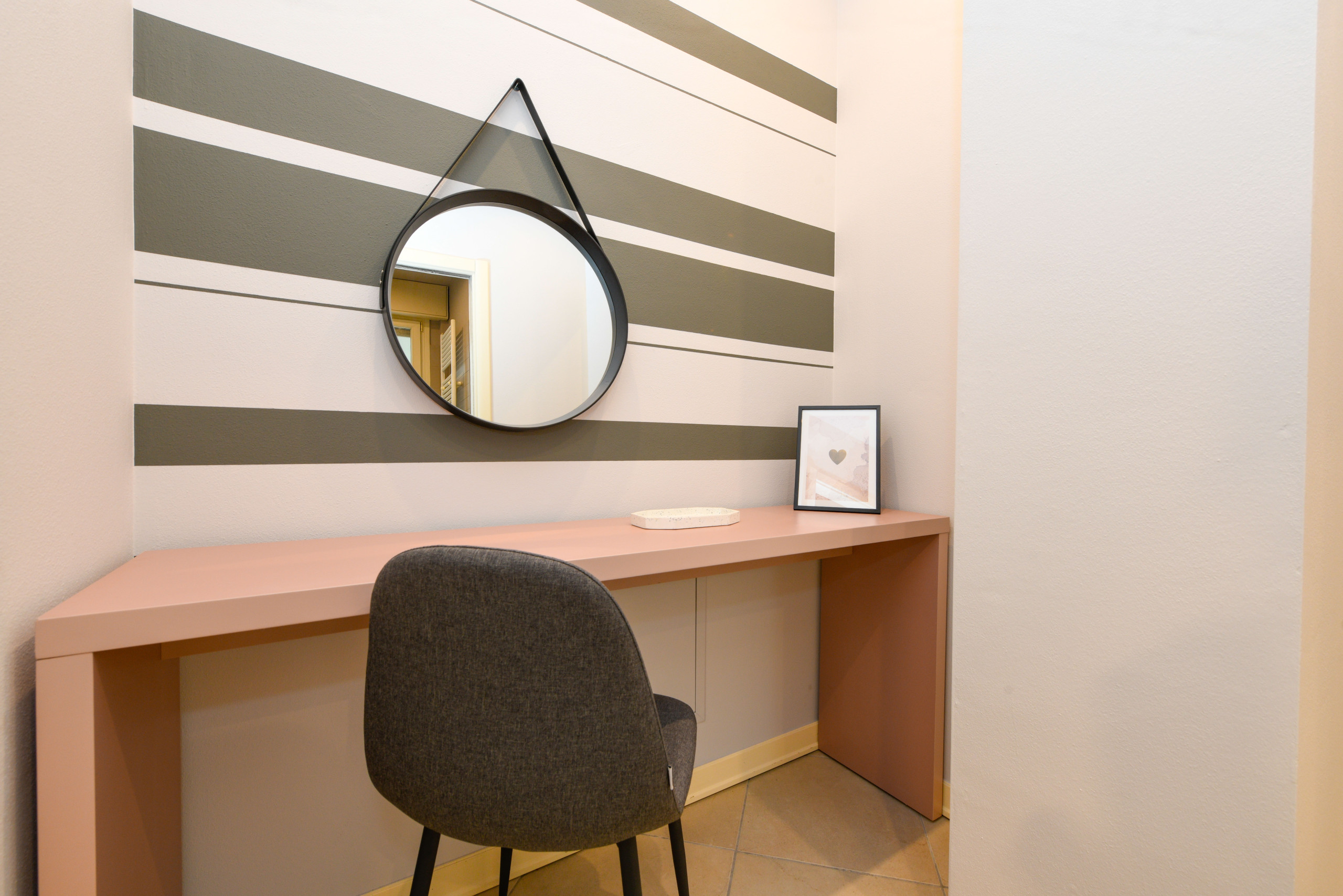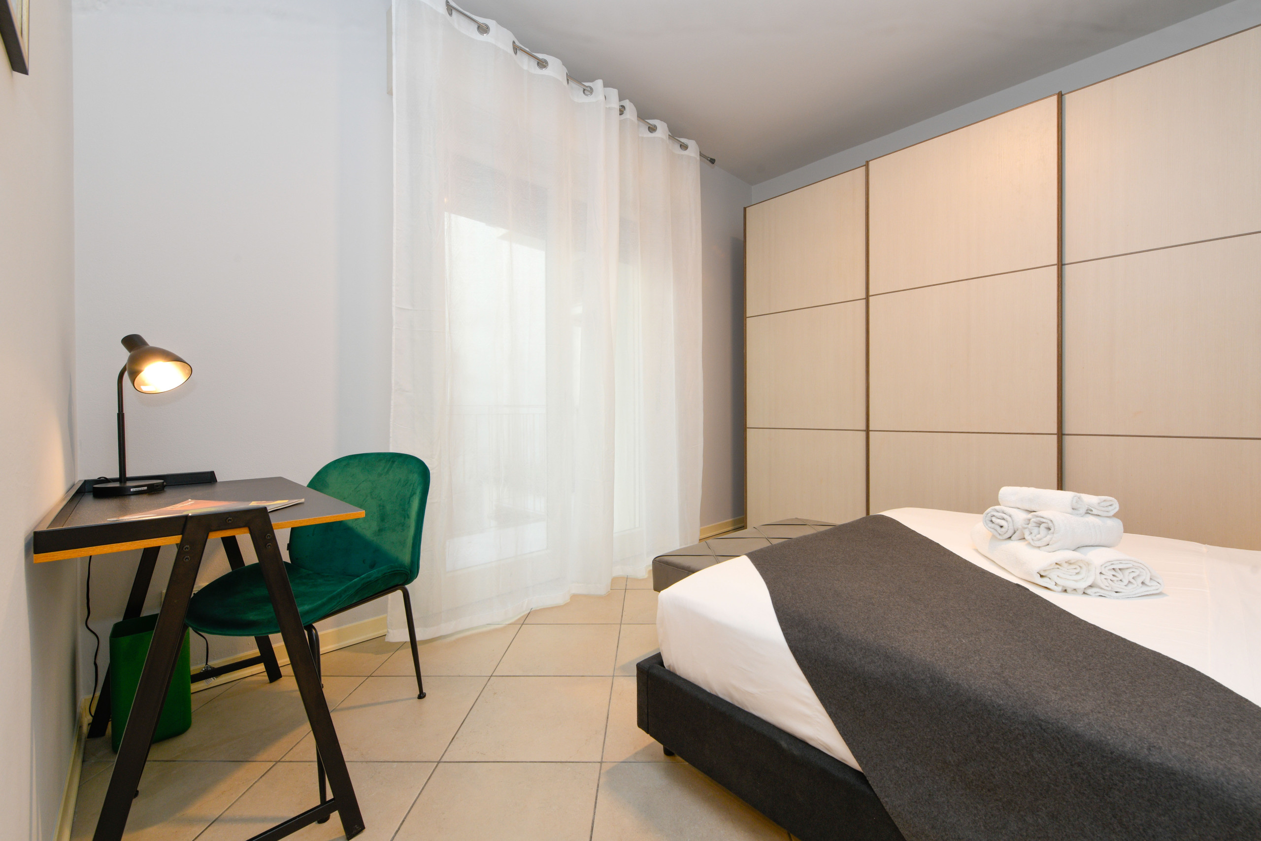 Dwie sypialnie małżeńskie, urządzone z gustem i charakteryzujące się prostymi, ale eleganckimi liniami, dzielą jeden obszerny, umeblowany stolikiem i krzesłami balkon, prawdziwy kącik spokoju, gdzie można delektować się aperitifem o zachodzie słońca lub chwilą spokoju po dniu pełnym wycieczek. Łóżka wyposażone są w miękkie, wysokiej jakości nakładki, gwarantujące głęboki i regenerujący sen, idealny do nabrania energii. Tuż za jedną z sypialni znajduje się praktyczne stanowisko idealne dla osób potrzujących spokojnego kącika do pracy przy komputerze, nauki lub zadbania o siebie.