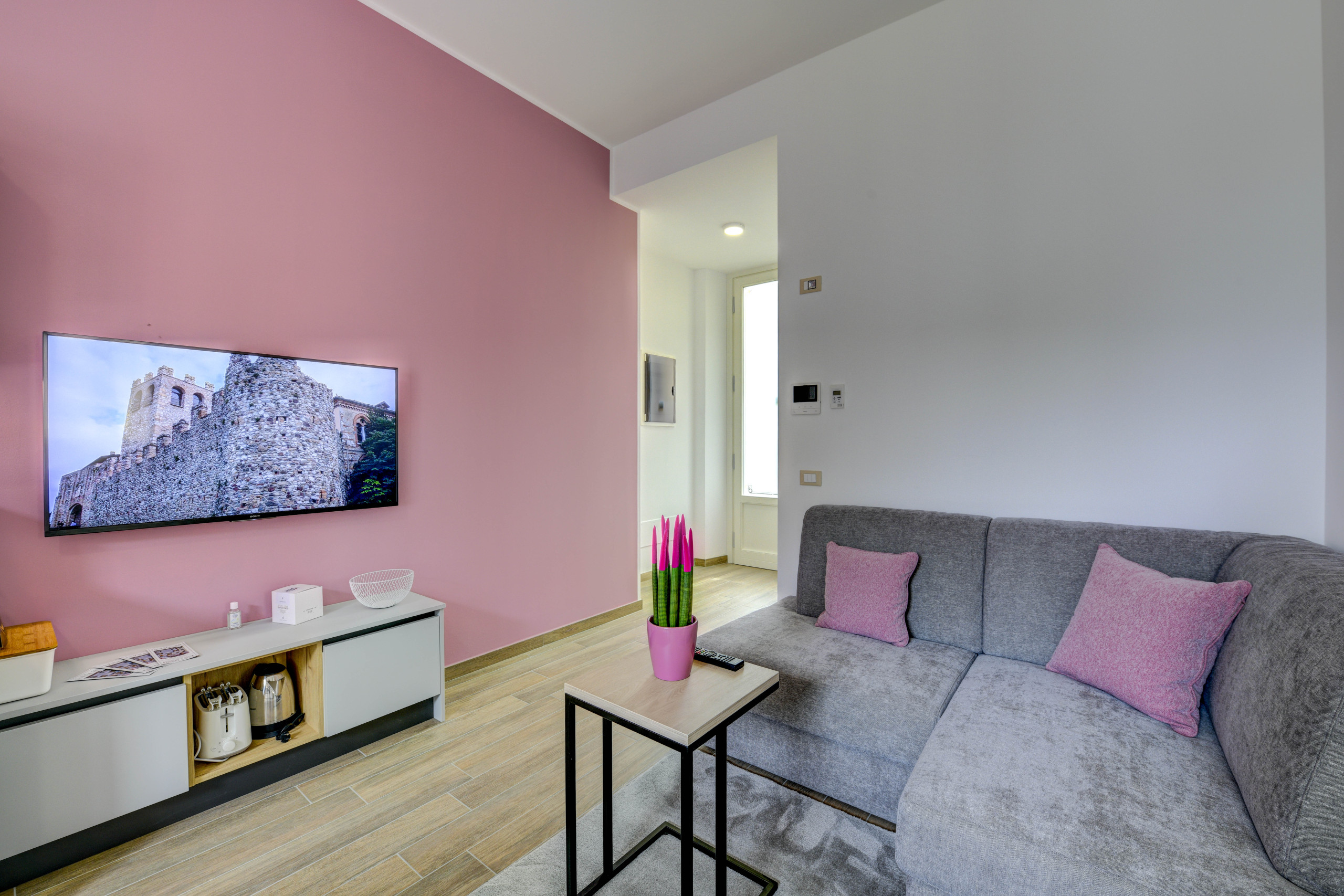 Nowoczesny salon z różową ścianą i kuchnią