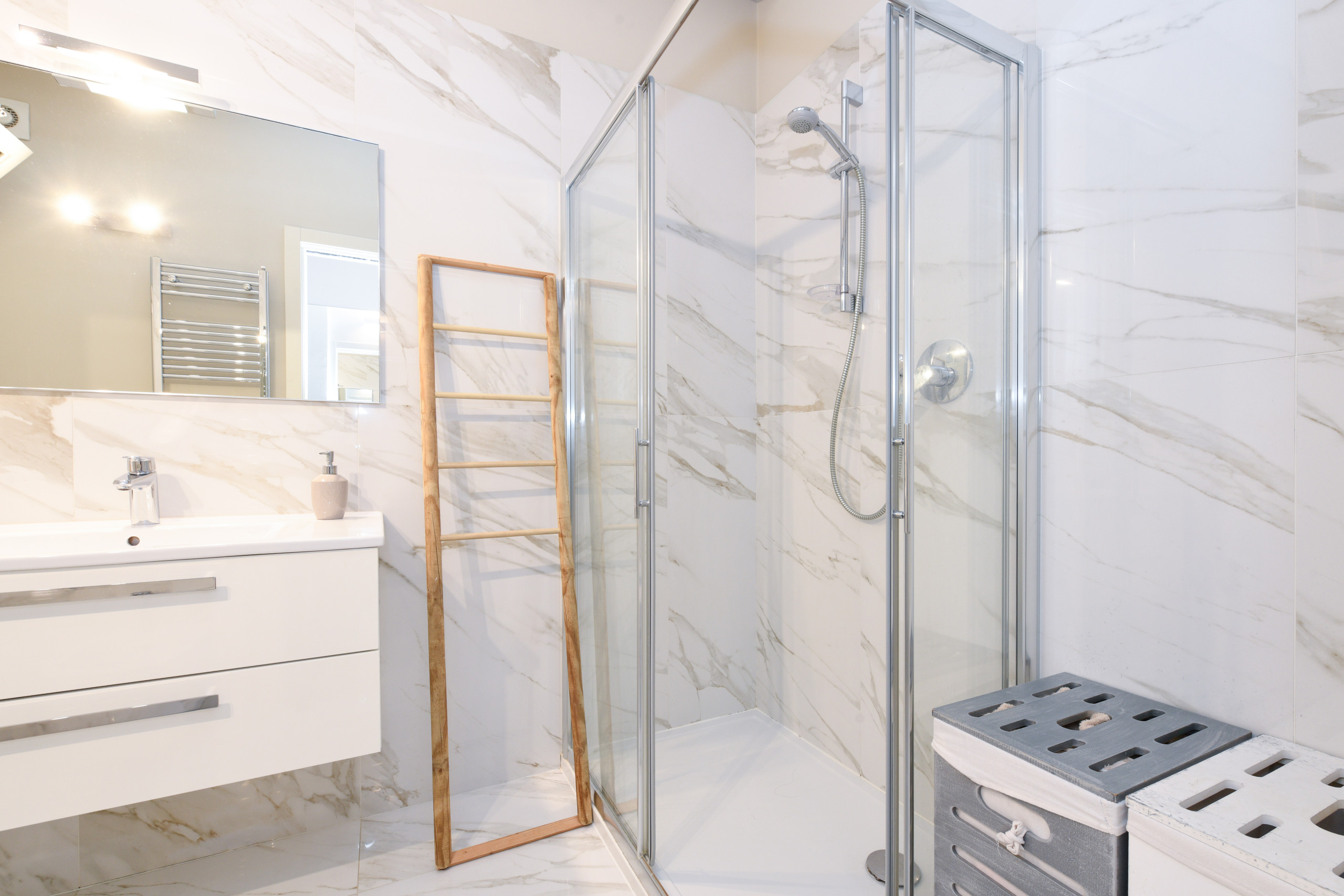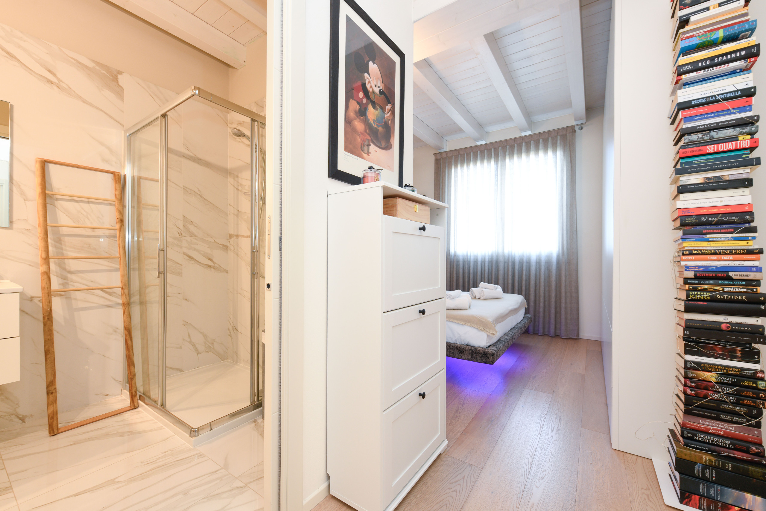 Łazienka, nowoczesna i przestronna, wyposażona jest w dużą prysznicę małżeńską, idealną, aby pozwolić sobie na chwilę relaksu po dniu spędzonym wśród uroków jeziora. Goście znajdą również pralkę, suszarkę do włosów oraz linię kosmetyków wysokiej jakości, aby poczuć się rozpieszczani jak w prywatnym spa.