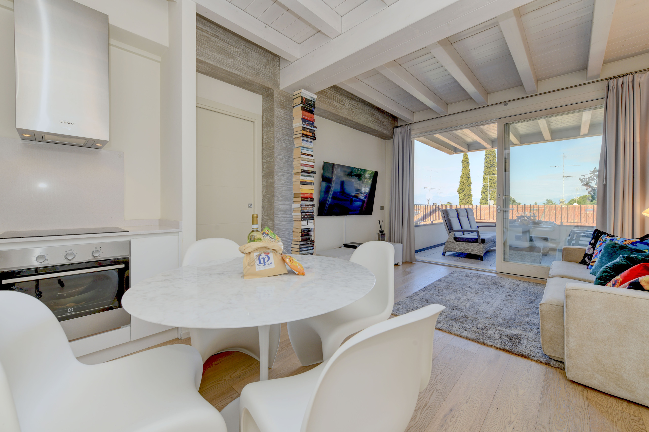 Z przestrzeni dziennej można wyjść na umeblowany balkon, mały zakątek spokoju, gdzie można się rozkoszować bryzą jeziora, wypić poranną kawę lub zrelaksować się z aperitifem o zachodzie słońca. Przestrzeń zewnętrzna oferuje zachwycający widok na Jezioro Garda, idealny dla tych, którzy kochą zanurzyć się w pięknie otaczającego krajobrazu.