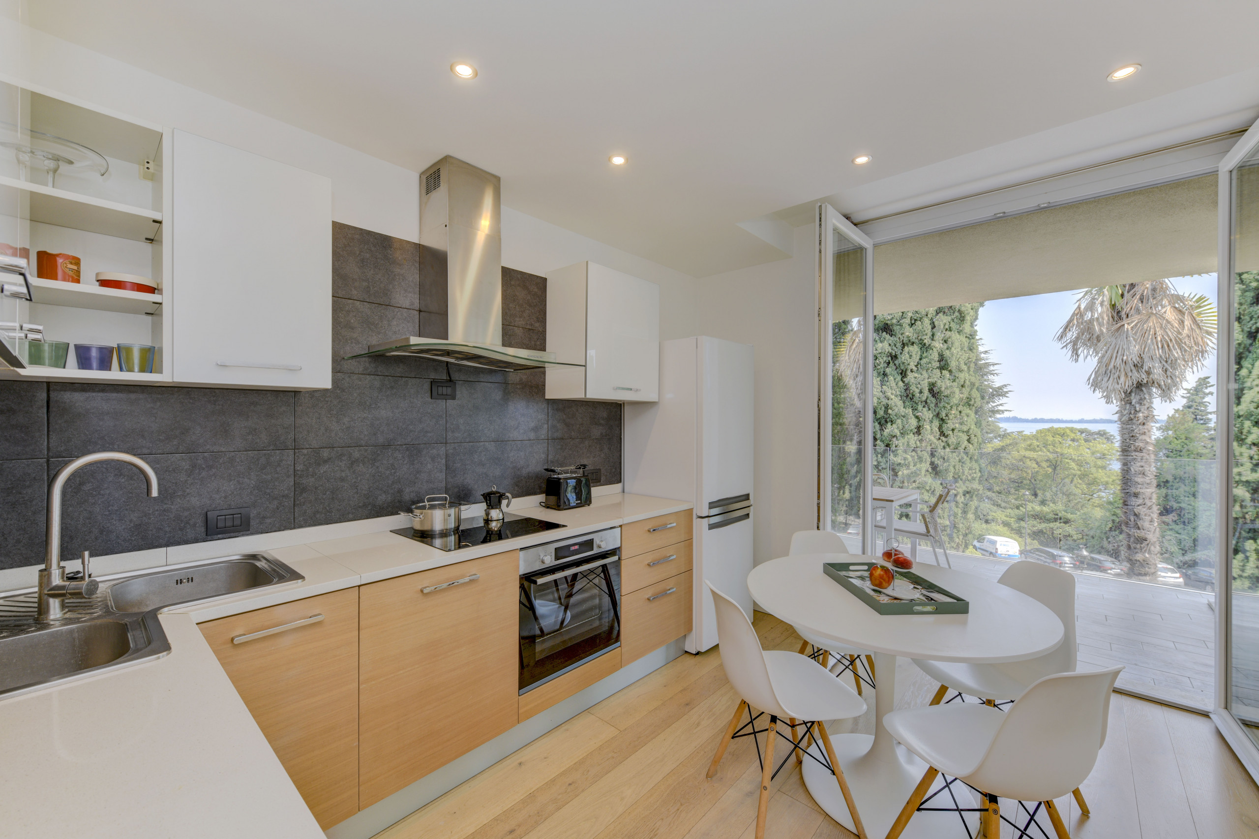 Kuchnia otwarta od płyta indukcyjna, jest wyposażone w chłodziarka, piekarnik, zamrażarka, zmywarka, naczynia/sztućce, przybory kuchenne, ekspres do kawy, opiekacz/toster i czajnik.