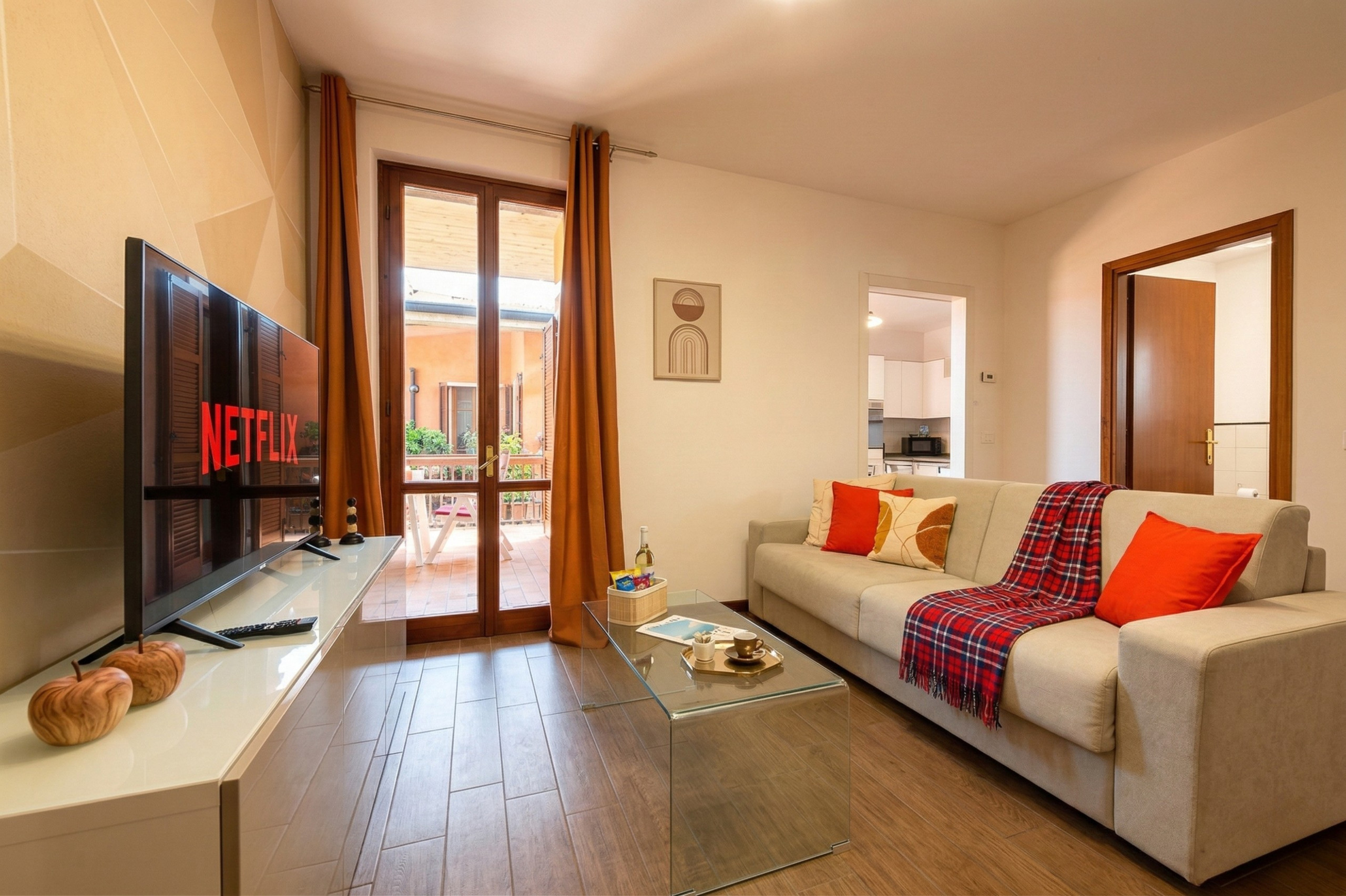 Zaraz po przekroczeniu progu znajdziecie przytulny i jasny salon: superwygodna sofa-łóżko i najnowszej generacji Smart TV czekają na wasze chwile relaksu, czy to wieczory filmowe, czy rozmowy w towarzystwie. Kuchnia, oddzielona, ale zawsze połączona z salonem, jest idealna, by wyrazić waszą kulinarną kreatywność. Znajdziecie ekspres do kawy Nespresso, by obudzić się w najlepszy sposób, tradycyjny piekarnik i mikrofalówkę dla każdej potrzeby, a także zmywarkę i pojemną lodówkę: wszystko, czego trzeba, by poczuć się jak w domu, nawet daleko od domu.