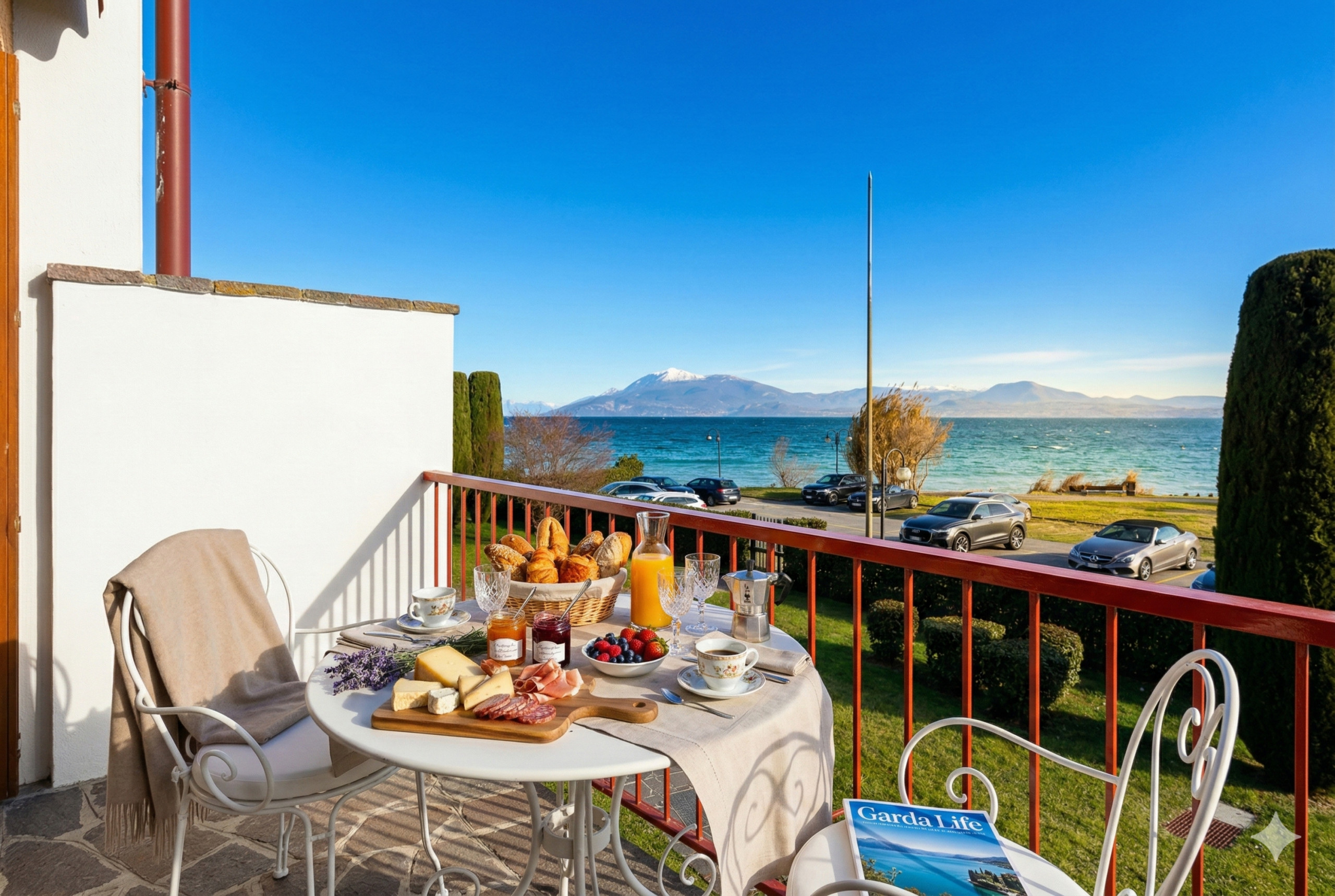 Zanurzony w prestiżowym apartamencie dopracowanym w każdym szczególe, Eden oferuje wyrafinowaną i kameralną atmosferę. Wyjątkowe położenie zapewnia widok 360°: na wschodzie świt rozświetla zatokę i wenecki brzeg, podczas gdy na zachodzie zachody malują niebo romantycznymi odcieniami, które odbijają się w wodzie, zamieniając każdą chwilę dnia w żywy obraz. Po krótkiej serii 12 schodów, wejście otwiera się na scenograficzny salon, gdzie duże okna wychodzące na jezioro tworzą wrażenie, jakby się było wewnątrz naturalnego filmu, gdzie Garda jest absolutnym bohaterem. Przestrzeń jest obszerna, jasna i klimatyzowana; wygodna sofa-łóżko zaprasza do relaksu, elegancki stół jadalny jest ustawiony, aby cieszyć się widokiem podczas każdego posiłku, a inteligentny telewizor 55" towarzyszy spokojniejszym wieczorem. Z salonu można wyjść na wyposażony balkon, idealny na śniadanie z jeziorem u stóp lub aperitif o zachodzie słońca.