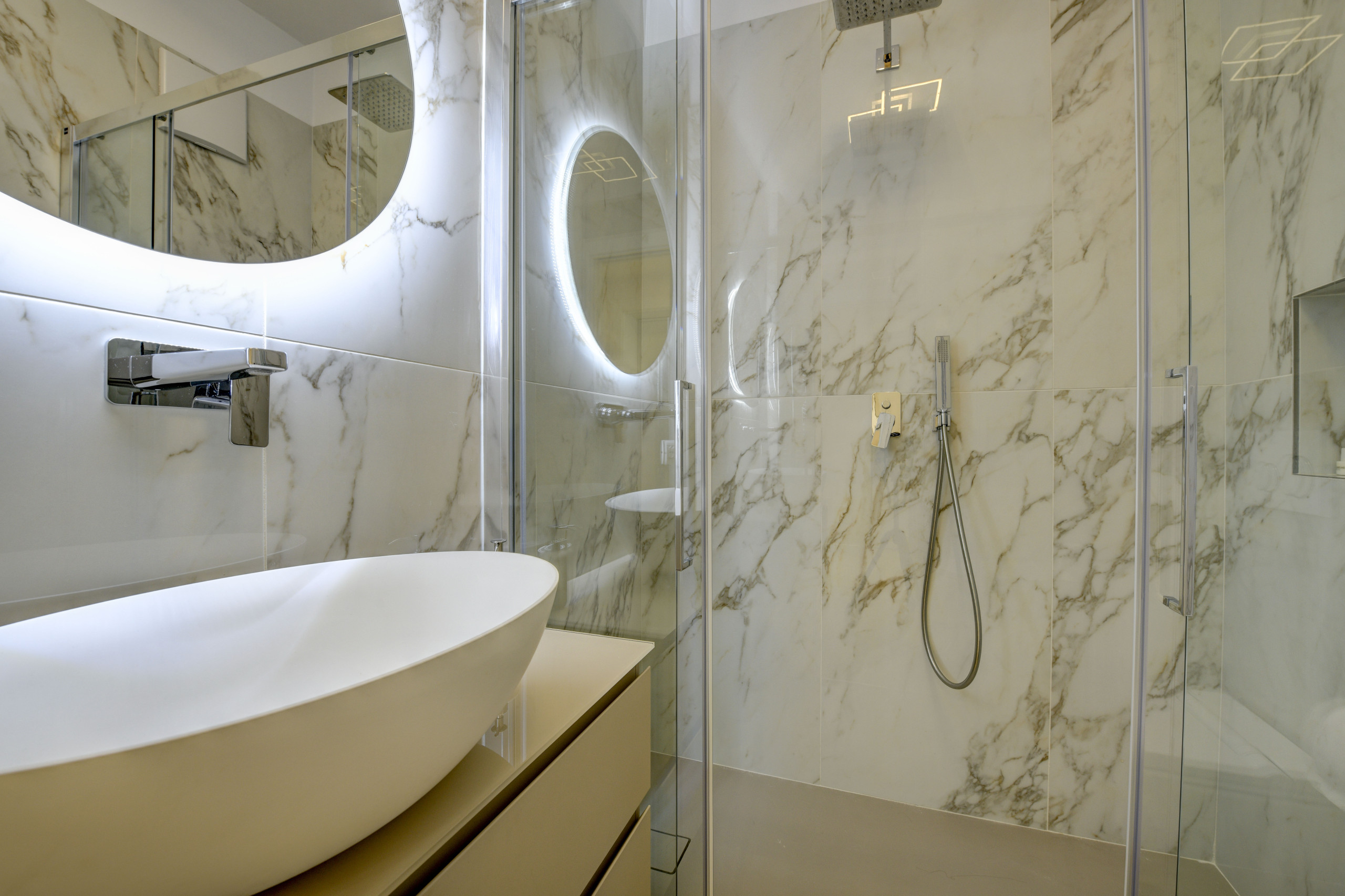 Między tymi dwiema sypialniami znajduje się nowoczesna, przestronna łazienka wyposażona we wszystkie udogodnienia. Wyrafinowany design łączy się z funkcjonalnością ogromnej kabiny prysznicowej, idealnej do relaksu po dniu wycieczek lub zakupów. Łazienka jest również wyposażona w WC, przestronną umywalkę i schowek, gwarantujący porządek i praktyczność przez cały pobyt.