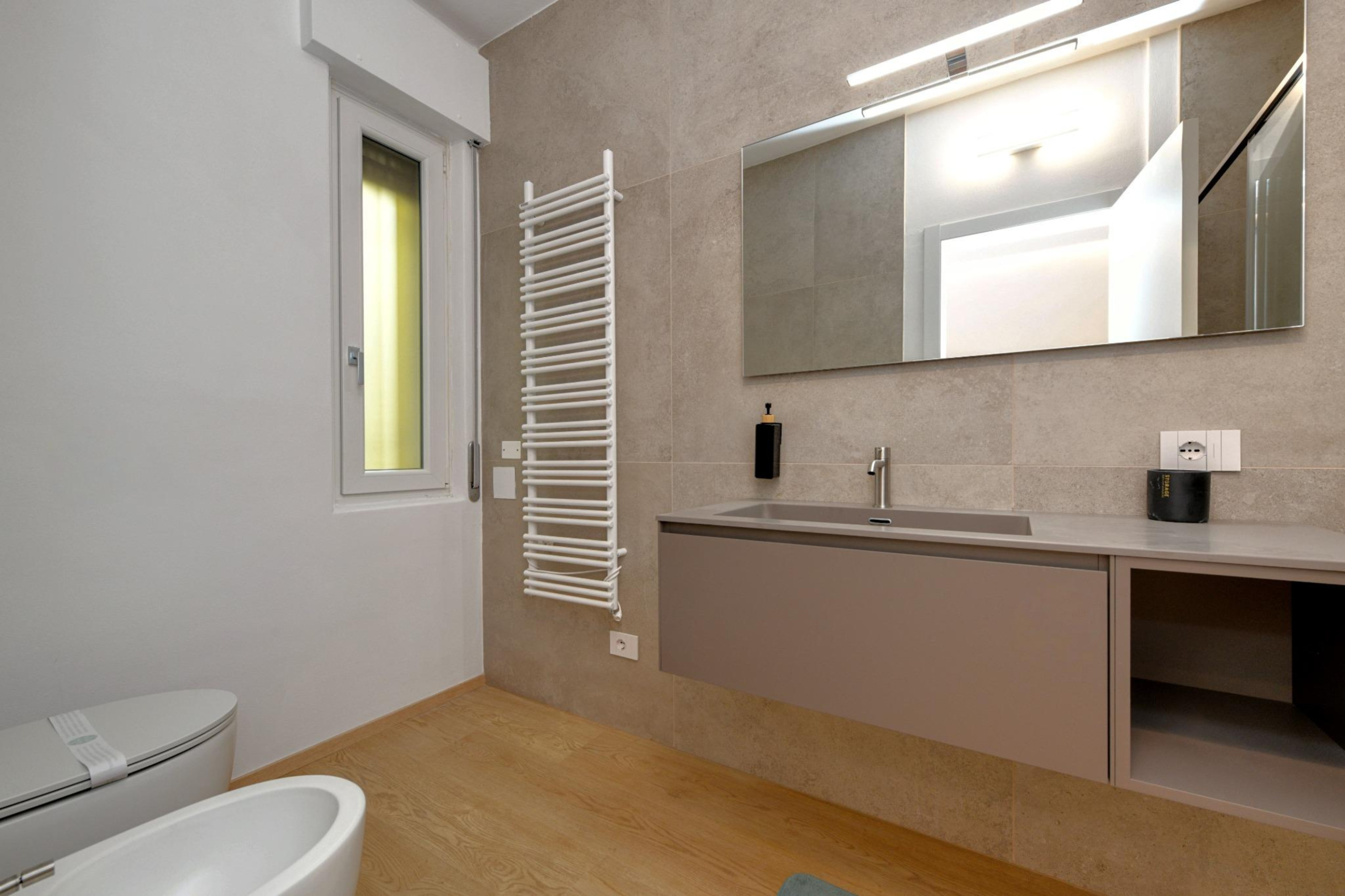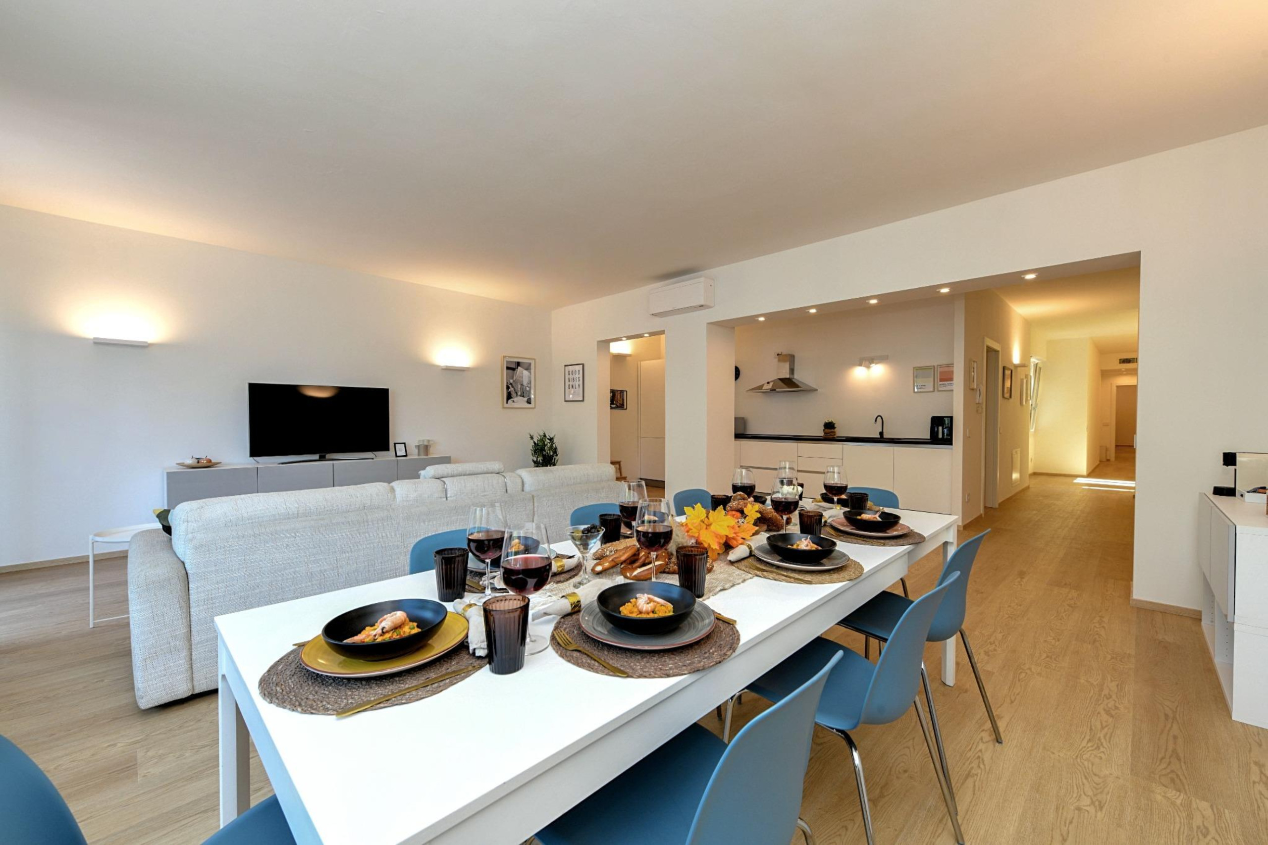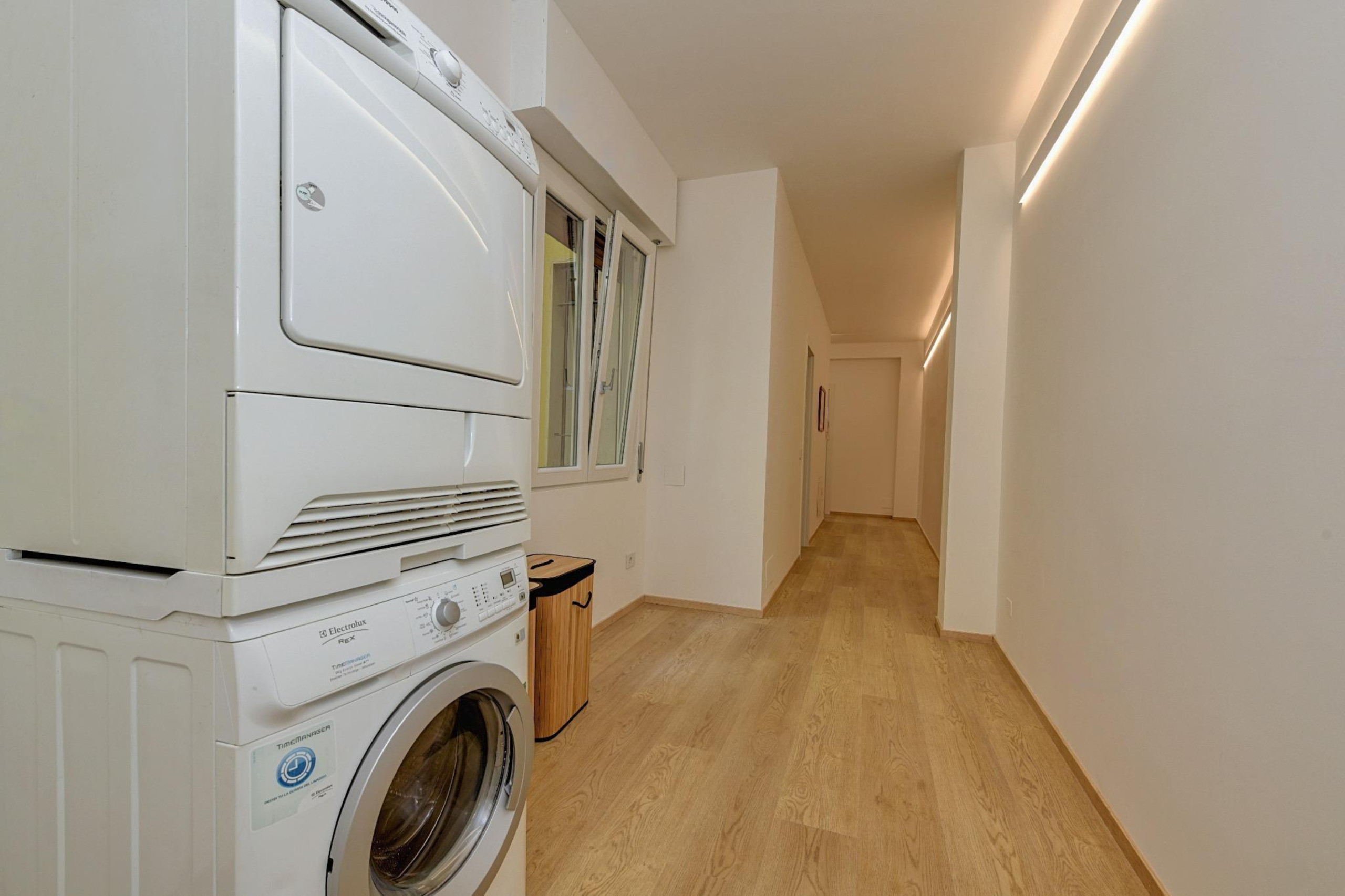 Trzy w pełni wyposażone, nowoczesne i funkcjonalne łazienki urządzone są z prostym smakiem i wyposażone w wygodne prysznice walk-in. Pralka i suszarka są do dyspozycji, aby każdy pobyt był jeszcze bardziej praktyczny, zwłaszcza podczas długich pobytów, dla dużych rodzin lub grup przyjaciół. Nowoczesna kuchnia indukcyjna, w pełni wyposażona, oferuje wszystko, co niezbędne, aby poczuć się naprawdę jak w domu i przeżyć każdy posiłek jako moment wspólnoty.